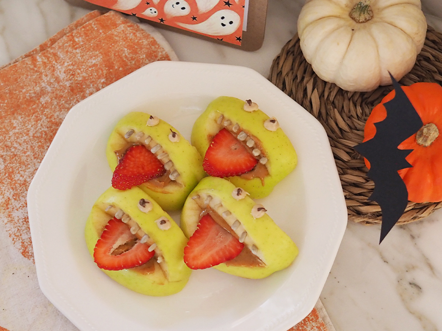 - Tagliamo le fragole a fettine sottili e ne adagiamo una sul burro di arachidi di ogni mela, per creare la lingua.