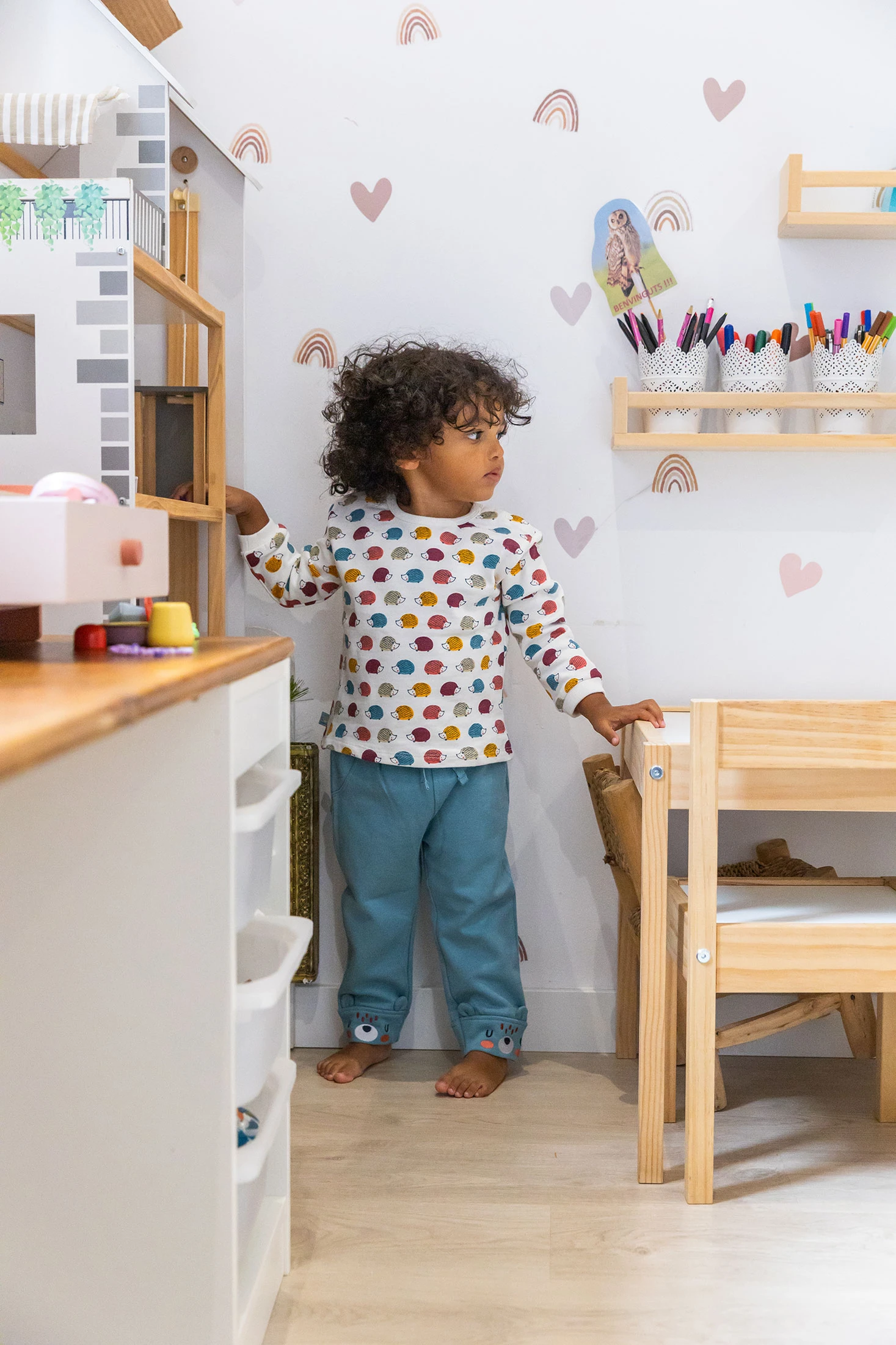 Conjunt de punt per a nadó nen que ofereix una elecció càlida i estilosa, ideal per a les temporades més fredes. La part superior del conjunt es destaca amb un disseny d'animals en tons vibrants, mentre que els pantalons blaus presenten encantadors detalls de cara d'os a les cames. Fabricat en un teixit suau i acollidor, garanteix comoditat durant tot el dia. Disponible en talles d'1 mes a 2 anys, assegura un ajust perfecte per a cada etapa de creixement del nadó. Perfecte per combinar amb jaquetes i capells, ofereix una solució pràctica i encantadora per