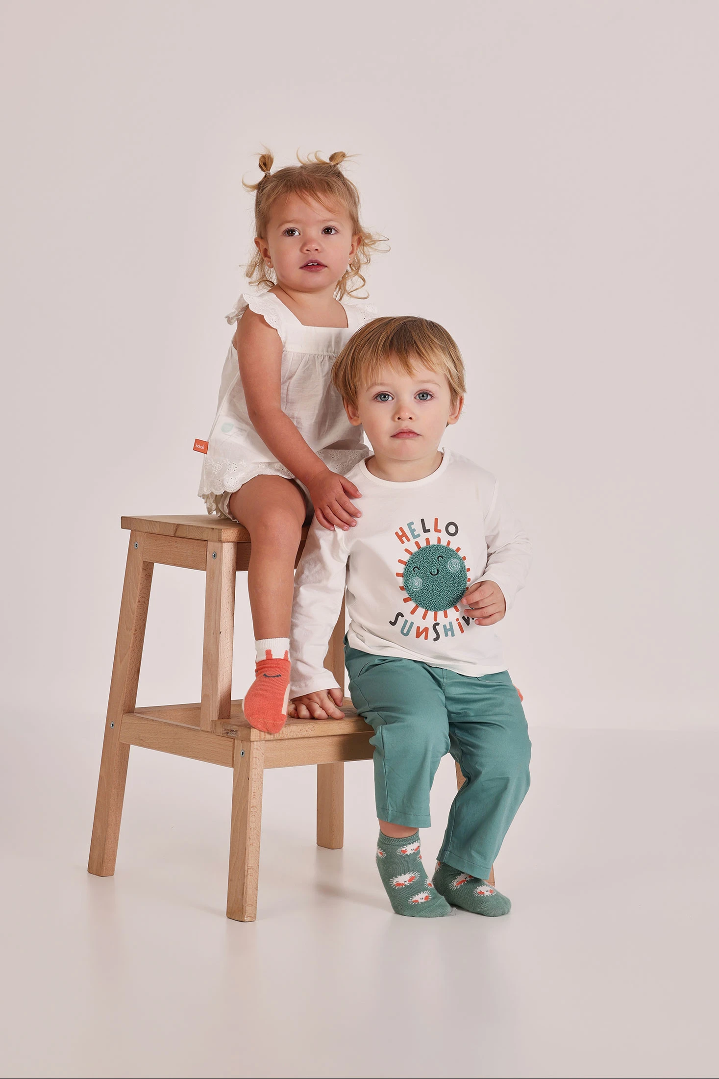 Conjunt de samarreta i pantalons per a nadó ideal per als més petits. Disponible en talles des d'1 mes fins a 24 mesos, està confeccionat en suau cotó blanc. La samarreta té un disseny d'un sol somrient en to blau verdós i taronges, acompanyat del text "Hello Sunshine", brindant un toc alegre i vibrant. Les mànigues llargues proporcionen calidesa, mentre els pantalons verds afegeixen un contrast encantador i modern. Perfecte per a qualsevol ocasió, aquest conjunt combina estil i comoditat per a l'ús diari.