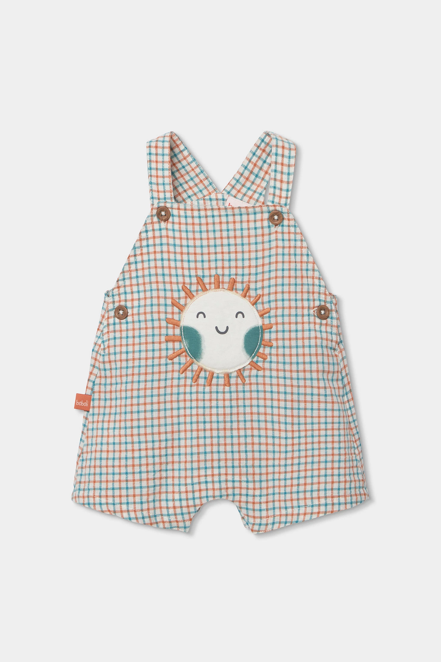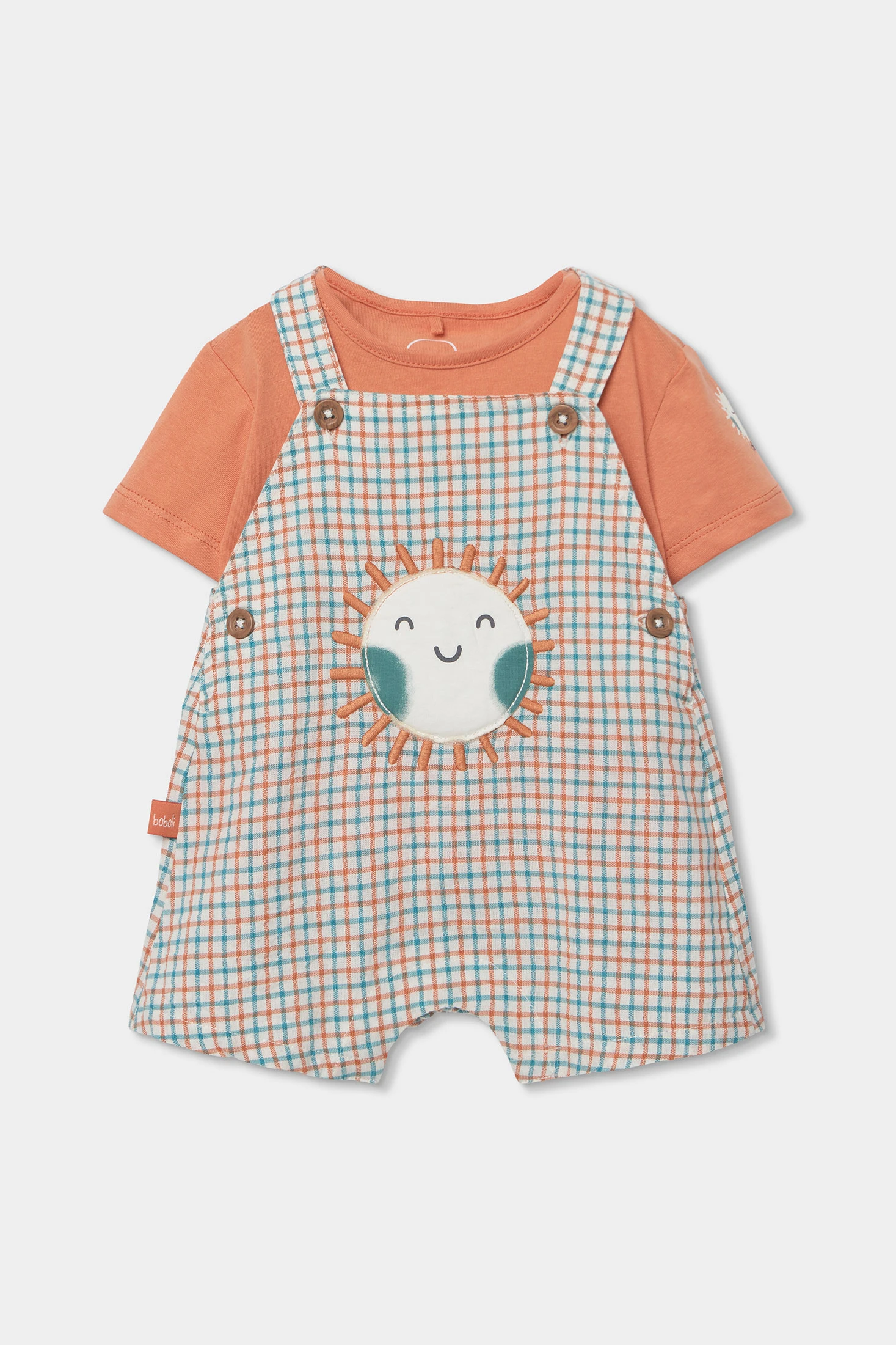 Confeccionat en cotó suau, el conjunt per a nadó presenta un disseny de quadres, perfecte per a un look casual i alegre. Un divertit sol somrient adorna la part davantera, afegint un toc d'encant. Inclou una samarreta de color terracota amb mànigues curtes que complementa el conjunt. Les talles van des d'1 mes fins a 24 mesos, adaptant-se al creixement del nadó. Versàtil i còmode, és ideal per a l'ús diari.
