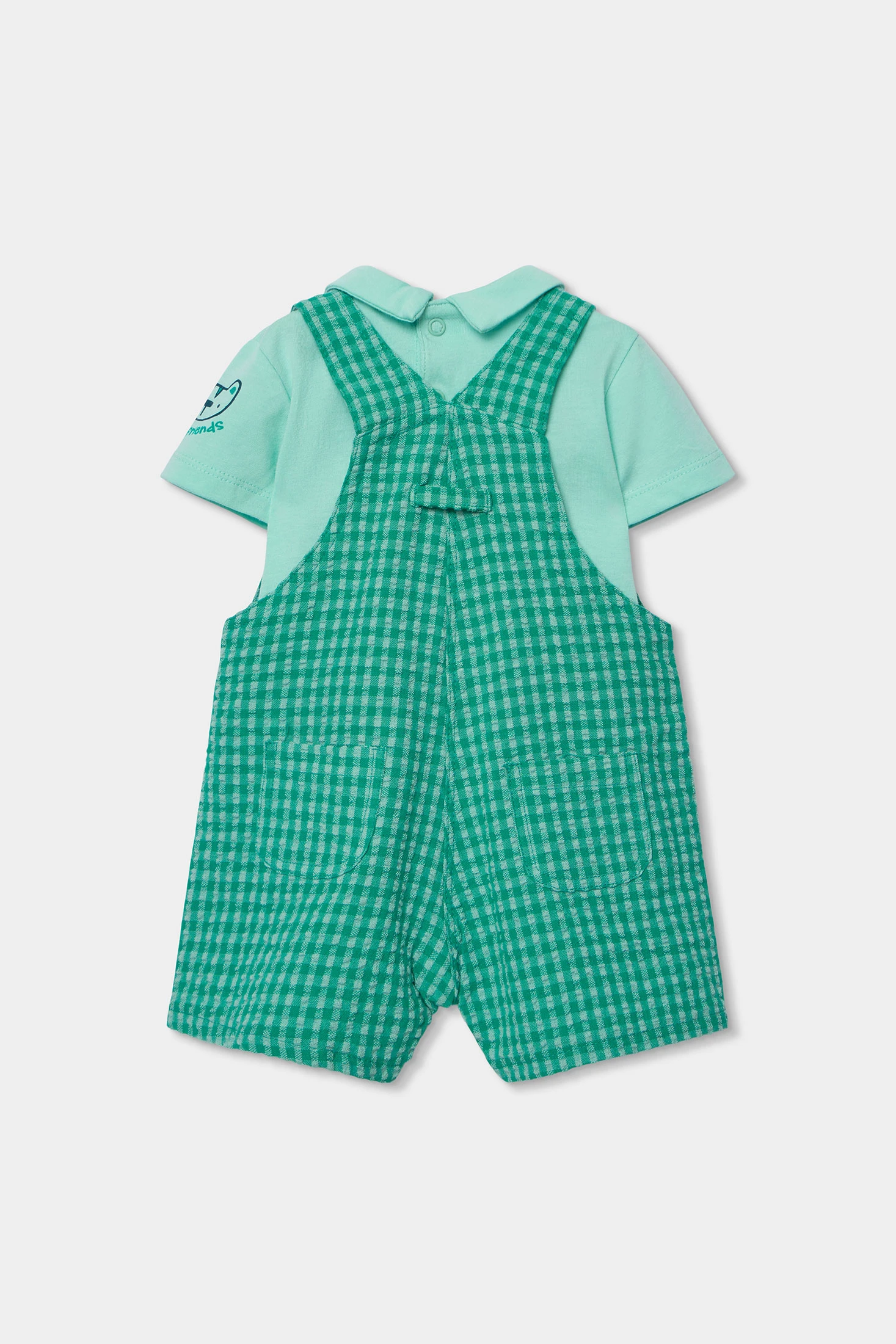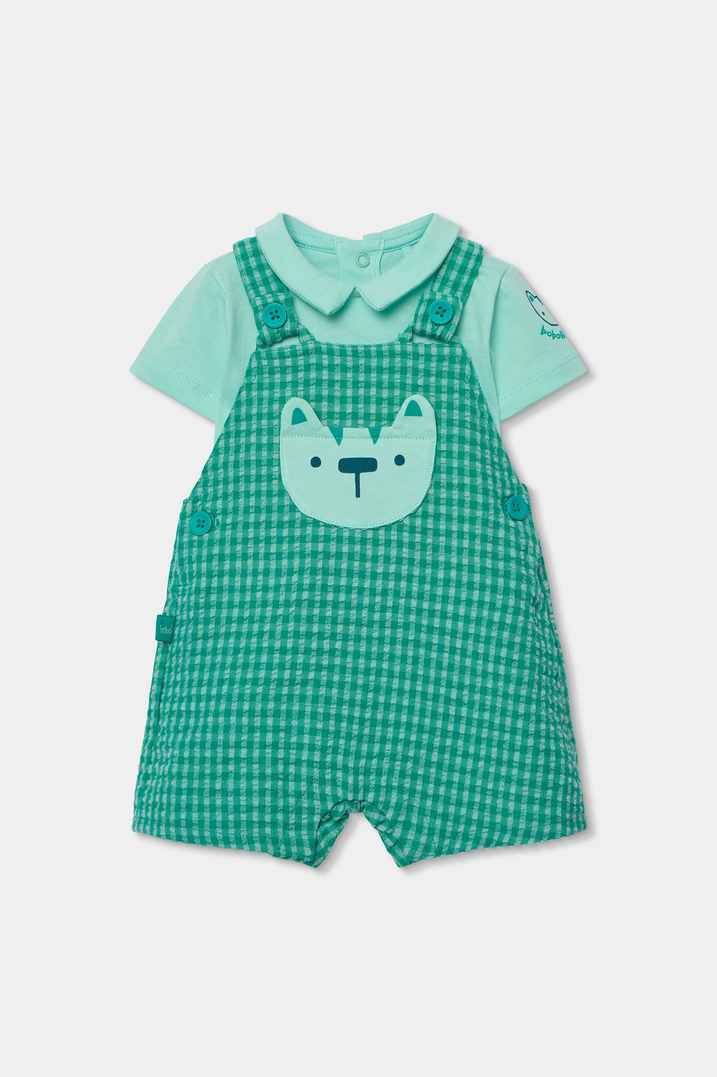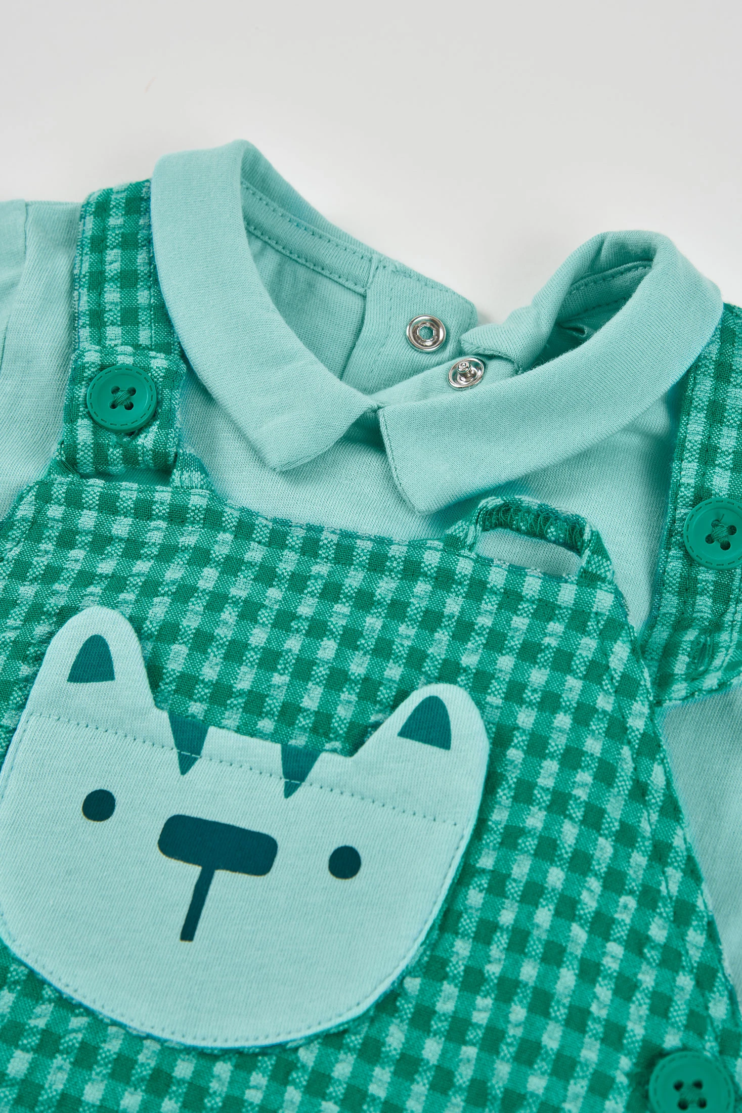 Conjunt pitet de cotó per a nadó amb disseny a quadres en tons verds, ideal per als més petits. El pitet inclou un divertit dibuix d'animal al pit, aportant un toc divertit al conjunt. El seu teixit de cotó és suau i confortable, perfecte per a la pell delicada del nadó. Disponible en talles des d'1 mes fins a 24 mesos, s'adapta al creixement. Els tirants amb botons faciliten l'ajust, i la samarreta integrada afegeix practicitat. Conjunt còmode i estilitzat per al dia a dia del teu nadó.