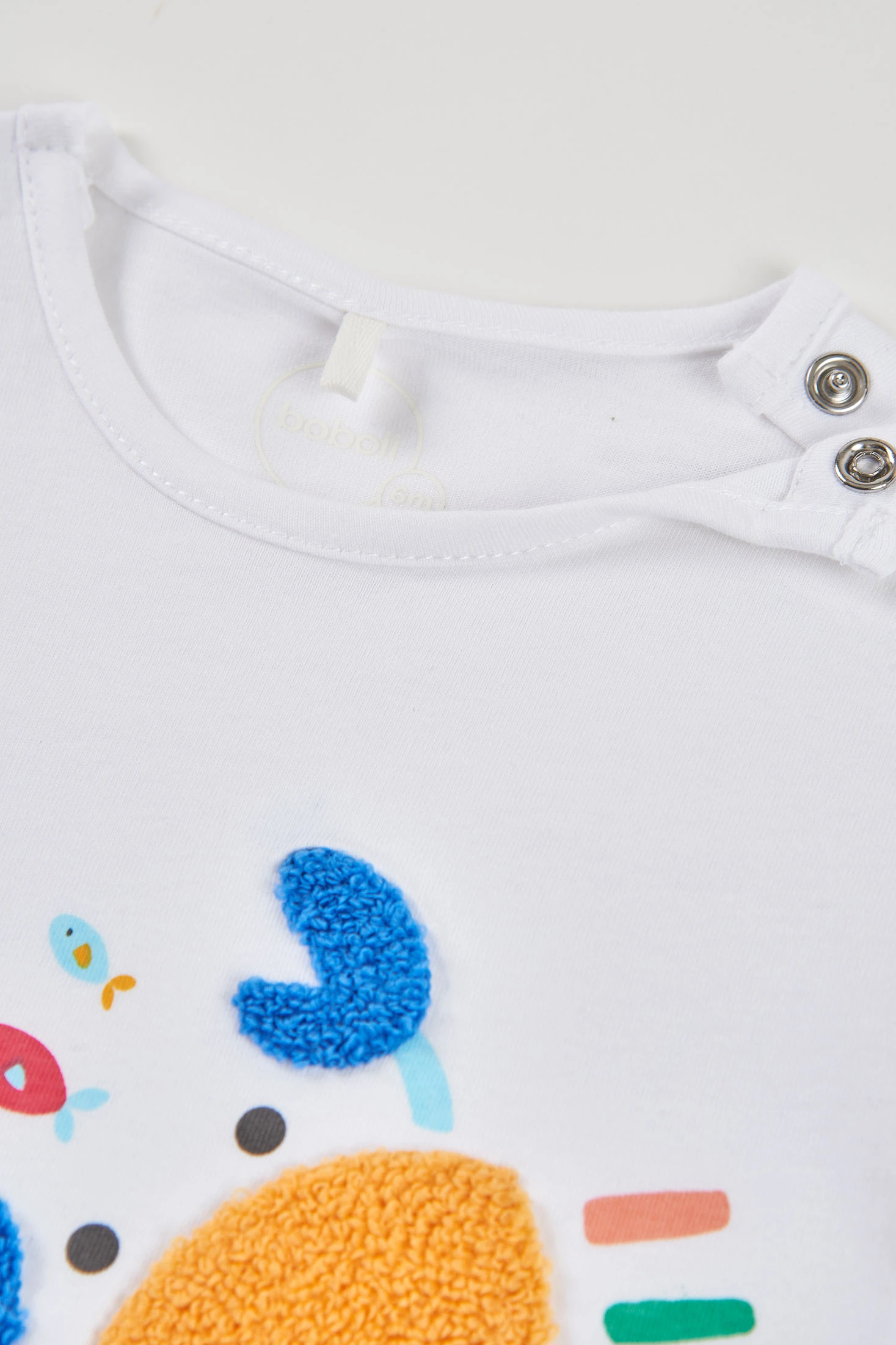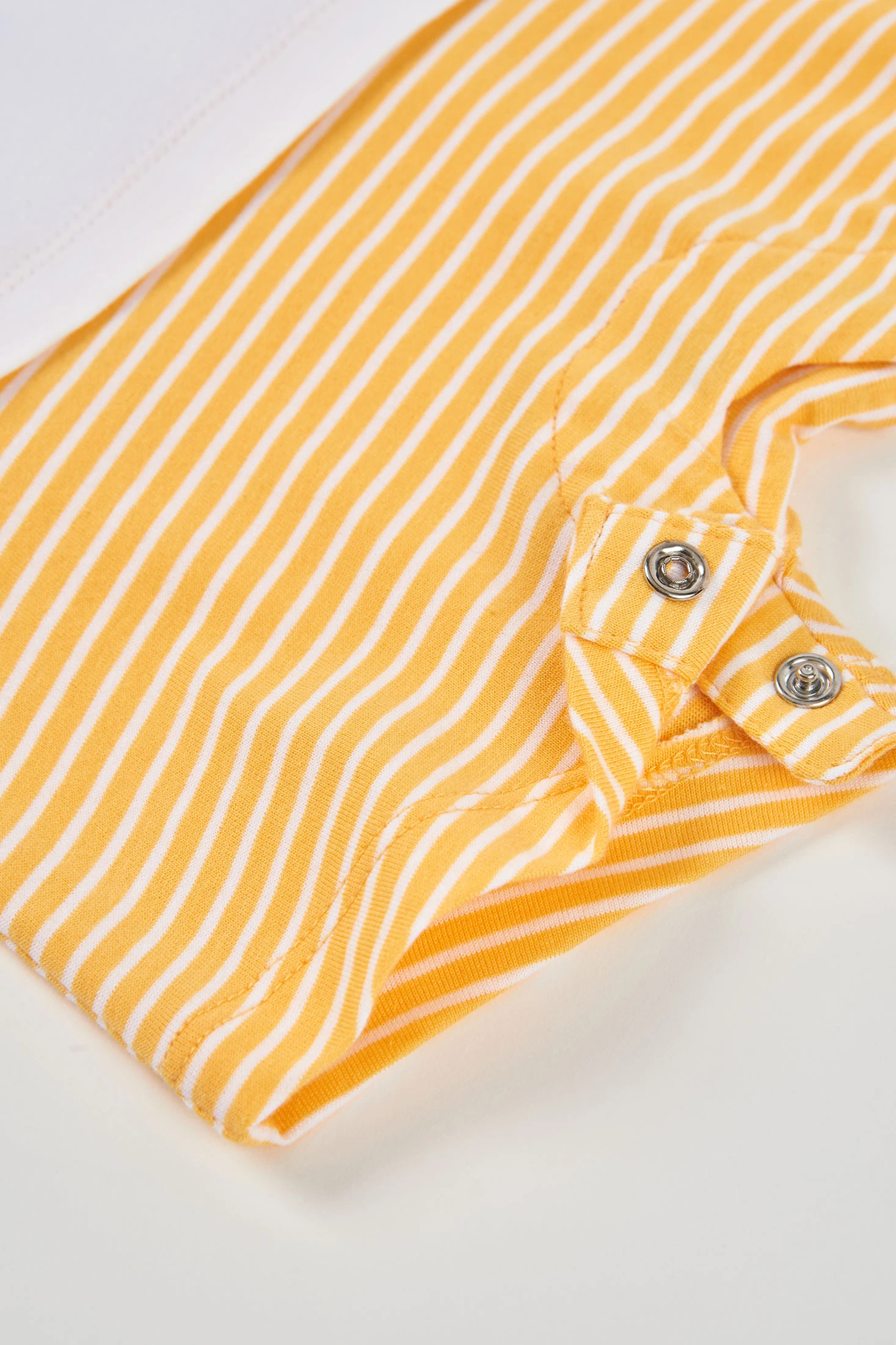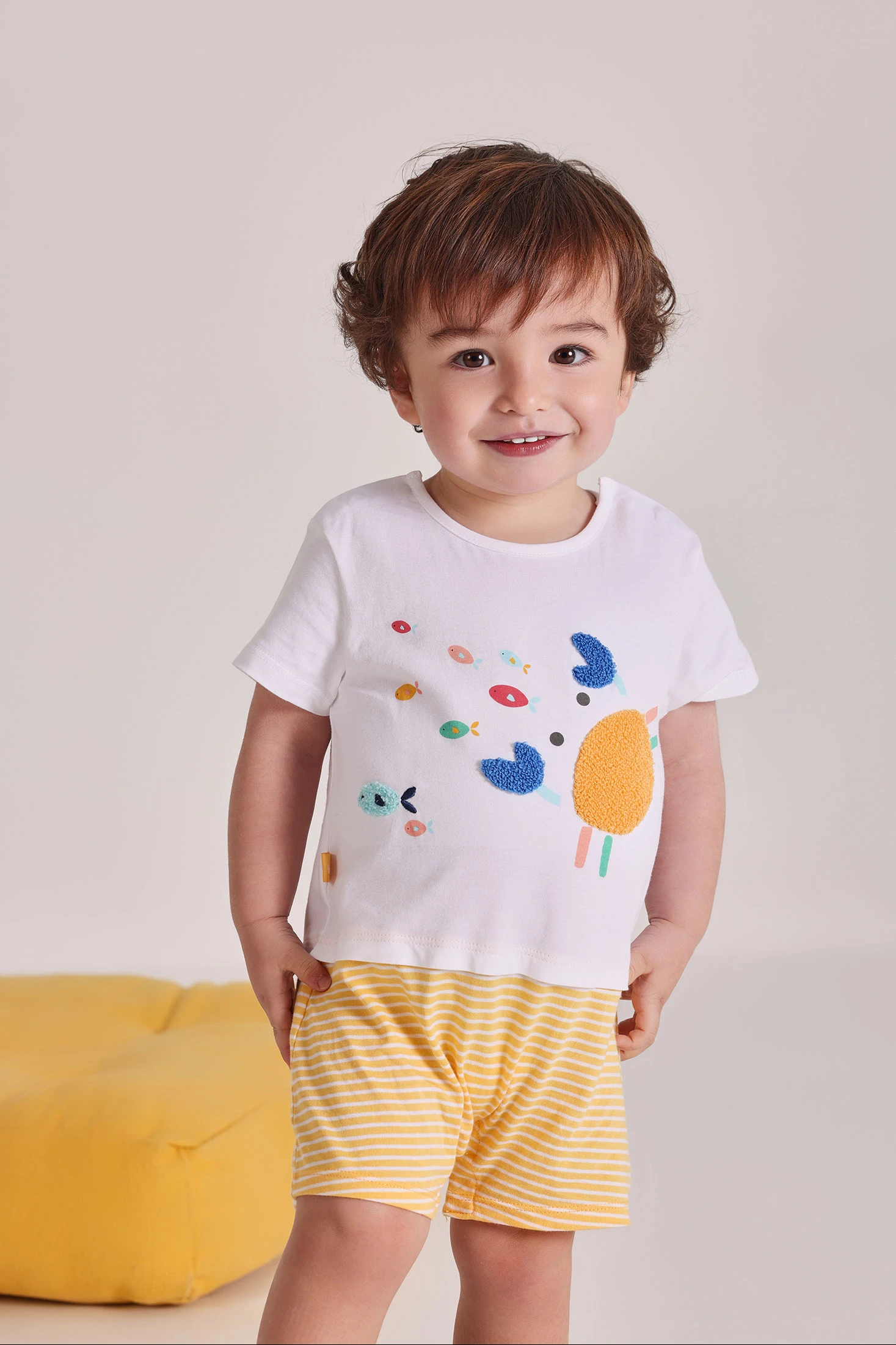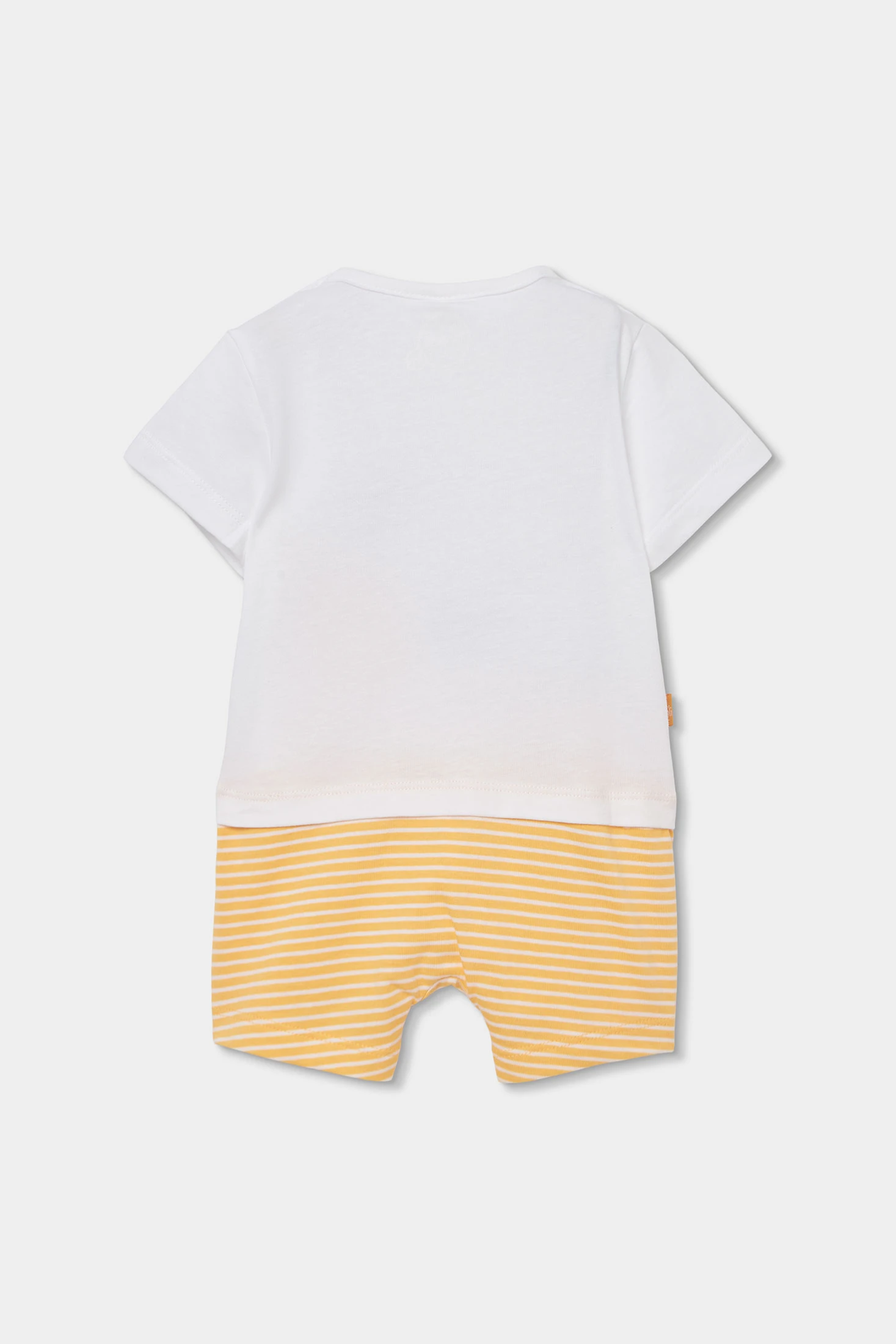 Pijama de punt en cotó efecte doble peça perfecte per a nounats. Disponible en talles des de 0 mesos fins a 24 mesos, assegurant comoditat a mesura que el nadó creix. El disseny presenta un divertit estampat d'animalets en colors vibrants a la part de dalt, ideal per cridar l'atenció del petit. El seu coll rodó facilita la seva posada i retirada, i les mànigues curtes el fan adequat per a climes càlids. La part inferior té ratlles grogues i blanques, afegint un detall alegre. És una opció suau i còmoda per al dia a dia del