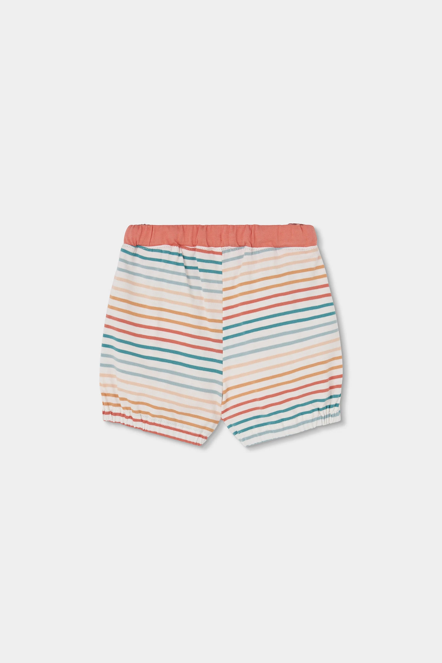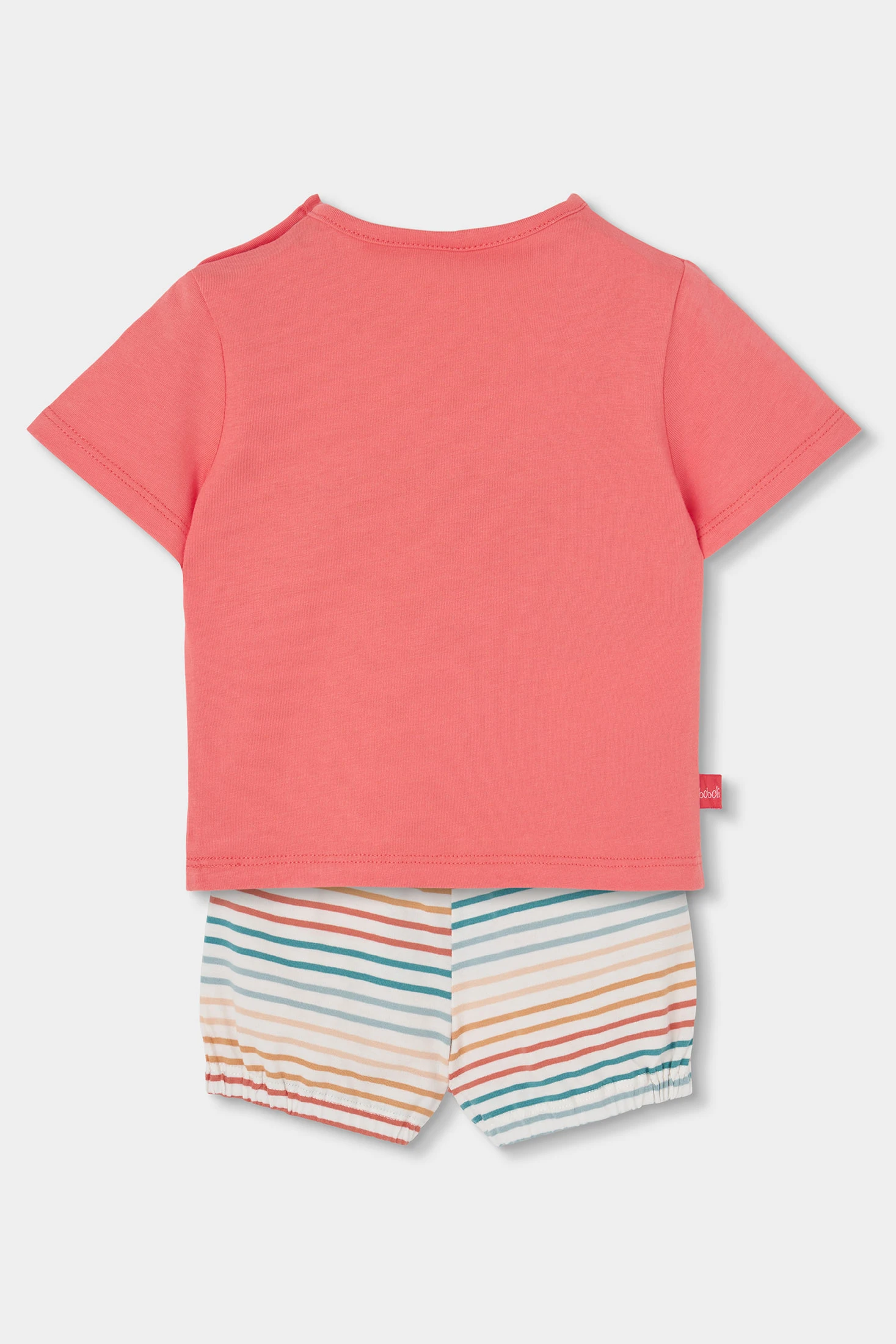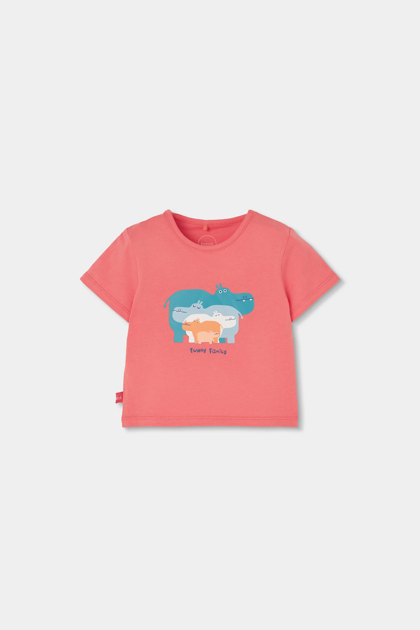 Samarreta de cotó per a nadó nen de color taronja. Suau i còmoda, és ideal per a la delicada pell dels més petits. Presenta un disseny amb dibuixos d'animals que aporta un toc divertit. Perfecta per a l'ús diari, està disponible en talles des d'1 mes fins a 24 mesos. El seu coll rodó facilita vestir el nadó. Combina bé amb bermudes de ratlles de colors clars, oferint un estil alegre i acollidor per als dies casuals.