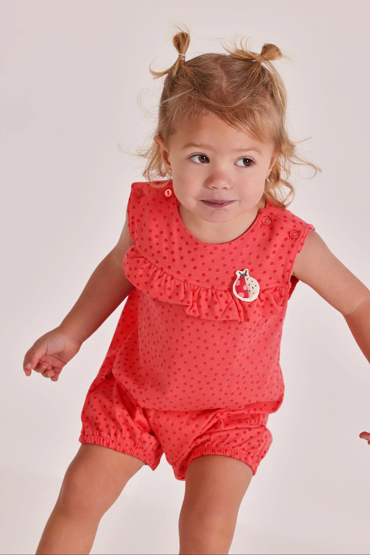 Pijama de cotó per a nadó nena que presenta un disseny alegre en color rogenc amb estampat de topos. El material és suau i còmode, ideal per a la delicada pell del nadó. Inclou un volant decoratiu al pit i un petit motiu decoratiu de marieta al lateral. Funcional amb botons al les espatlles, facilitant el canvi. Disponible en talles de 0 mesos fins als 24 mesos, adaptant-se al creixement del nadó.