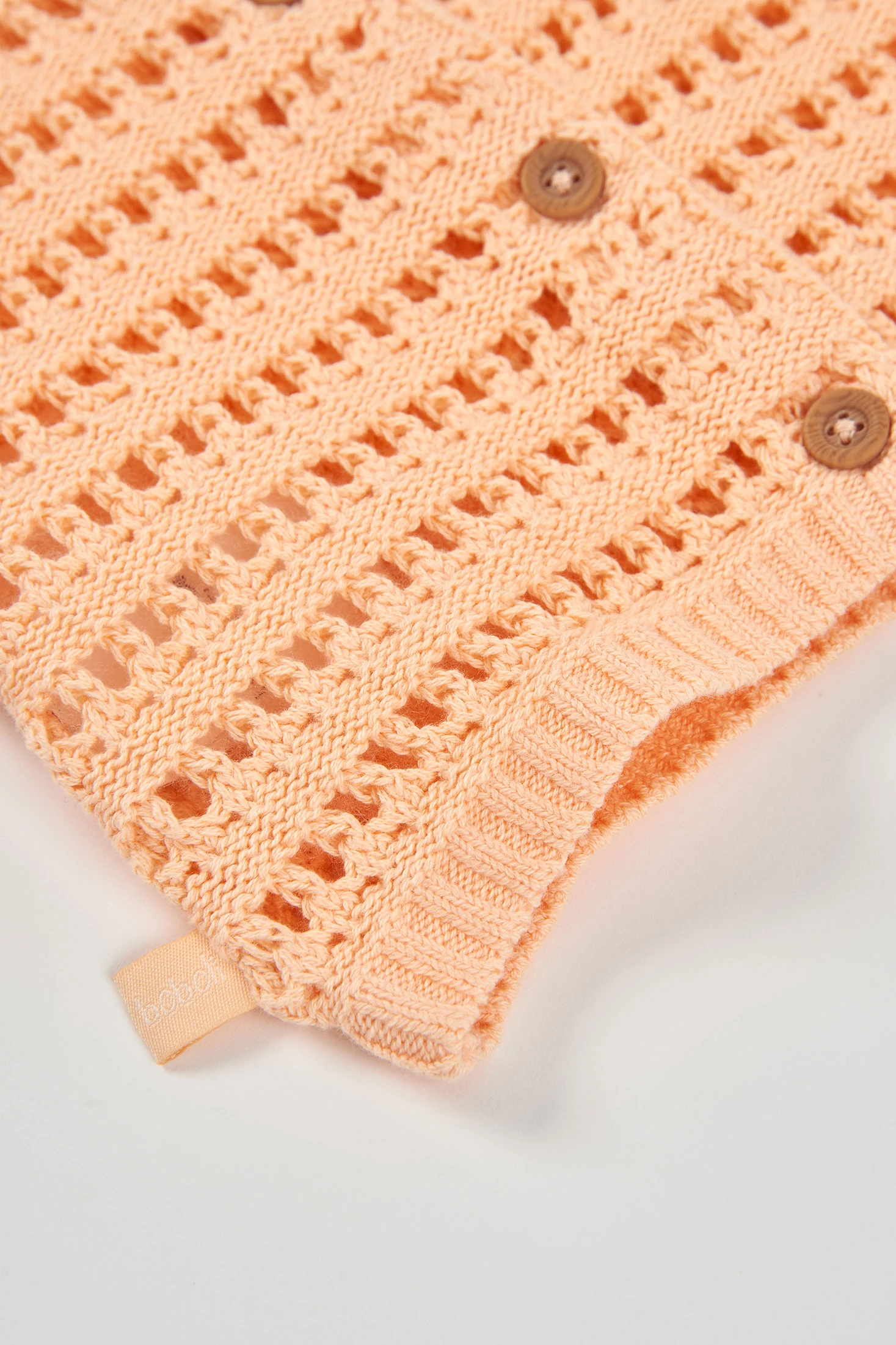 Jaqueta de punt en color taronja clar per a nadó nena, ideal per mantenir la teva petita abrigada en dies frescos. El seu disseny presenta un teixit calat que li afegeix un toc elegant i distintiu, mentre que el tancament amb botons facilita la seva col·locació. Confeccionada en un material suau i càlid, és perfecta per a la comoditat diària. Disponible en talles des de 1 mes fins a 24 mesos, és adequada per a diferents etapes de creixement. Aquesta peça combina fàcilment amb altres atuendos, oferint un estil clàssic i versàtil per al