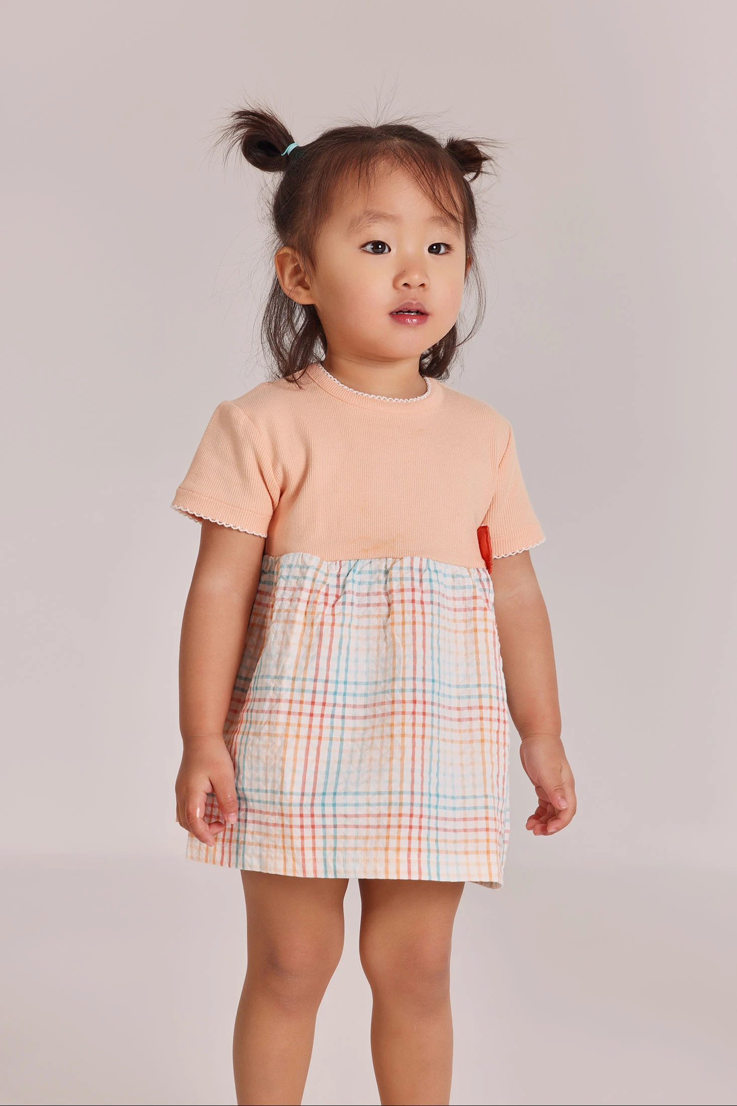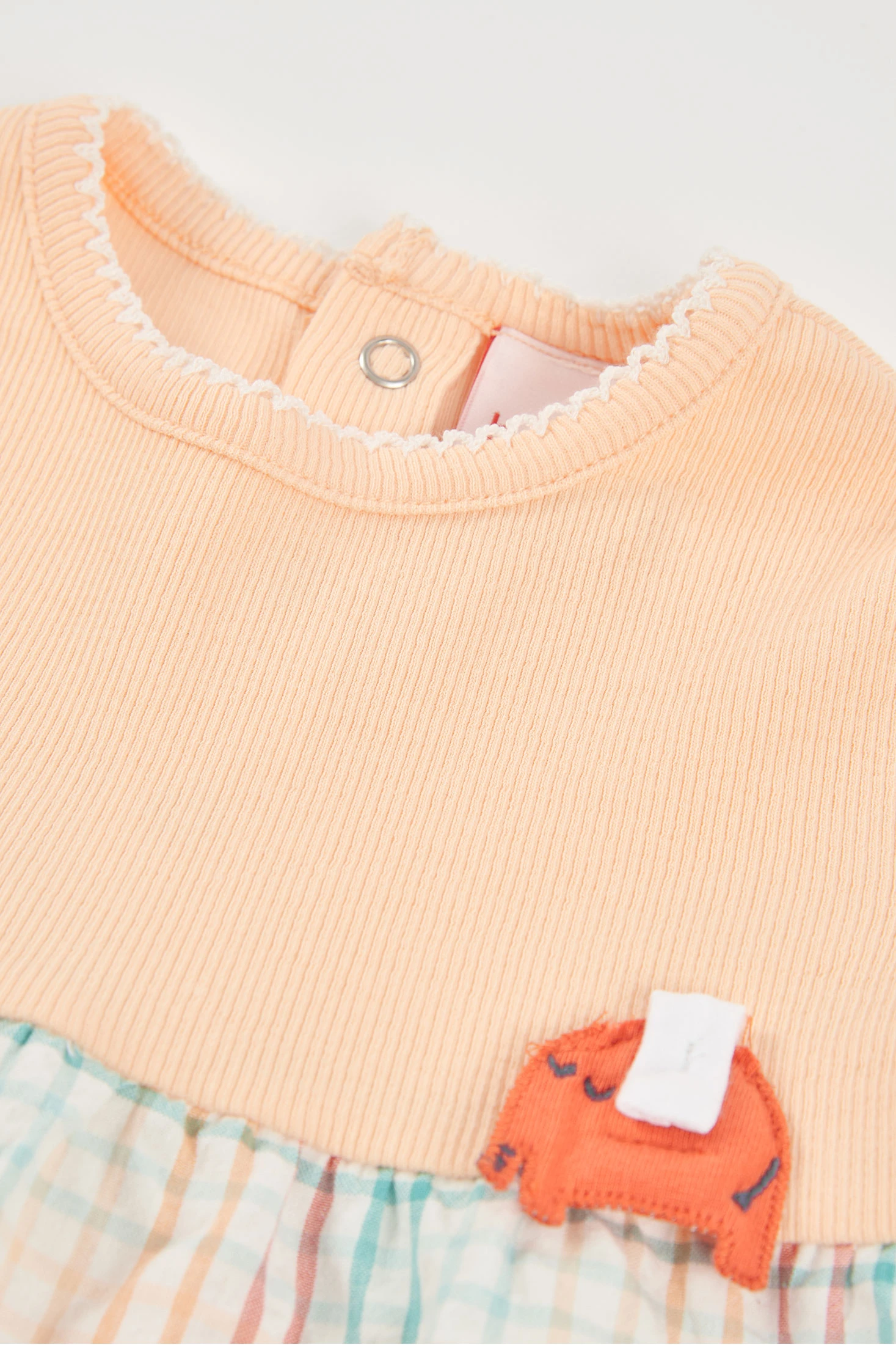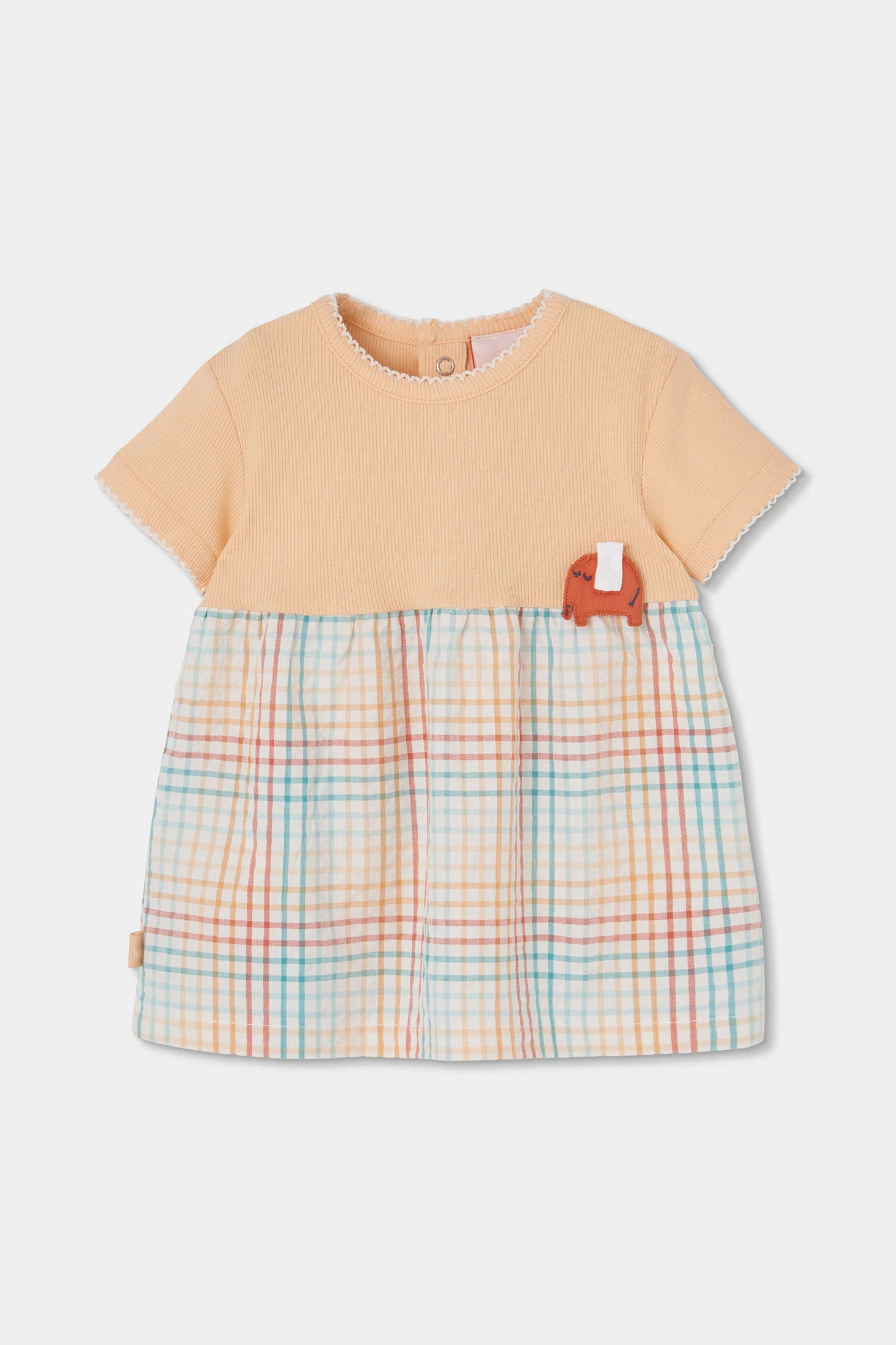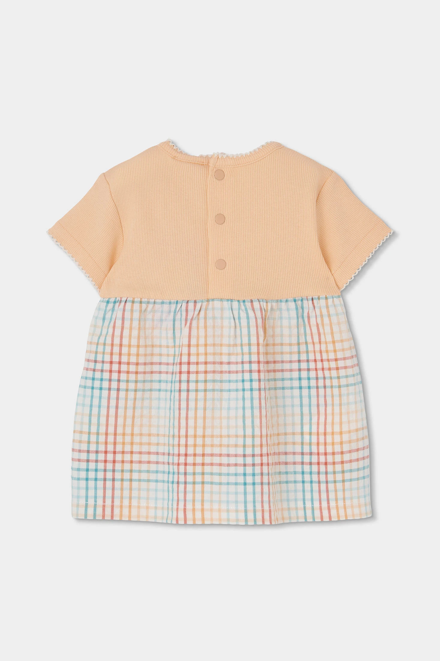 Vestit de punt combinat en taronja clar, perfecte per a nounats, amb talles disponibles des d'1 mes fins a 24 mesos. El seu disseny presenta una part superior llisa i una faldilla de quadres en tons pastel, ideal per a l'estiu. Inclou un petit aplic d'animaló al pit que afegeix un toc encantador. El material de punt assegura comoditat i suavitat per a la pell del nadó. Amb mànigues curtes i coll rodó, és una opció elegant i fresca, perfecta per a esdeveniments especials o sortides diàries. Un vestit còmode i a la moda per als més petits.