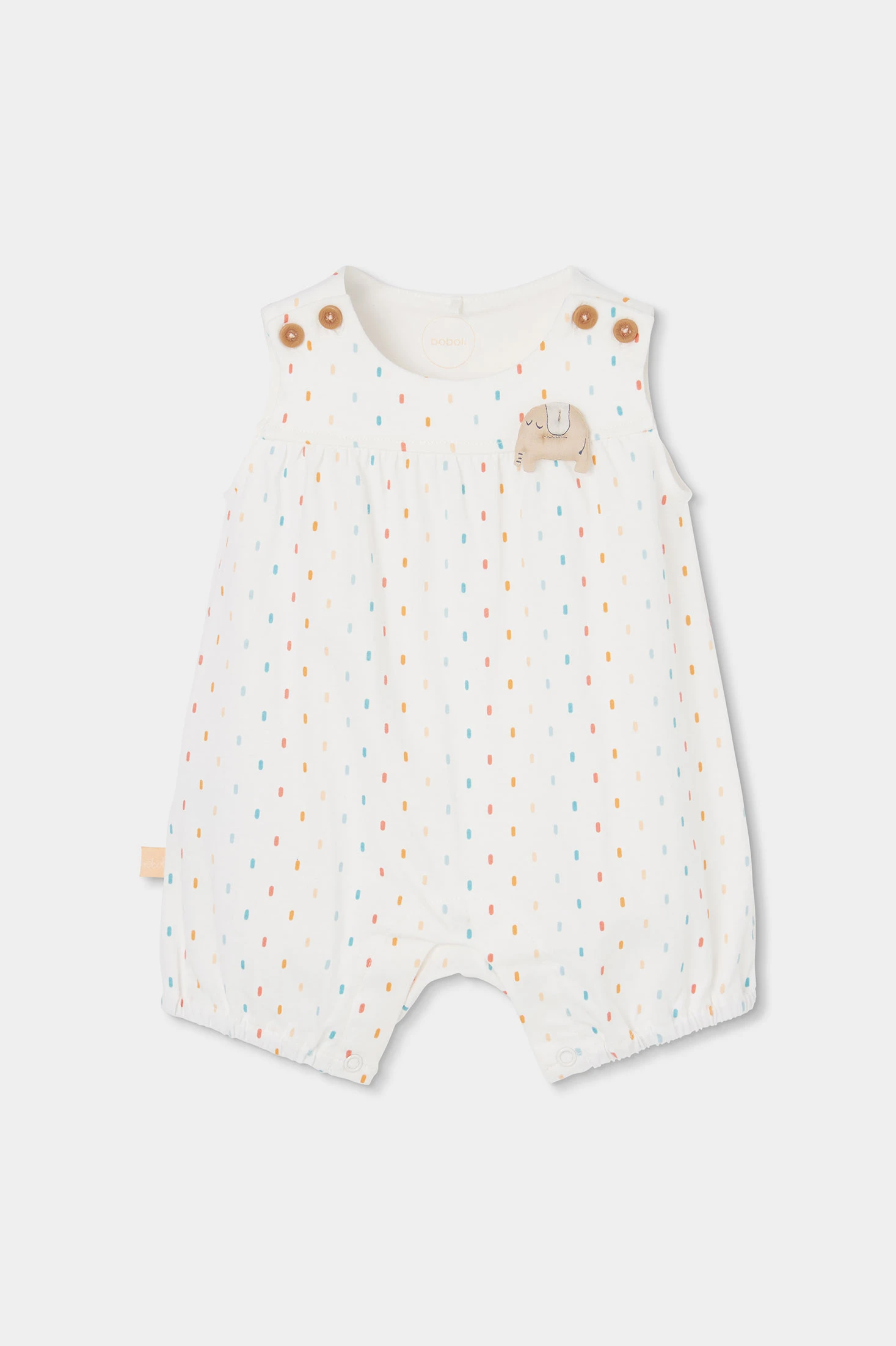 Pijama de cotó blanc, amb motes teixides en diferents colors, per a nadó. Perfecte per a edats de 0 mesos fins a 24 mesos, ofereix suavitat i comoditat. El seu disseny sense mànigues i botons a les espatlles en faciliten l'ús. Aquest pijama és una opció pràctica i encantadora per mantenir el teu nadó còmode i a la moda.