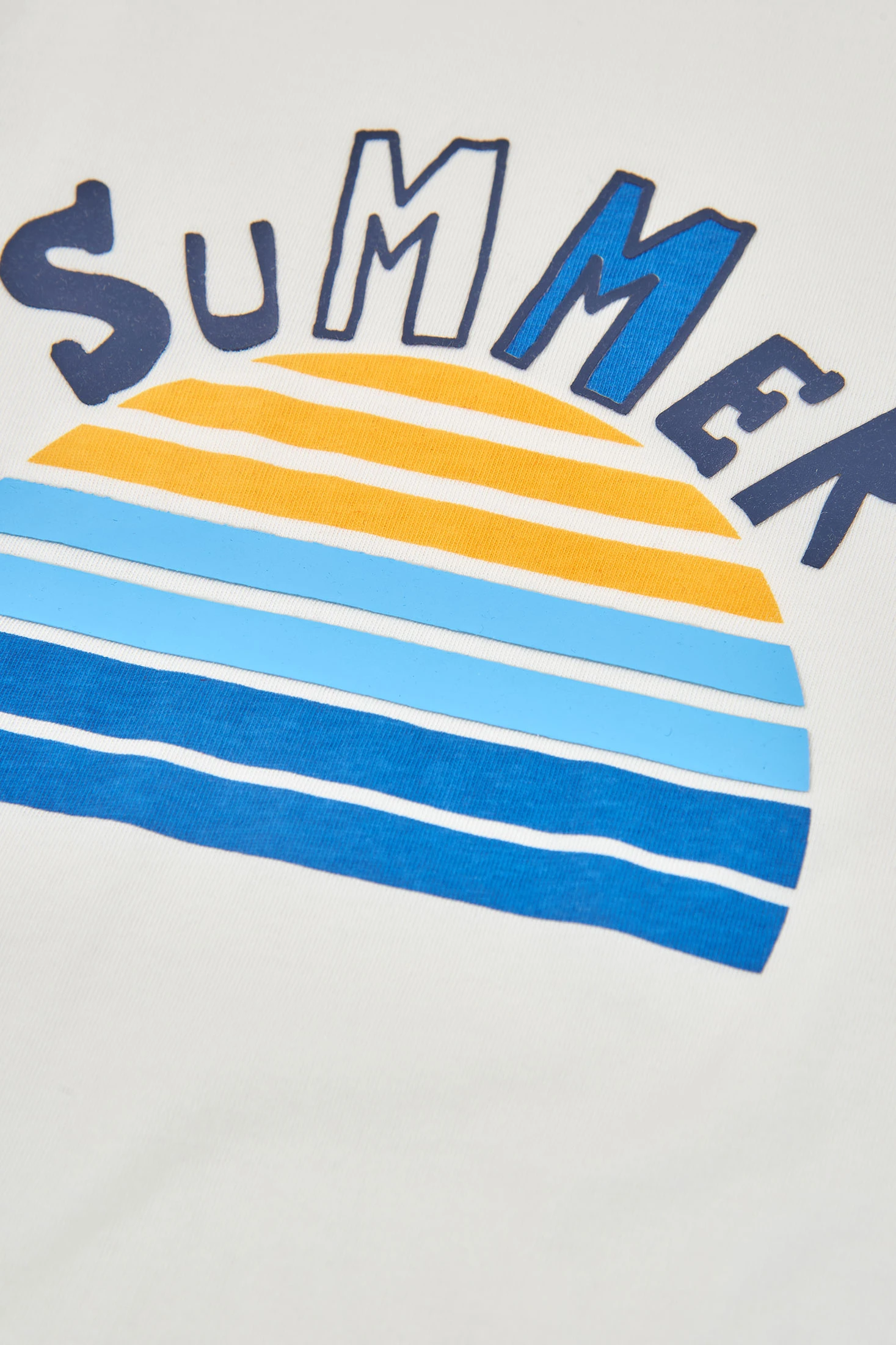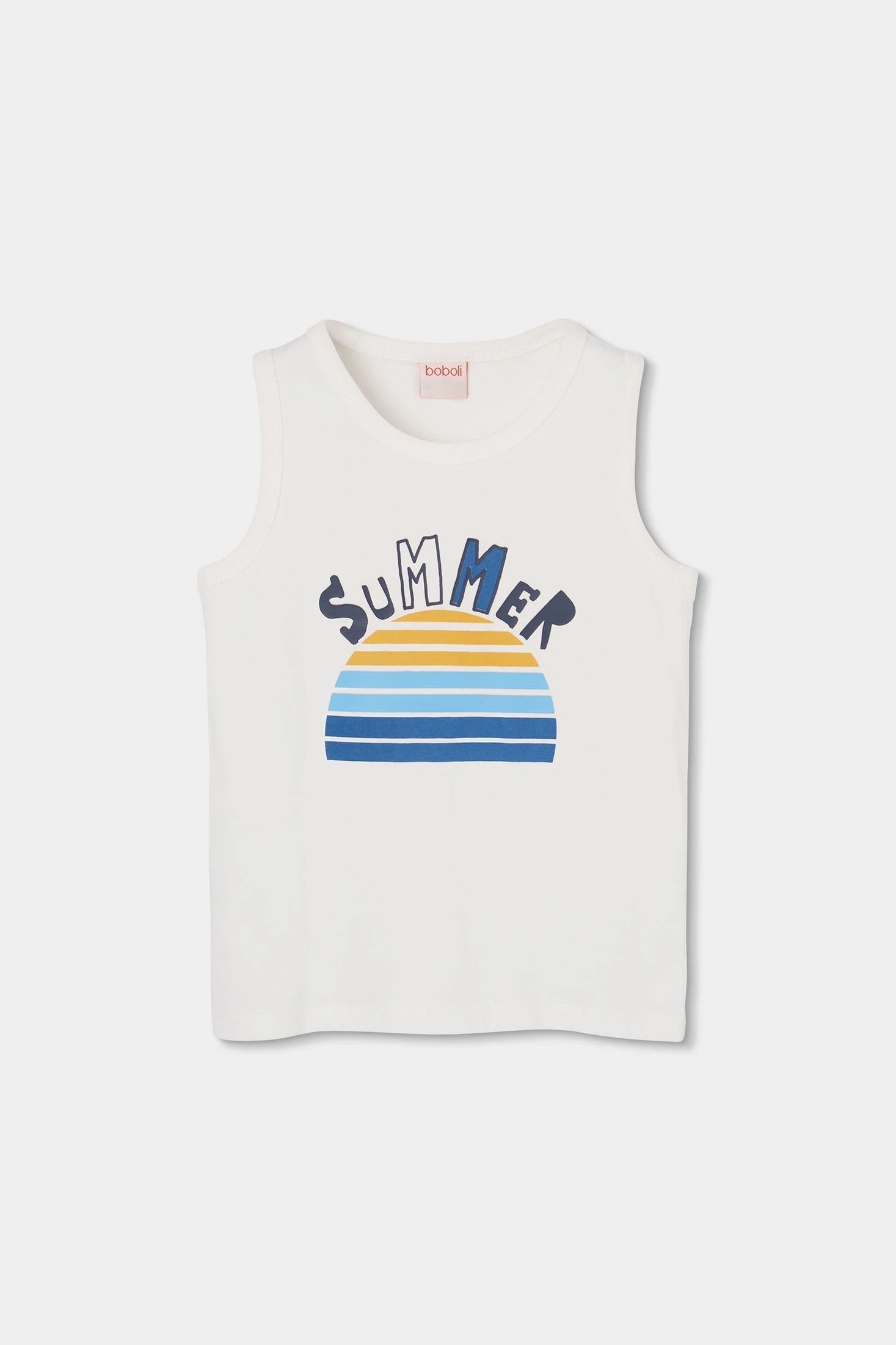 Samarreta sense mànigues per a nen, confeccionada en cotó blanc suau ideal per a l'estiu. Presenta un disseny divertit amb la paraula "SUMMER" i un gràfic de sol amb ratlles blaves i grogues. El seu material lleuger ofereix comoditat i frescor en els dies calorosos. Disponible en talles des de 12 mesos fins a 10 anys. Perfecta per combinar amb pantalons curts o texans per a un look casual i estiuenc.