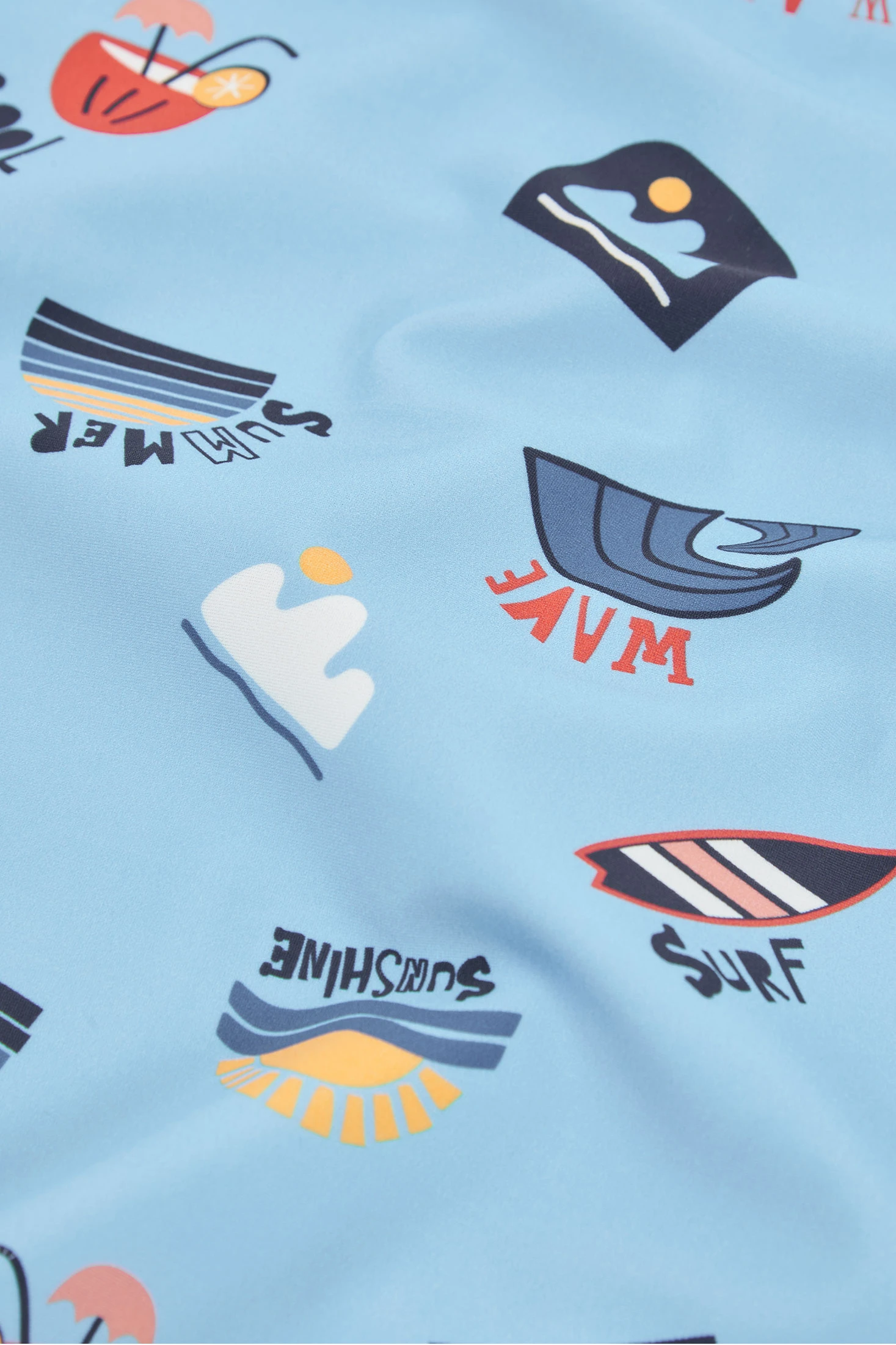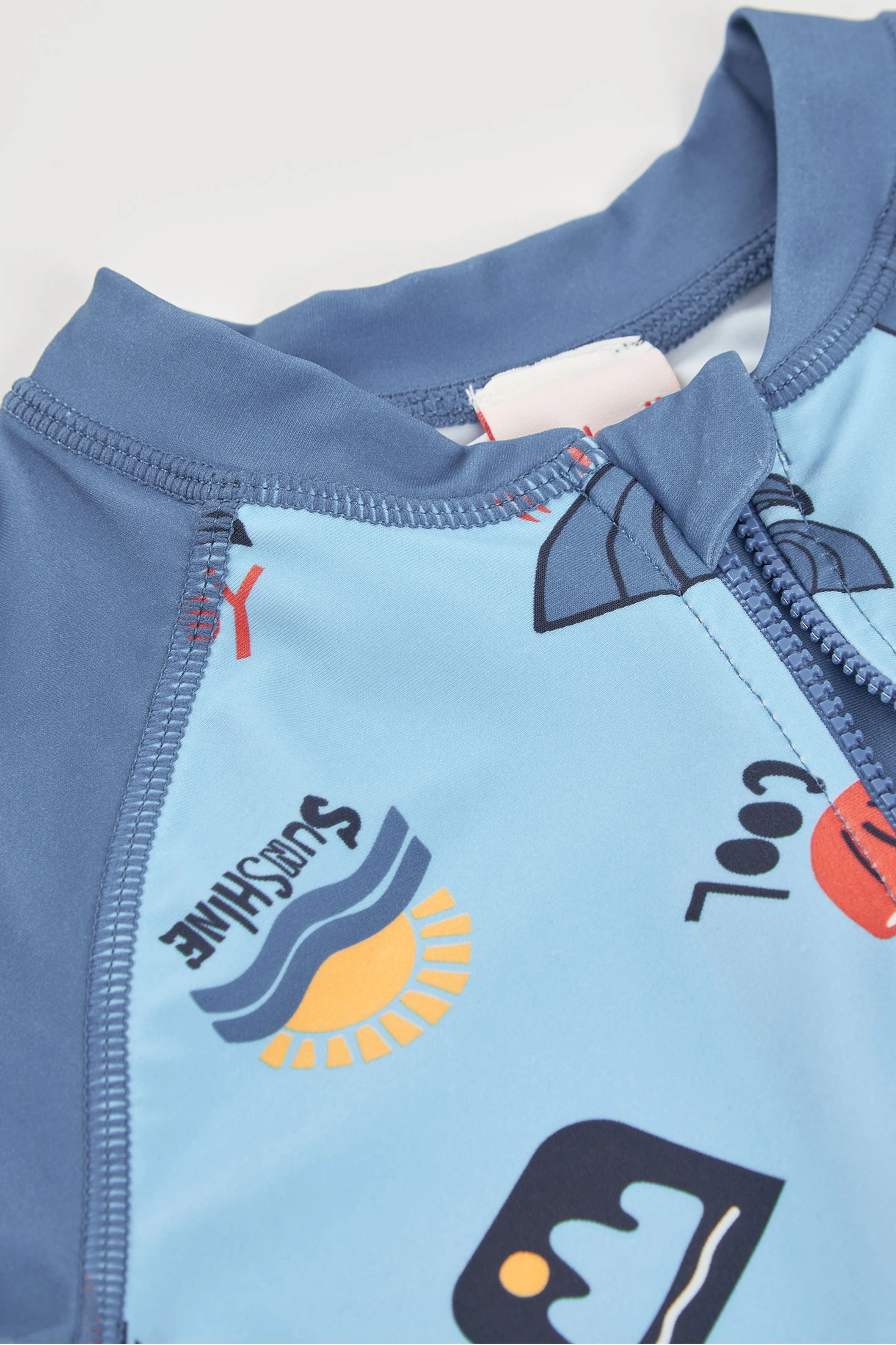 Granota estampada infantil perfecta per als mesos d'estiu. Presenta un disseny acolorit amb dibuixos de vaixells, onades i banderes pirata. Disponible en talles des de 12 mesos fins a 10 anys, s'adapta a diverses etapes de creixement. El seu color blau vibrant afegeix un toc fresc i divertit. Granota amb mànigues curtes i tancament frontal amb cremallera, proporcionant comoditat i practicitat. Ideal per a dies de platja o piscina, garantint diversió i estil. Peça amb protecció solar UPF50.