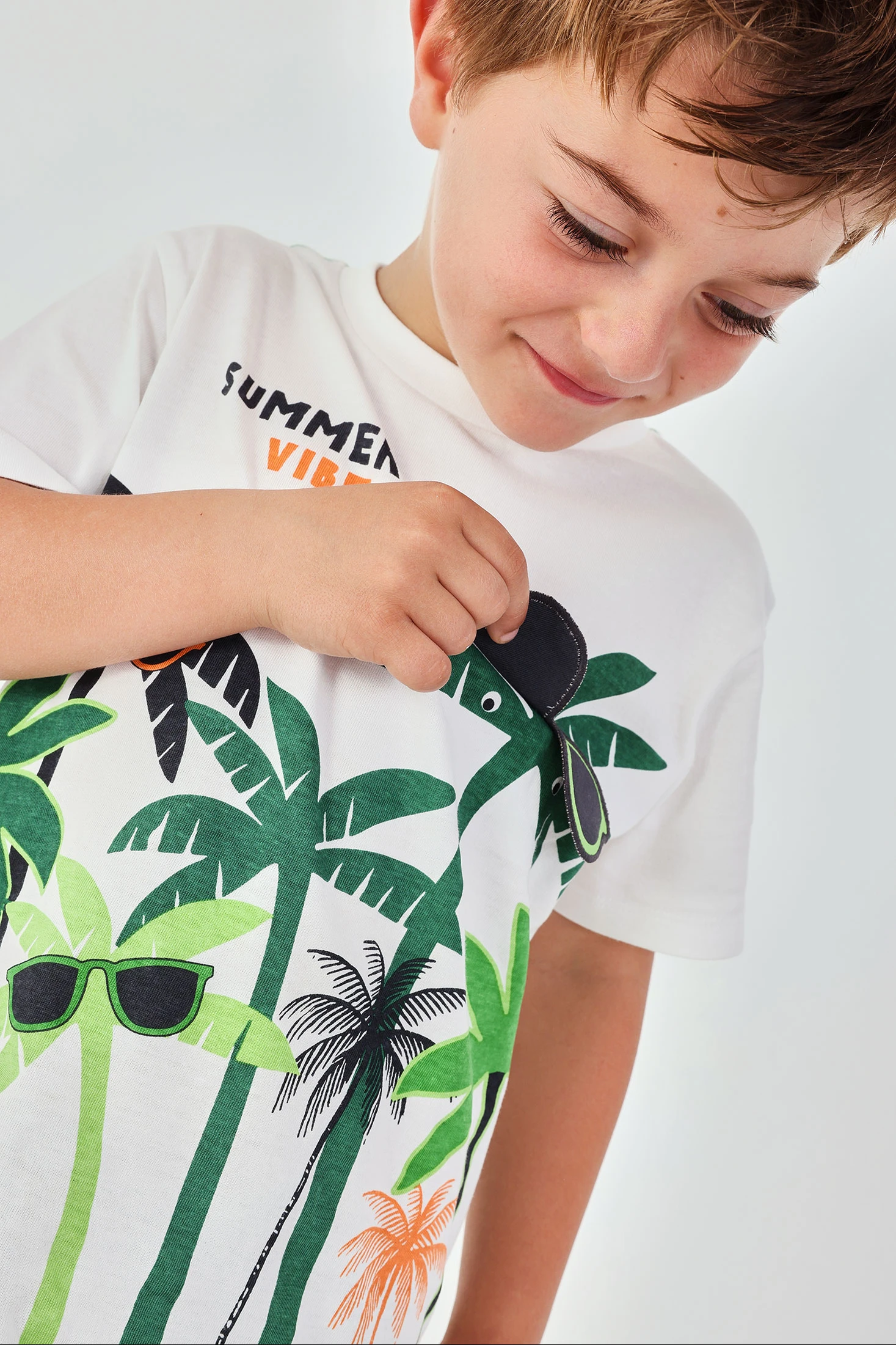 Samarreta de cotó per a nen de color blanc. Amb un gran estampat divertit i amb detalls aplicats. El seu teixit de cotó garanteix frescor i comoditat, perfecte per a l'ús diari. Disponible en talles des de 12 mesos fins a 10 anys, ofereix flexibilitat per adaptar-se al creixement del teu petit. El tall clàssic i el coll rodó la fan fàcil de combinar amb diferents estils de roba, afegint un toc divertit al seu vestuari diari.
