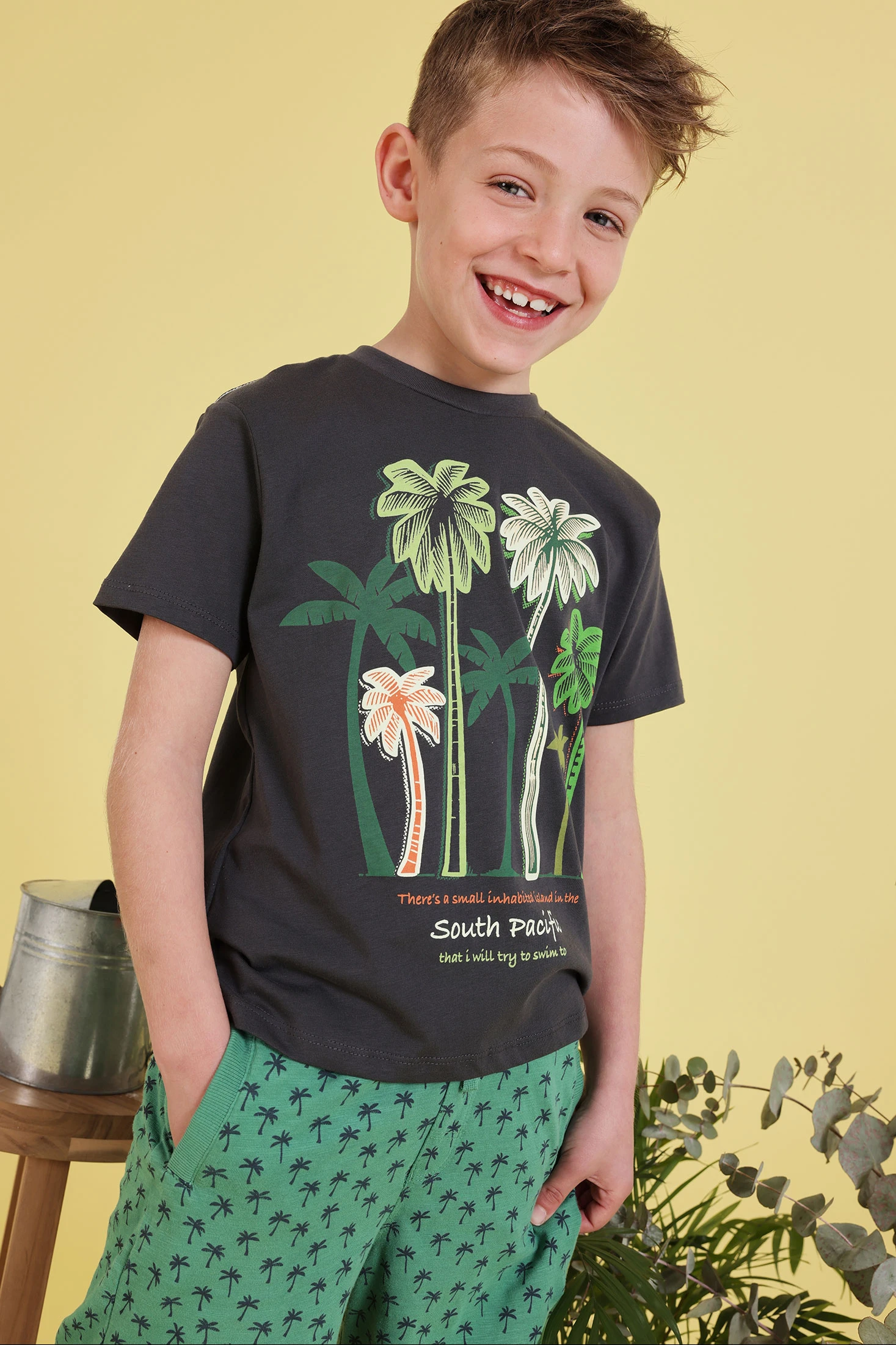 Samarreta de cotó gris antracita per a nen ideal per a l'ús diari gràcies al seu disseny còmode i fresc. Presenta un estampat de palmeres en tons verds i taronges, que afegeix un toc divertit i tropical. El teixit de cotó proporciona suavitat i confort. Disponible en talles des de 12 mesos fins a 10 anys, ofereix versatilitat i estil. Combina-la amb pantalons curts o texans per a un look casual i modern. Una opció pràctica per a qualsevol ocasió.