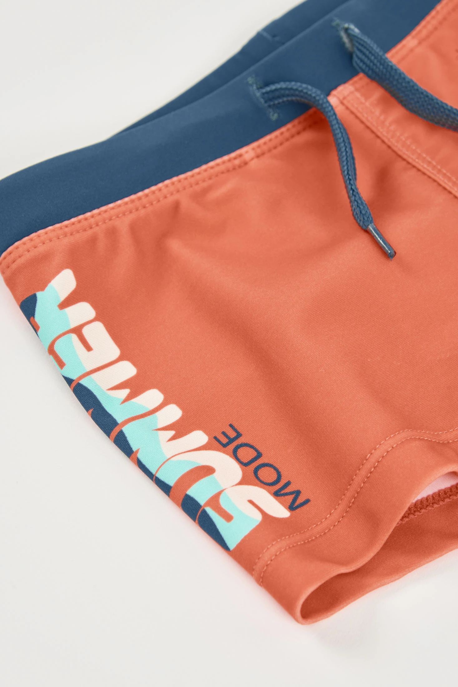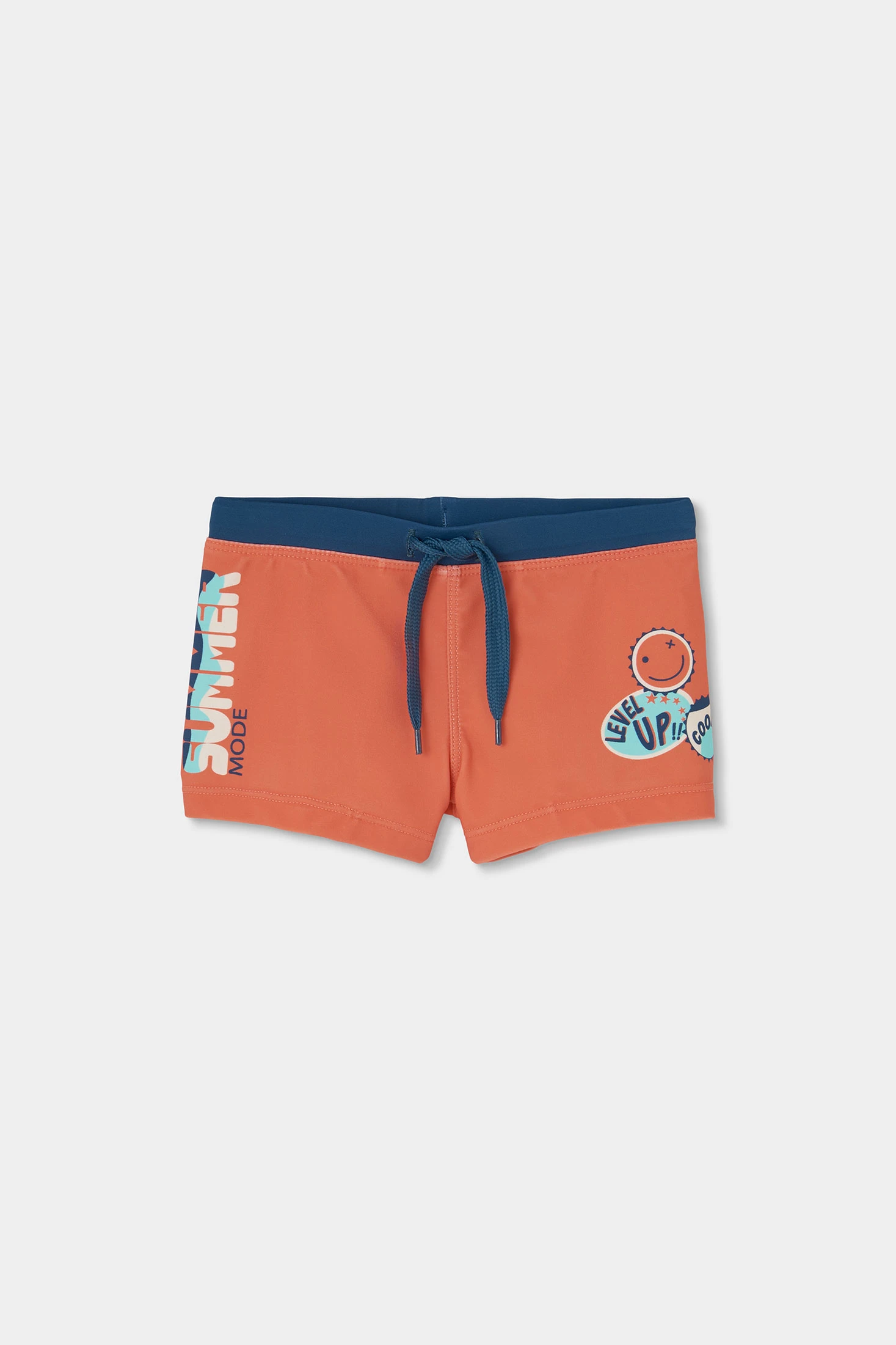 Banyador per a nen en color taronja, perfecte per gaudir de l'estiu. Fet de material elàstic i còmode, compta amb un disseny divertit que inclou gràfics i text. La cintura és ajustable mitjançant un cordó blau per a un millor ajustament. Disponible en talles des de 12 mesos fins a 10 anys, assegurant comoditat a totes les edats. Ideal per al seu ús a la platja o la piscina, afegeix un toc d'estil i diversió a les activitats aquàtiques de qualsevol petit. Peça amb protecció solar UPF50.