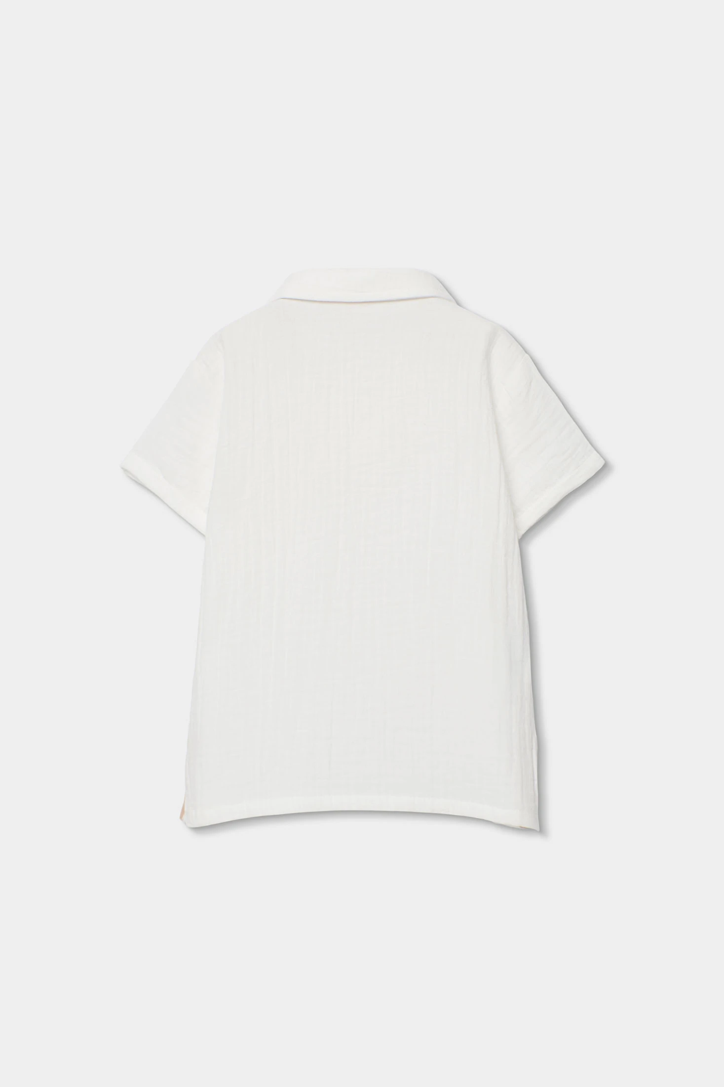 Polo de muselina de cotó blanc trencat per a nen, perfecte per a climes càlids. Amb un disseny simple i elegant, compta amb un coll clàssic i mànigues curtes que ofereixen comoditat i frescor. El seu teixit lleuger i transpirable és ideal per mantenir els petits frescos. Disponible en talles des de 12 mesos fins a 10 anys, aquest polo és versàtil i fàcil de combinar amb diferents estils de roba per a un look net i despreocupat. Una opció pràctica i estilosa per al dia a dia.