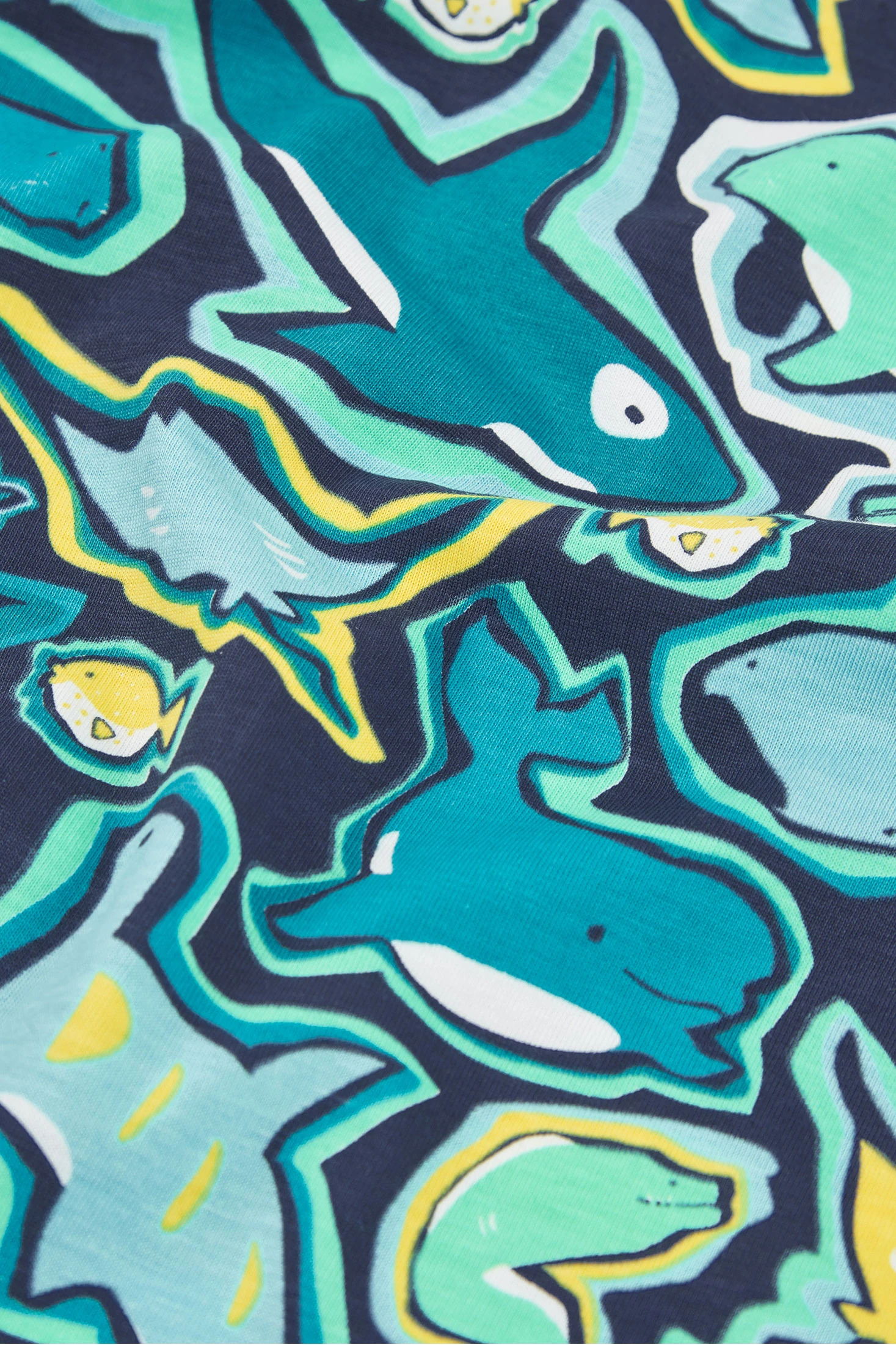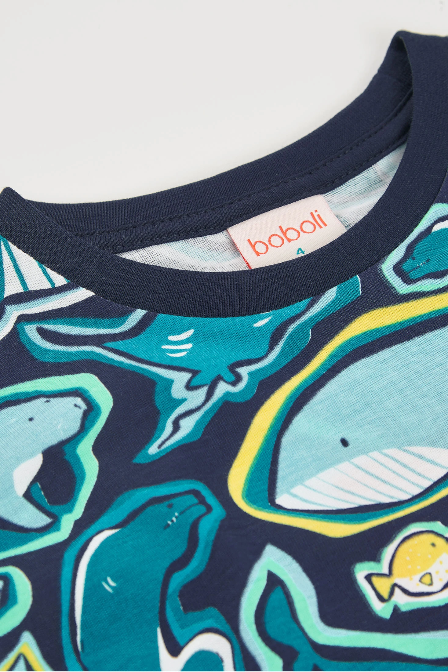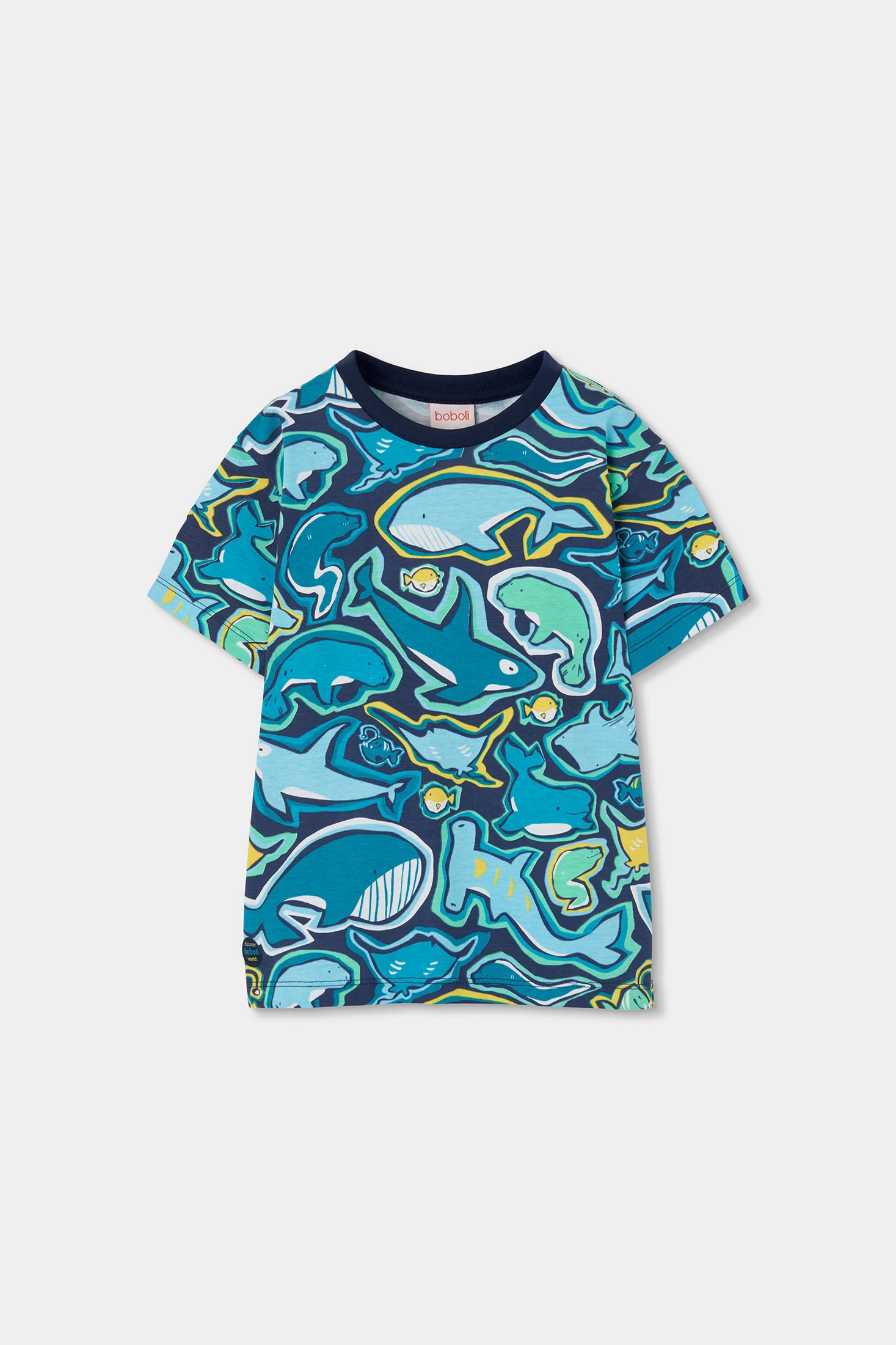 Samarreta estampada de punt per a nen, ideal per a la temporada. Elaborada amb un material suau i còmode, presenta un divertit estampat d'animals marins en tons blaus i verds. Perfecta per a edats des de 12 mesos fins a 10 anys. El disseny de coll rodó i màniga curta la fa versàtil per combinar amb diferents estils. Una opció plena de color i alegria per a qualsevol ocasió informal.