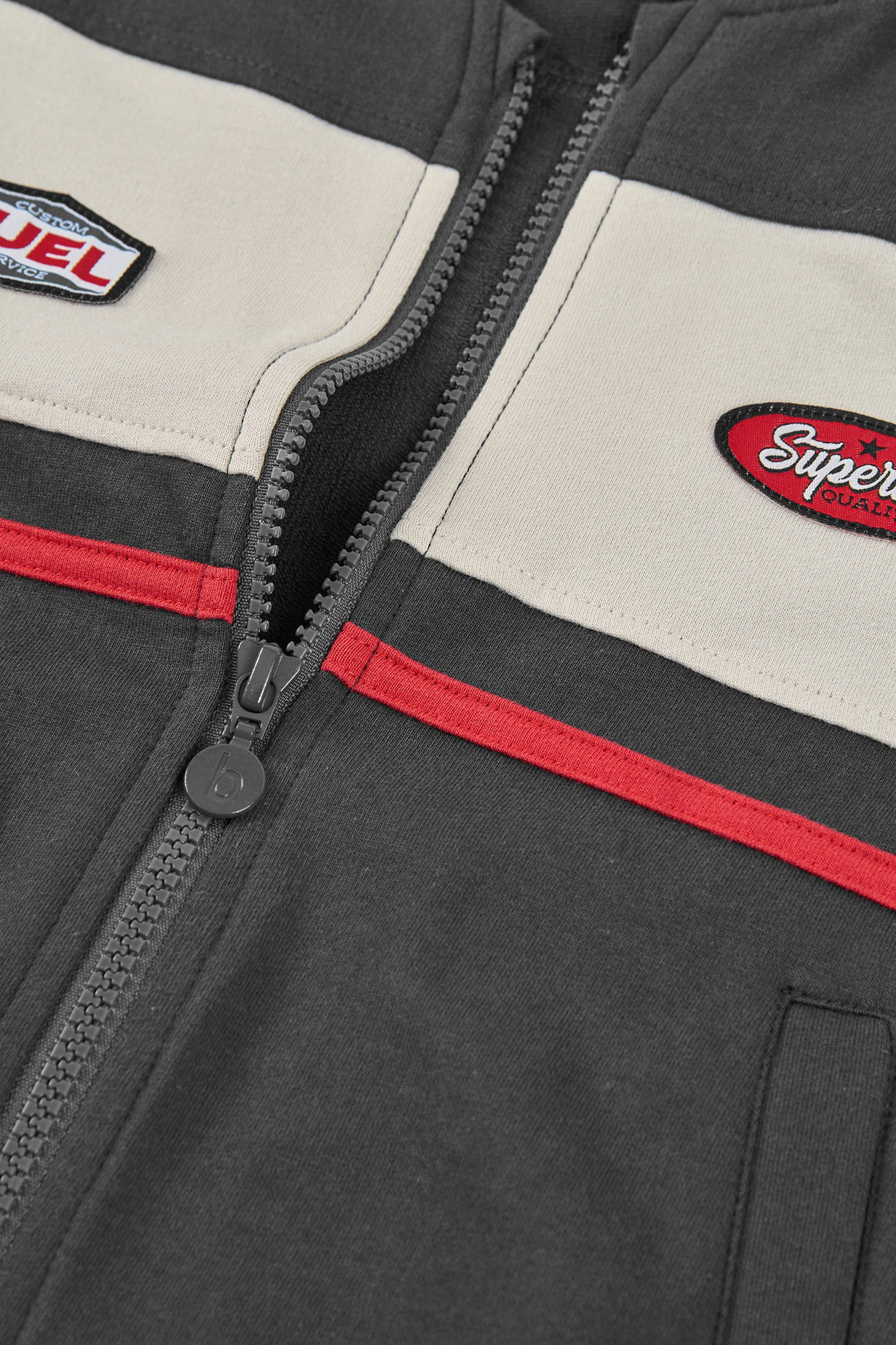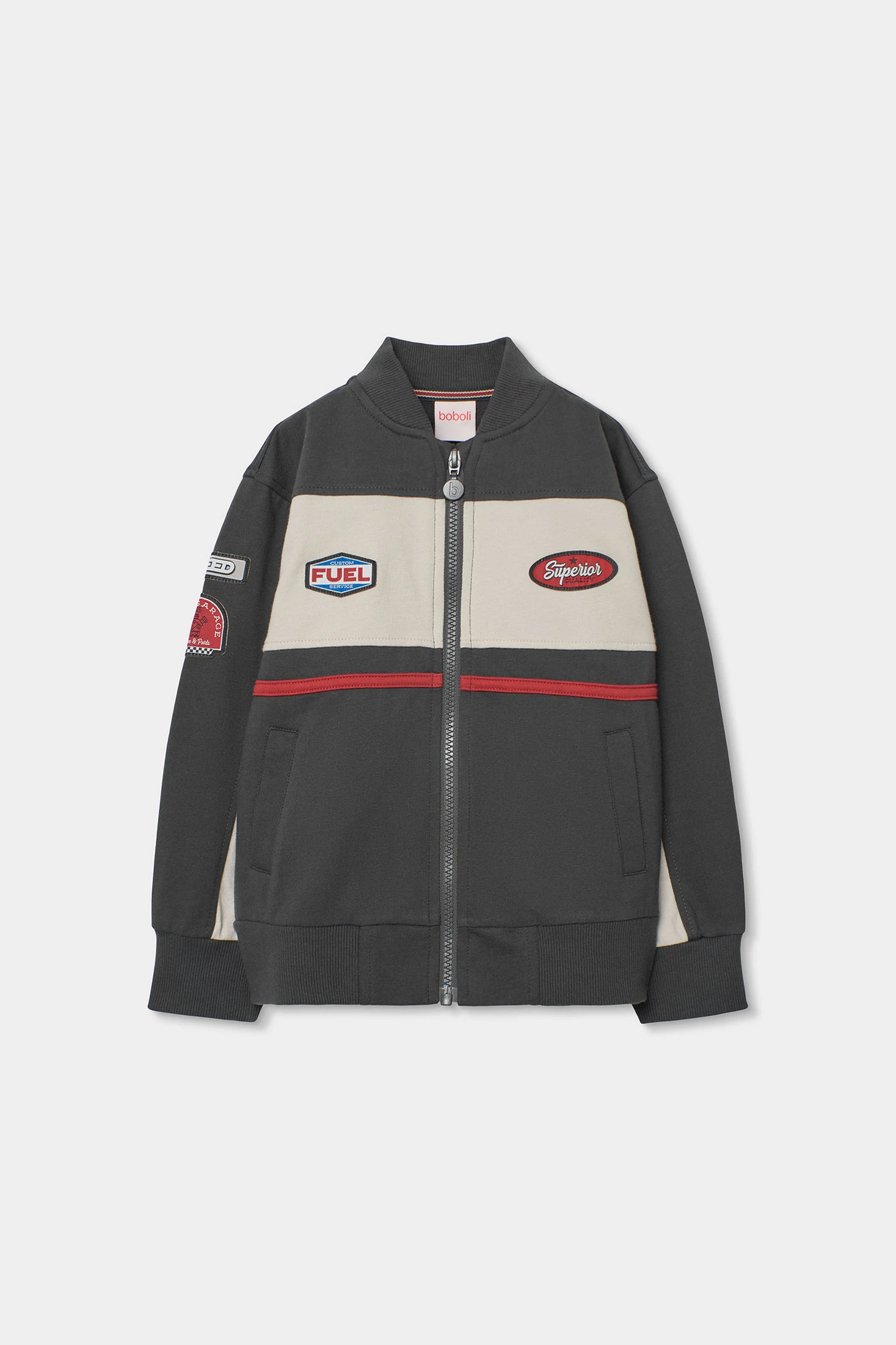 Jaqueta de pelfa grisa per a nen ideal per a la tardor i hivern. Amb un disseny modern i detalls decoratius al pit i a les mànigues, combina funcionalitat i estil. La seva composició garanteix calidesa i confort. Disponible en talles des de 2 anys fins a 14 anys, és perfecta per mantenir els més petits abrigats. Els pegats i el tancament de cremallera li afegeixen un toc únic. Combinable amb texans i pantalons casuals, és una peça versàtil per al dia a dia.