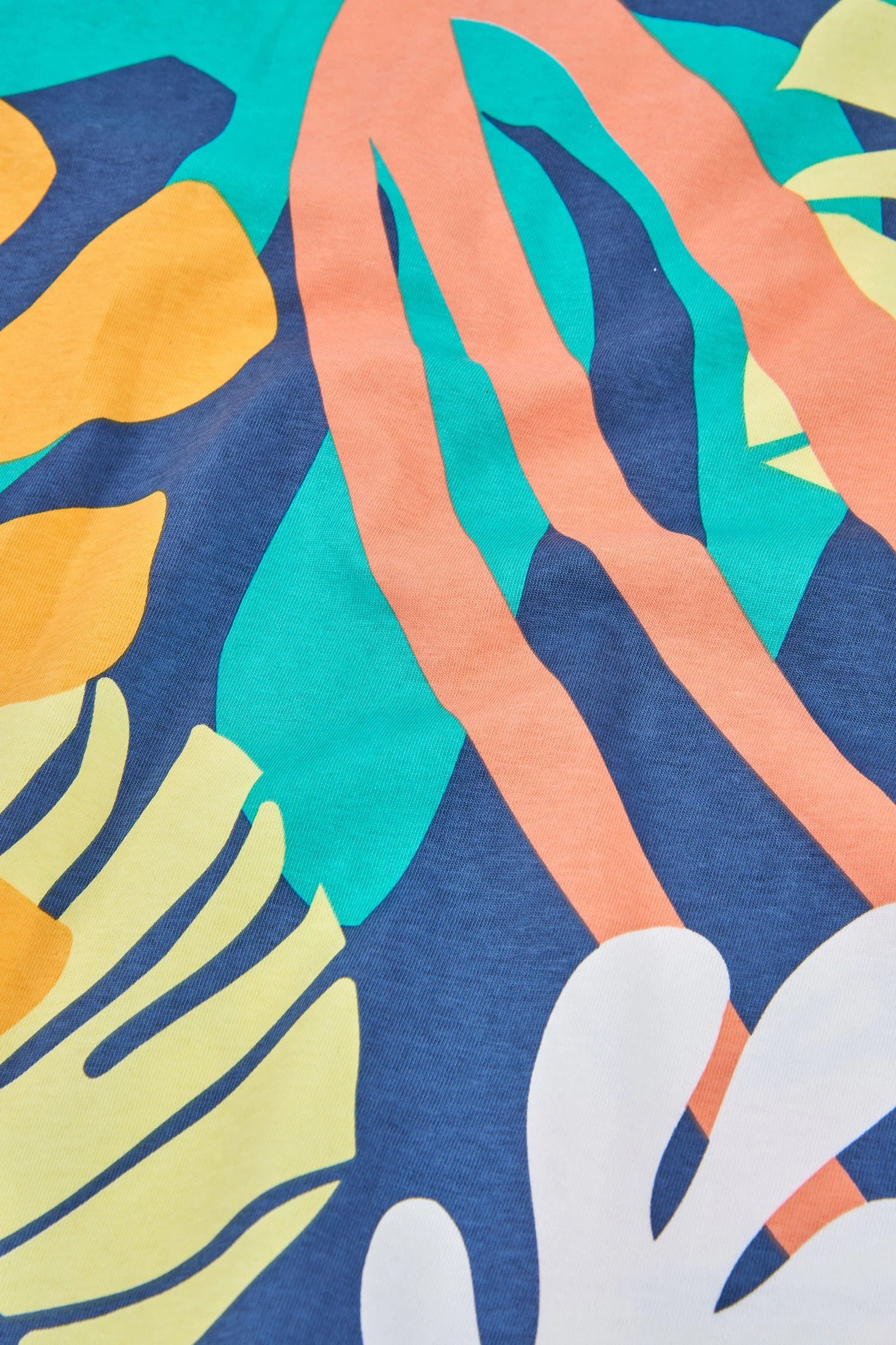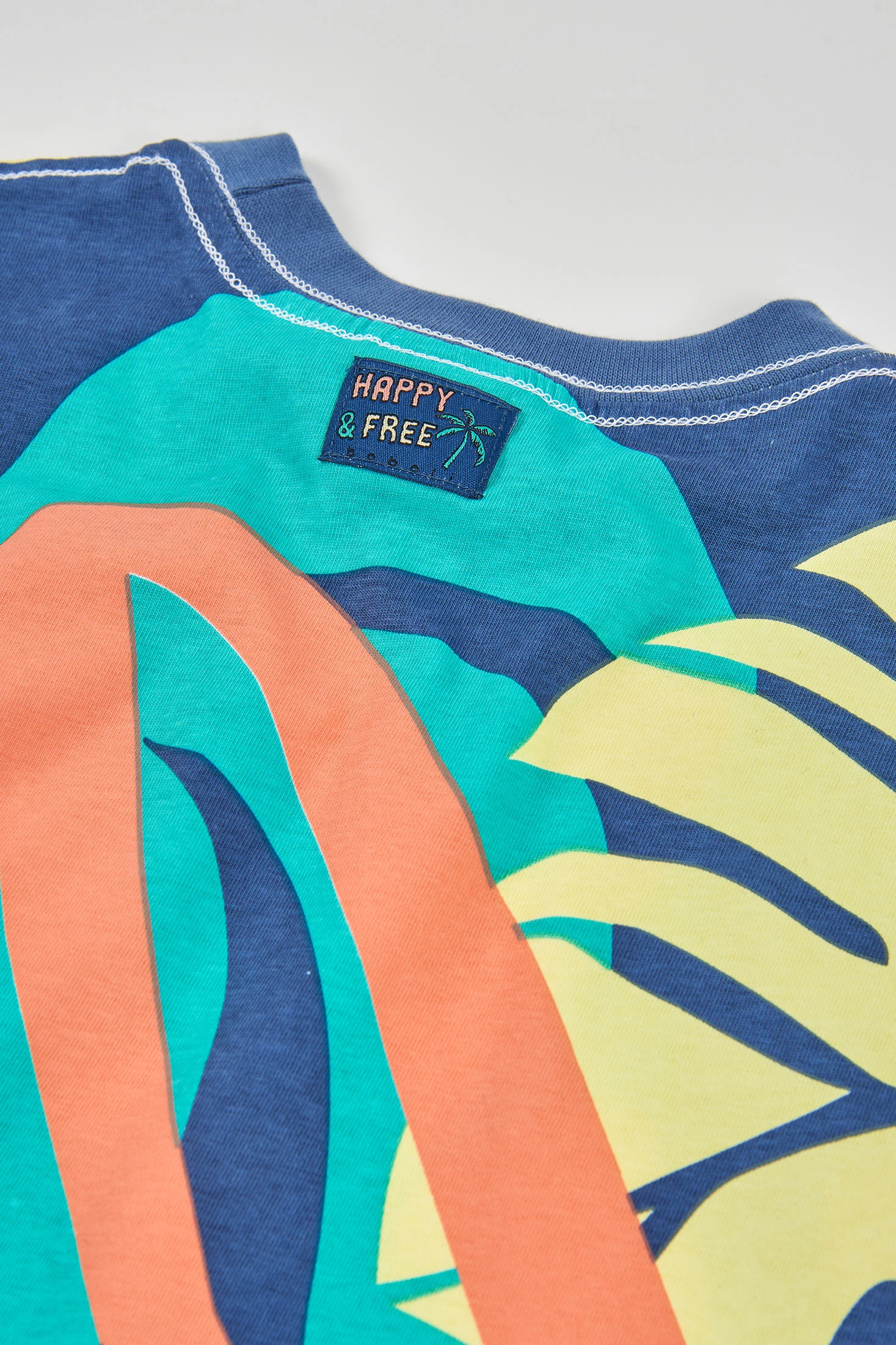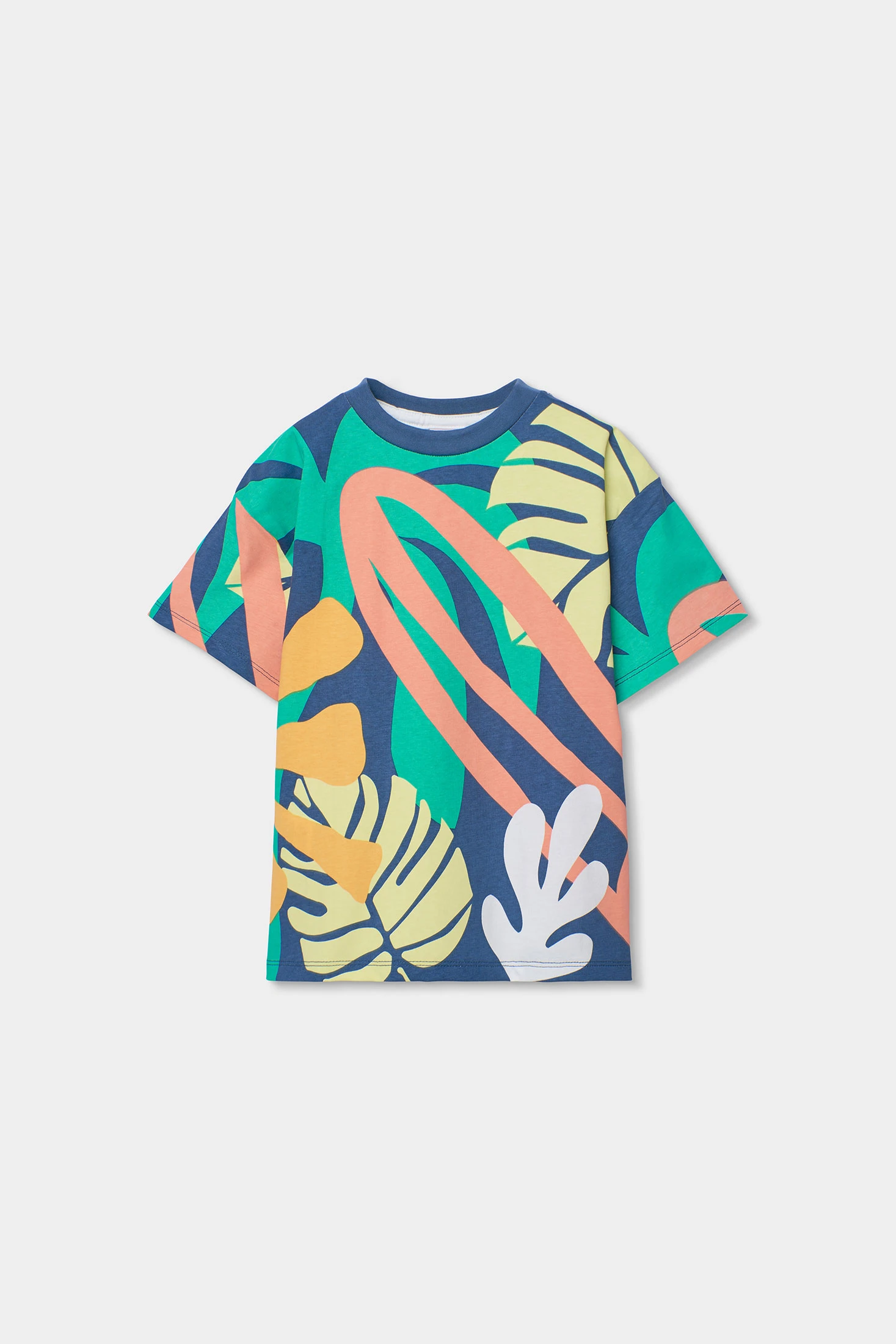 Samarreta de cotó per a nen. Ideal per al dia a dia. Fet d'un material suau i còmode, és ideal per a la temporada de primavera i estiu. El seu disseny inclou dibuixos simpàtics de palmeres i fulles que omplen tota la peça. Disponibles en talles des de 2 anys fins a 14 anys, proporcionant un ajust adequat a mesura que el nen creix. El seu color blau vibrant les fa fàcils de combinar amb samarretes llises o estampades. Una samarreta versàtil i còmoda per al dia a dia dels petits aventurers.