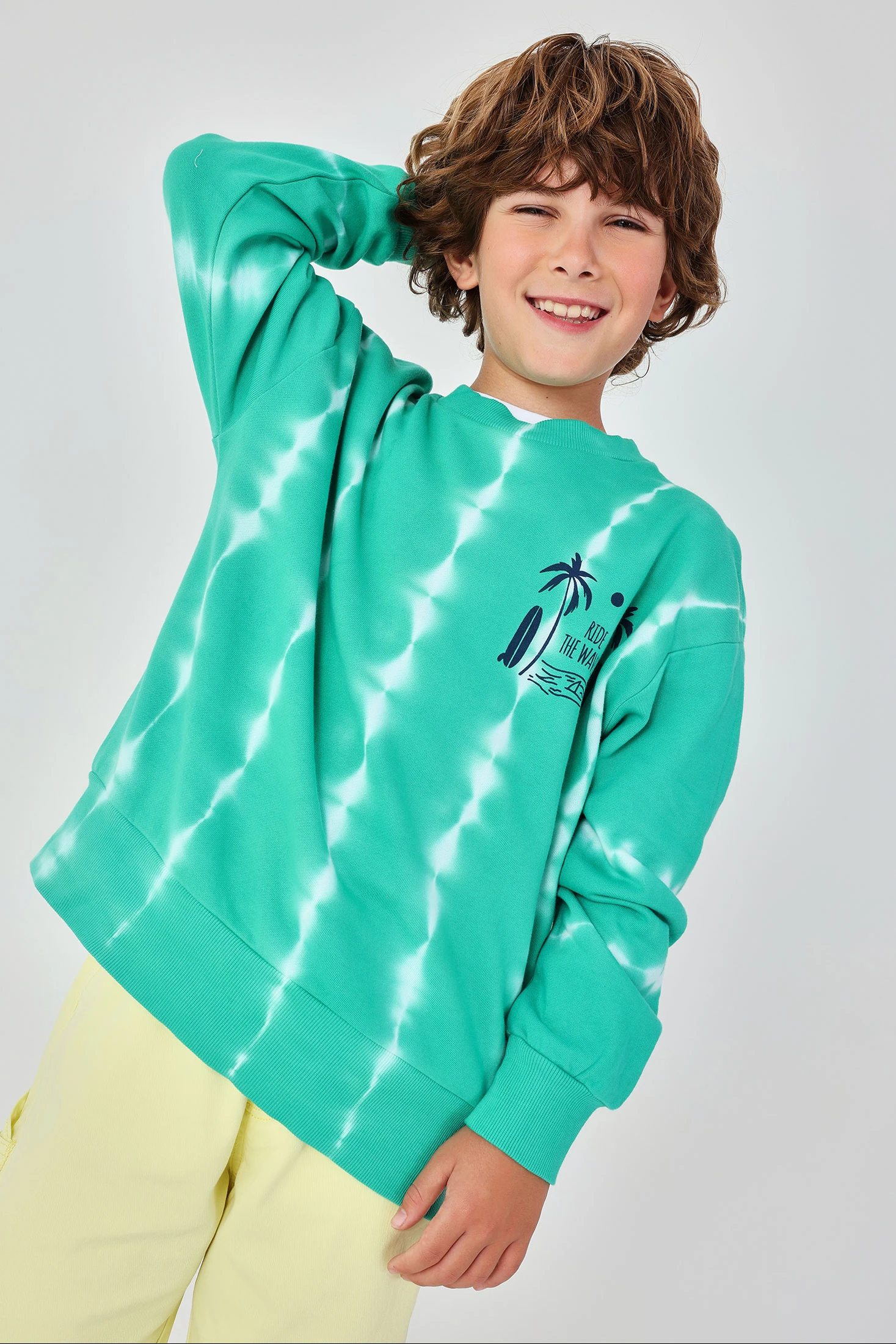 Dessuadora de pelfa verda perfecta per a nens en les talles de 2 anys fins a 14 anys. Amb un disseny tie-dye, combina estil amb comoditat gràcies al seu teixit suau i càlid. Equipada amb un coll rodó i mànigues llargues, resulta adequada per a la primavera. Un petit estampat al pit afegeix un toc de diversió. Ideal per combinar amb texans o pantalons casuals, oferint un look relaxat i modern.