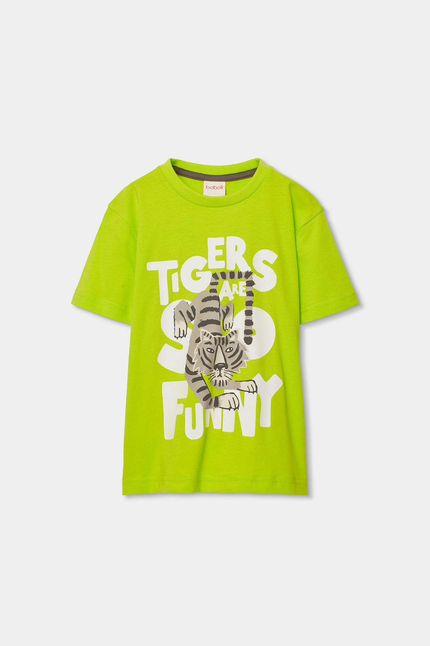 Samarreta de cotó per a nen, ideal per a la temporada, destaca pel seu color verd vibrant i un estampat divertit d'un tigre que afegeix un toc d'humor i estil. Confeccionada en teixit suau, proporciona comoditat durant tot el dia. Presenta un coll rodó i mànigues curtes. Disponible en talles des de 2 anys fins a 14 anys, s'adapta al creixement dels nens. Perfecta per combinar amb texans o pantalons curts, és una opció versàtil i moderna per a l'ús diari.