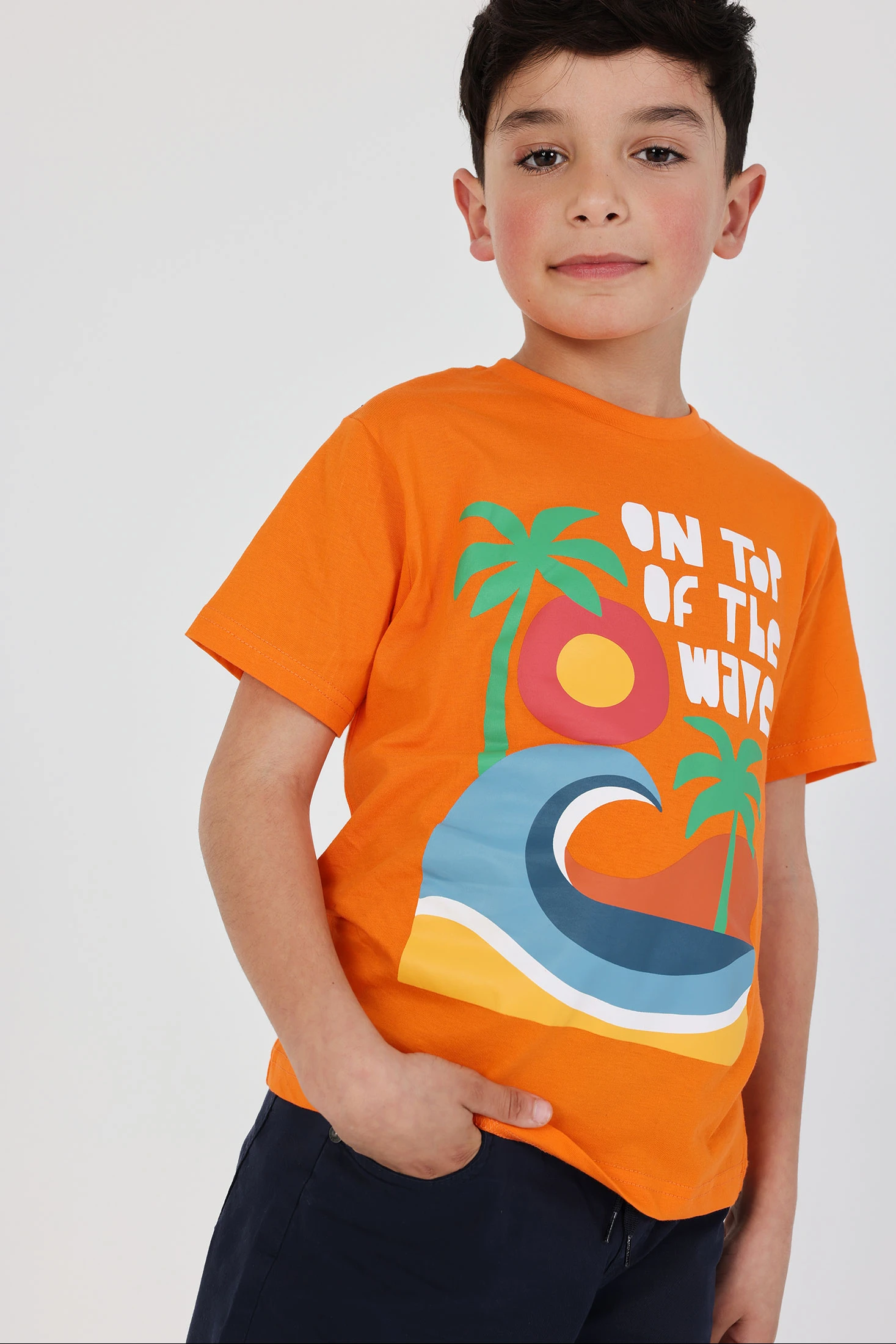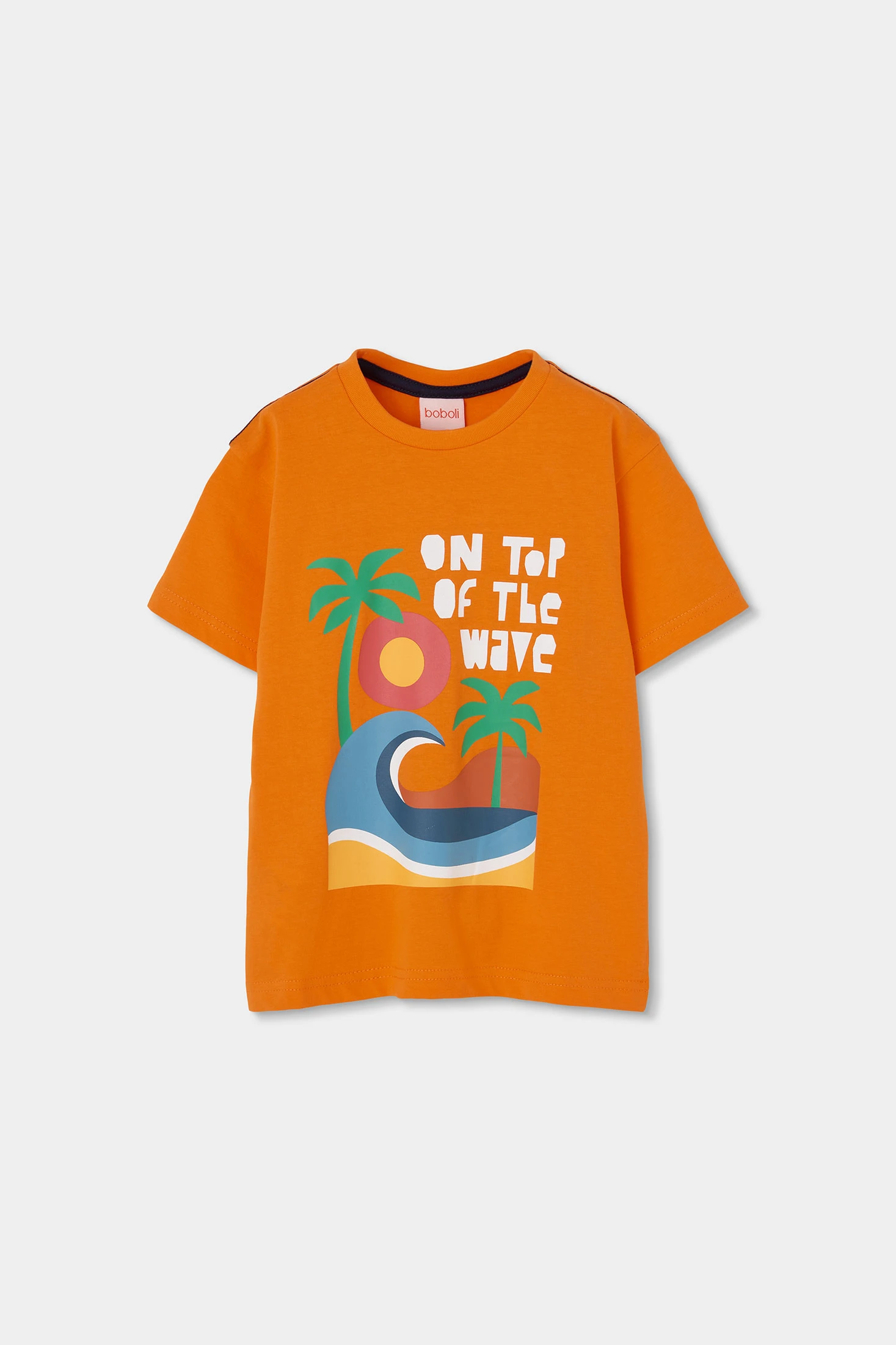 Samarreta de punt de cotó per a nen perfecta per afegir un toc vibrant al vestuari. Disponible en talles des dels 2 anys fins als 14 anys, s'adapta al creixement. Disseny amb un color taronja cridaner i un estampat gràfic que inclou palmeres i una ona, ideal per a un estil estiuenc. Coll rodó i mànigues curtes garanteixen comoditat per al dia a dia. Peça ideal per combinar amb pantalons curts o texans, oferint un look informal i alegre per a les aventures a l'aire lliure.