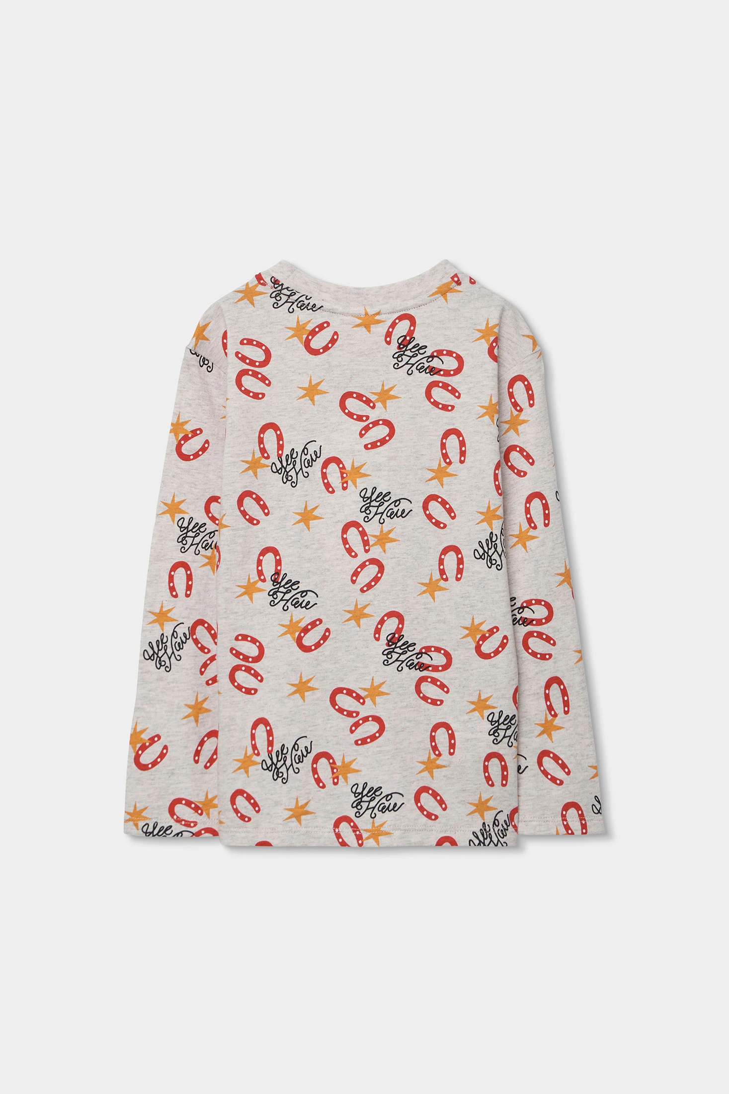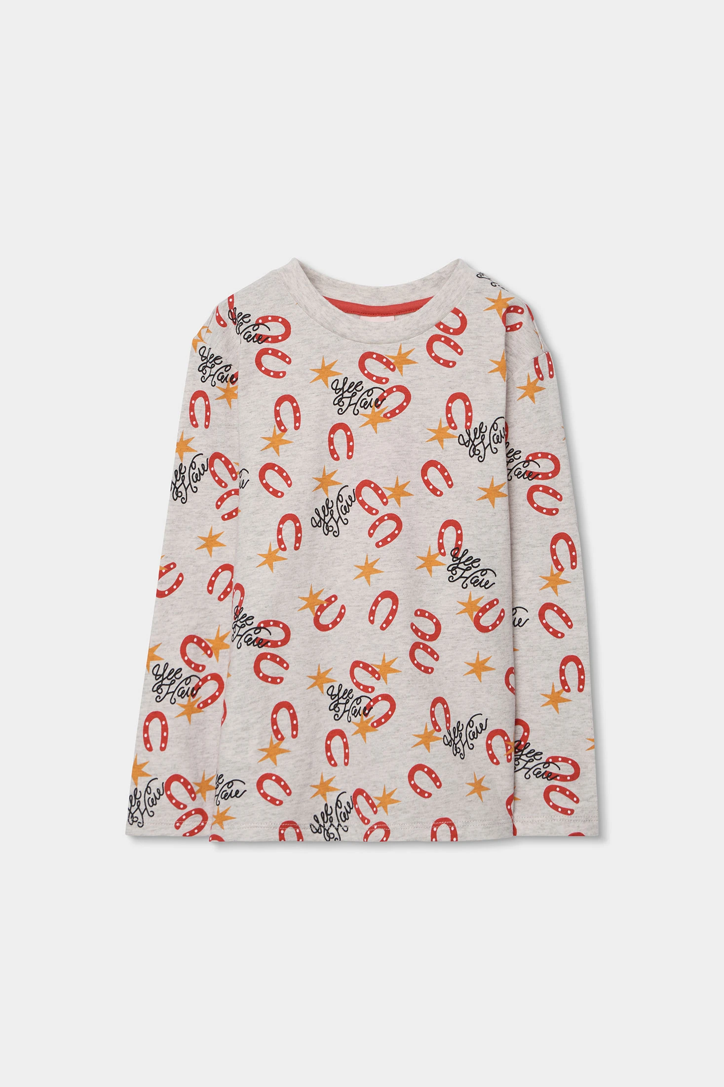 Pijama estampat per a nen perfecte per assegurar comoditat durant la nit. Confeccionat en suau teixit de punt, és ideal per a pells delicades. Disseny amb un patró en tons gris, vermell i negre amb motius de ferradures, estrelles i lletres, afegint un toc divertit. Les mànigues llargues són adequades per mantenir la calor. Disponible en talles des de 2 fins a 14 anys, cobrint diverses etapes de creixement. Una opció pràctica i acollidora per a les nits més fresques.