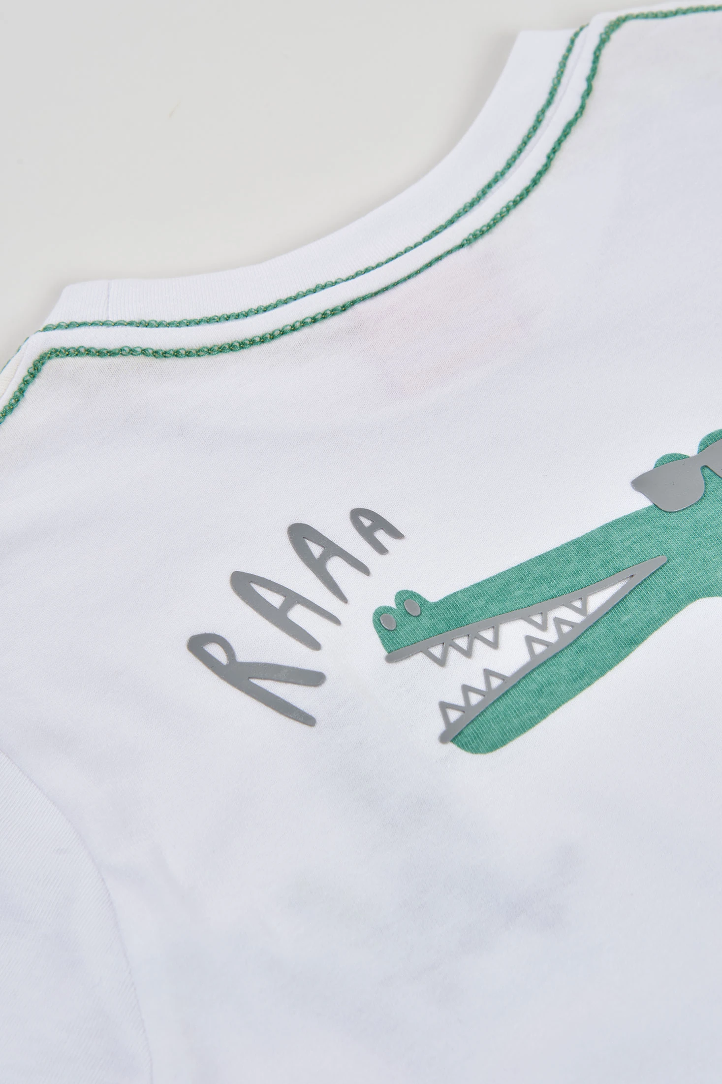 Samarreta de punt de cotó blanc per a nen, ideal per a un look fresc i còmode. Presenta un disseny divertit amb un animal en monopatí, afegint un toc de diversió. És perfecta per a nens des de 12 mesos fins a 10 anys. El seu teixit de cotó és suau i transpirable, ideal per a l'ús diari. Samarreta amb tall clàssic, coll rodó i mànigues curtes, versàtil per combinar amb pantalons o shorts. Una opció pràctica per a qualsevol ocasió.