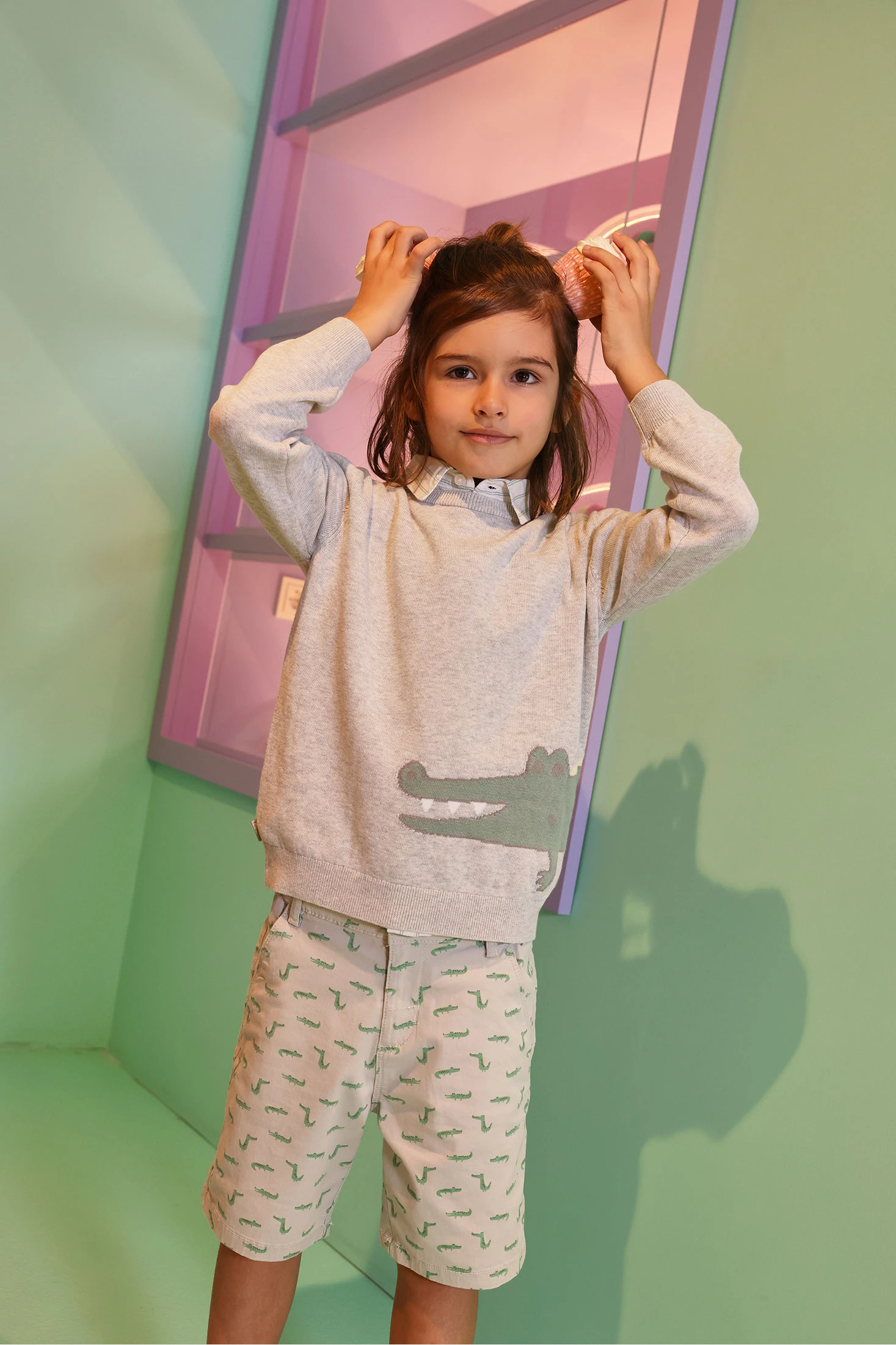 Jersei de cotó gris vigoré per a nen, ideal per mantenir el confort en els dies més frescos. Presenta un disseny divertit amb un animal teixit a la part baixa, afegint un toc lúdic. Confeccionat en cotó, és suau i confortable. Dissenyat per a edats de 12 mesos fins a 10 anys, és perfecte per combinar amb pantalons casuals i crear un look càlid i modern. El seu coll rodó i mànigues llargues fan d'aquesta peça una opció versàtil i funcional per al clima canviant.