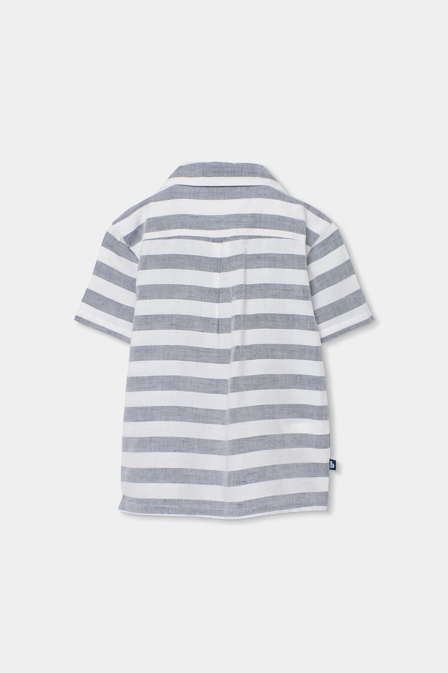 Camisa de lli per a nen ideal per a la temporada d'estiu. Amb un disseny de ratlles blaves i blanques, ofereix un estil fresc i elegant. El material de lli garanteix transpirabilitat i confort. Disponible en talles des de 12 mesos fins a 10 anys. La camisa compta amb un coll clàssic i mànigues curtes, perfecte per a un look estiuenc. Es pot combinar amb pantalons curts per a un estil casual o amb pantalons de lli per a una ocasió més formal.