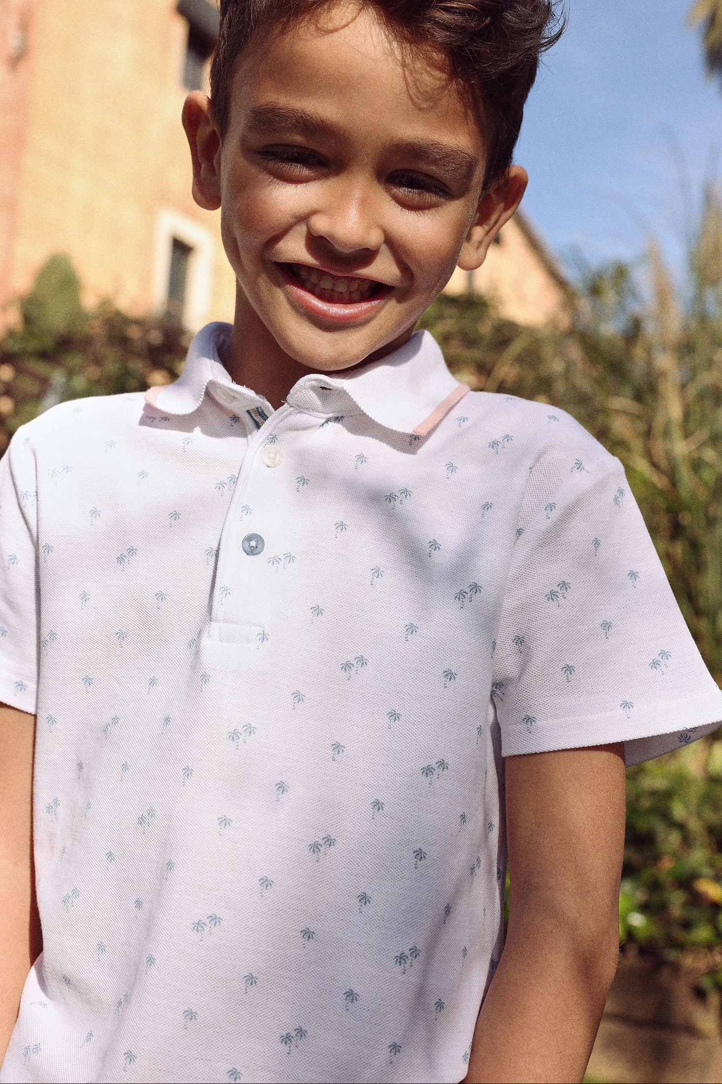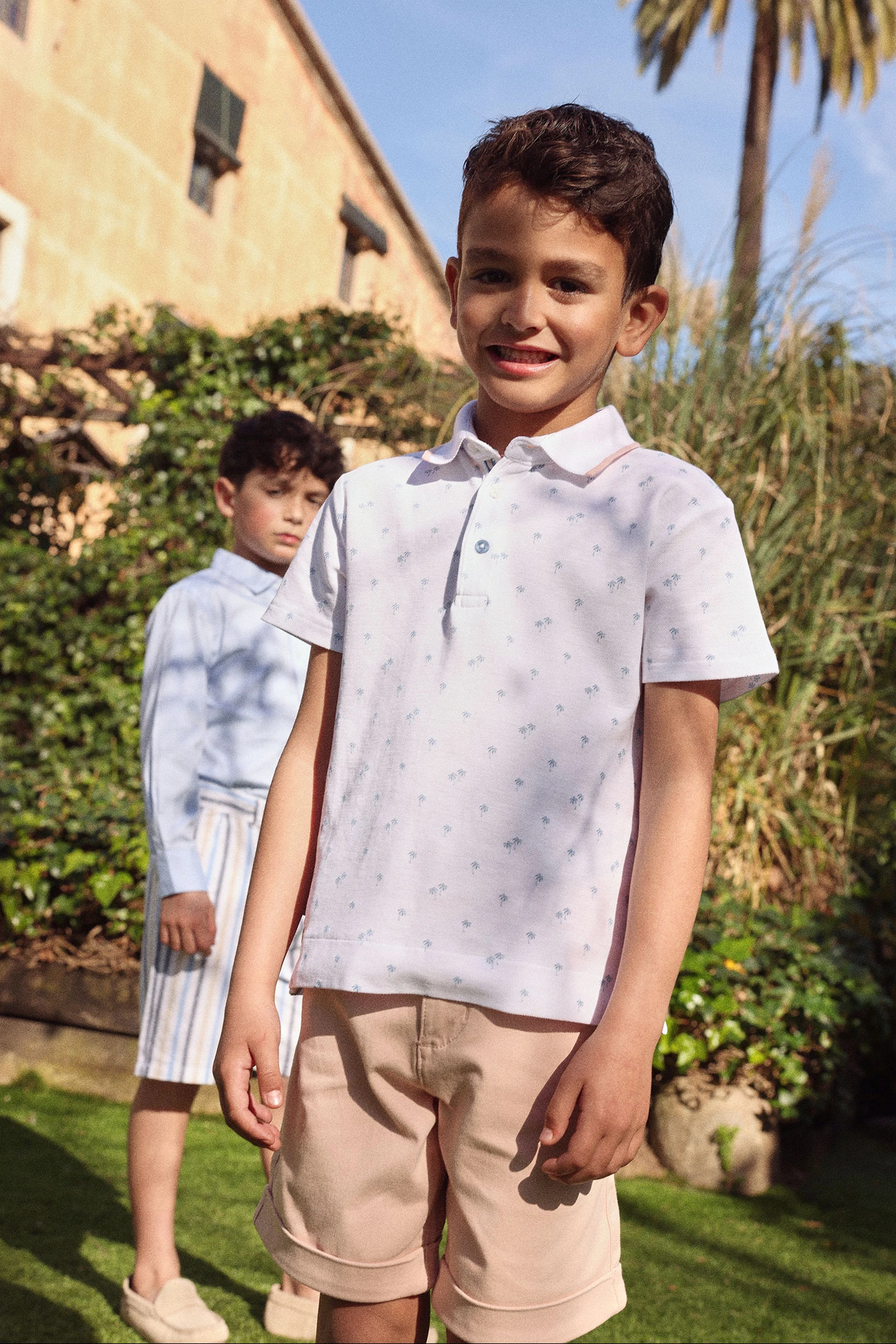 Polo per a nen confeccionat en cotó d'alta qualitat, assegurant comoditat i transpirabilitat. Presenta un estampat subtil de petits motius blaus, donant-li un aire fresc i modern. De color blanc, el seu disseny inclou un coll clàssic amb un toc de color contrastant a la vora, aportant un toc distintiu. Disponible en talles des de 12 mesos fins a 10 anys, és perfecte per a ocasions casuals o semiformals. Combina'l amb pantalons curts o texans per a un look estiuenc i estilós.