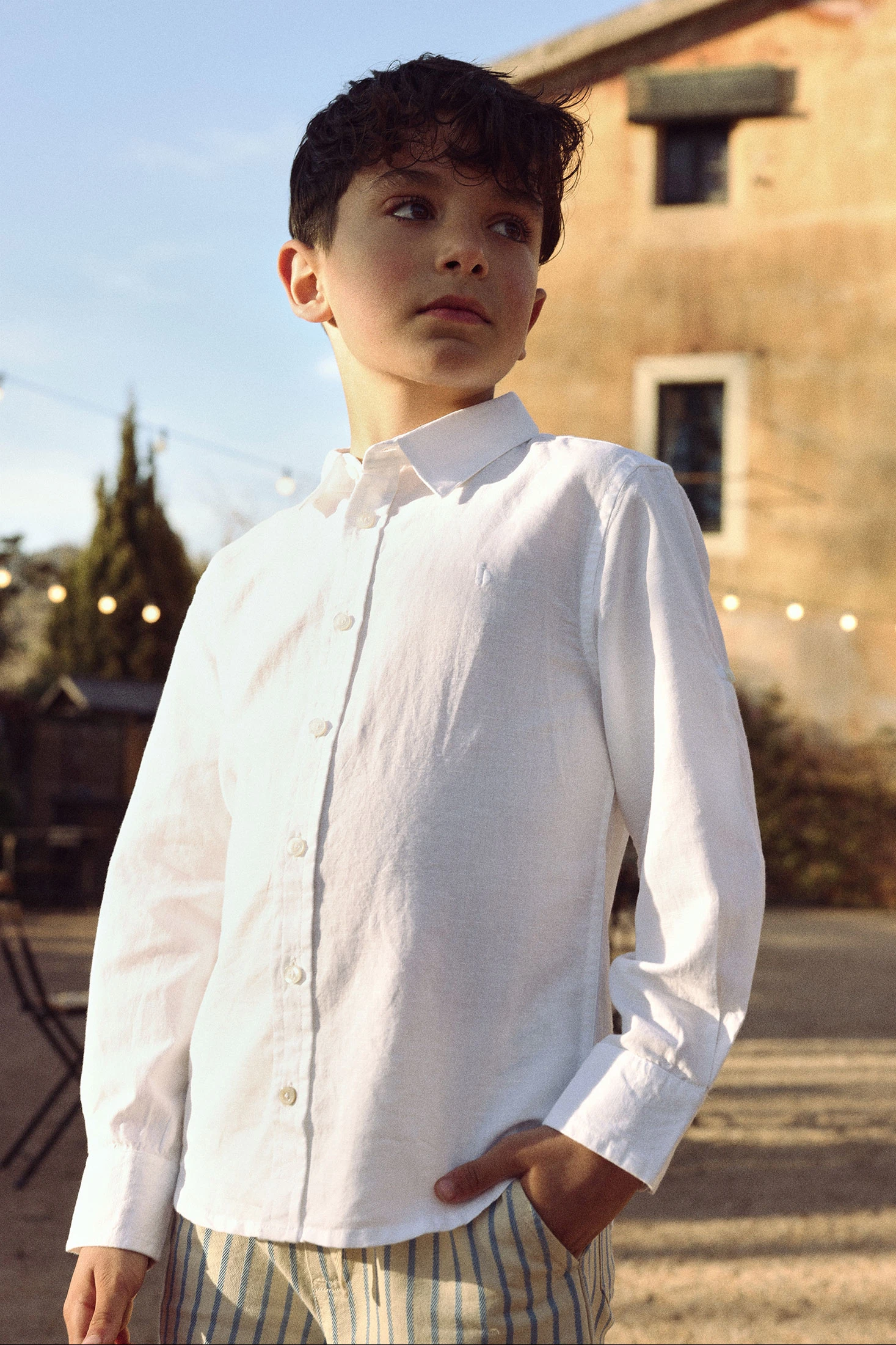 Camisa de lli blanc per a nen, elegant i fresca, ideal per a ocasions especials o el dia a dia. El seu disseny llis i clàssic compta amb un coll tradicional i botons davanters, oferint un estil polit. Les mànigues llargues poden regular-se per a més comoditat. Disponible en talles des de 12 mesos fins a 14 anys, s'adapta al creixement dels nens. El seu color neutre facilita la combinació amb pantalons o shorts de diversos colors, afegint un toc sofisticat a qualsevol vestit.