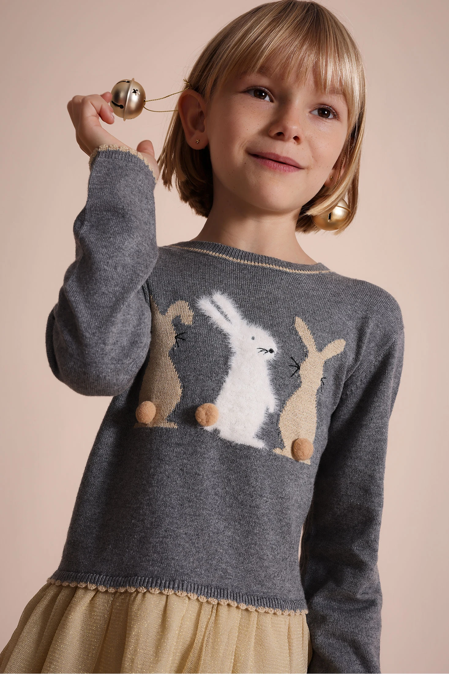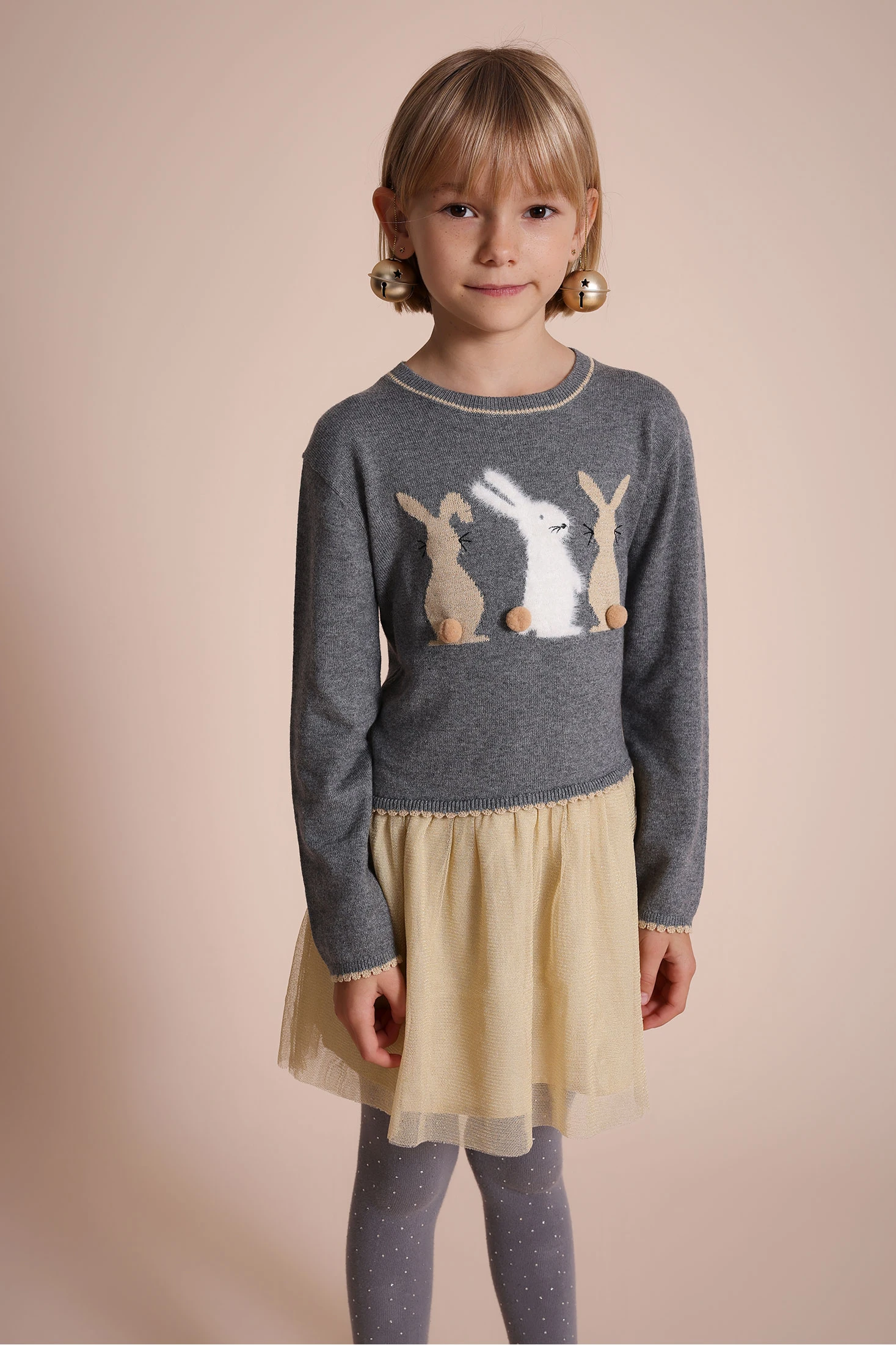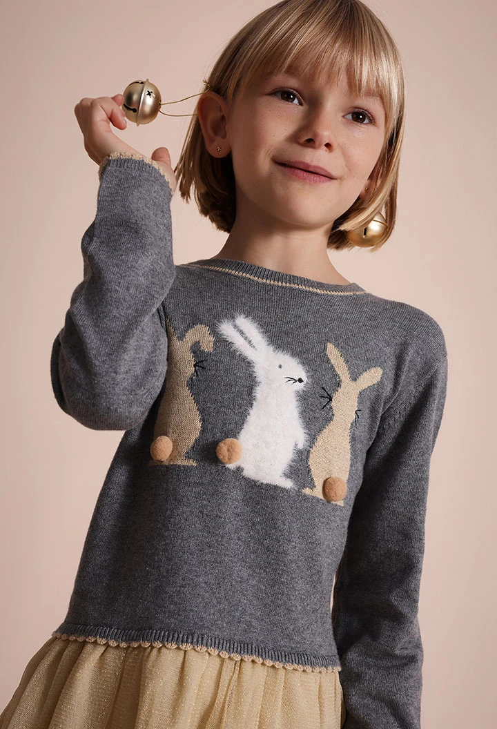 Vestit de punt gris amb disseny de conills, perfecte per als mesos de tardor i hivern gràcies al seu teixit suau i càlid. Un adorable estampat de conills adorna la part superior, aportant un toc de tendresa al conjunt de qualsevol nena. Amb mànigues llargues i coll rodó, garanteix mantenir les petites abrigades en els dies més frescos. Combina-ho amb mitges o leotards per a un look complet. Disponible en talles de 12 mesos a 10 anys, és una opció versàtil i elegant per a diverses ocasions.