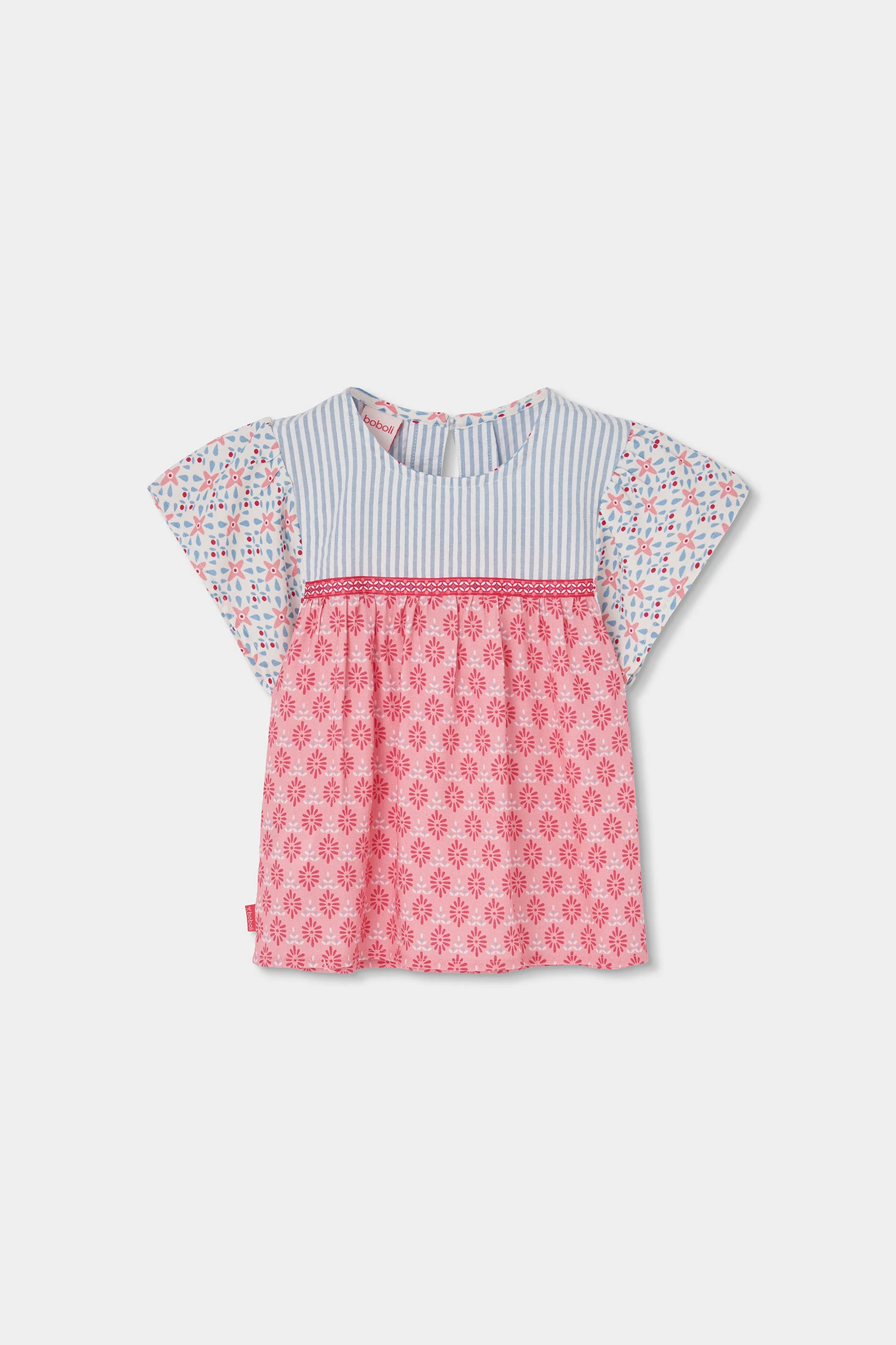 Brusa de popelí estampada ideal per a nenes, ofereix una combinació d'estil i comoditat. Amb un disseny que combina diferents estampats en tons blancs, blaus i roses. El teixit de popelí assegura una textura suau i fresca. Disponible en talles des de 12 mesos fins a 10 anys, és perfecta per a l'estiu. El seu tall ample permet llibertat de moviment, sent una excel·lent opció per combinar amb pantalons curts o faldilles lleugeres, afegint un toc desenfadat i alegre a qualsevol conjunt casual.