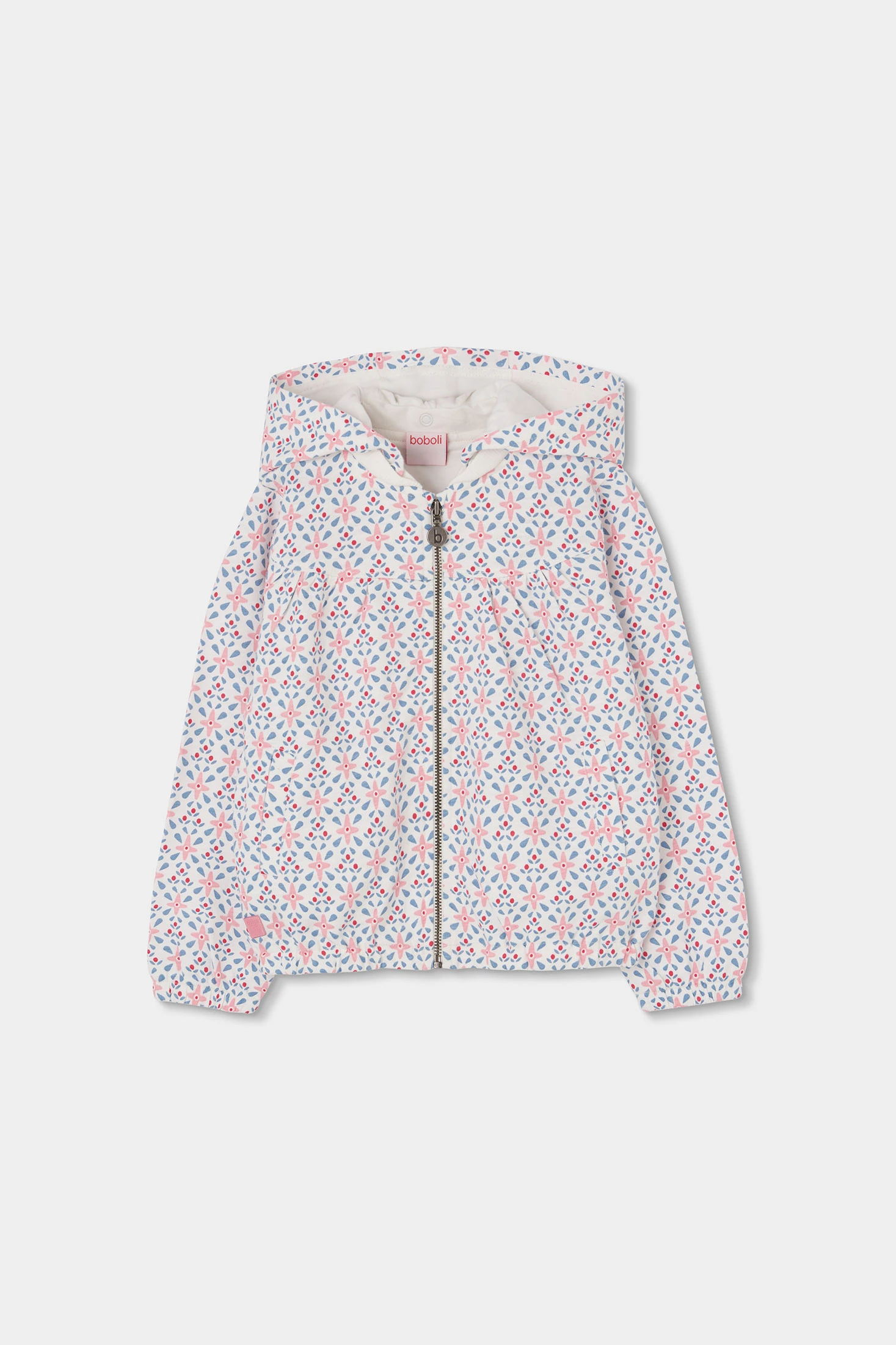 Jaqueta de pelfa per a nena. Presenta un estampat acolorit en tons blaus i roses sobre fons blanc. El seu tancament és de cremallera i el disseny inclou una caputxa desmuntable. Està disponible en talles des dels 12 mesos fins als 10 anys. Amb les seves mànigues llargues, és ideal per combinar amb pantalons i faldilles, afegint un toc alegre a l'armari de qualsevol nena.