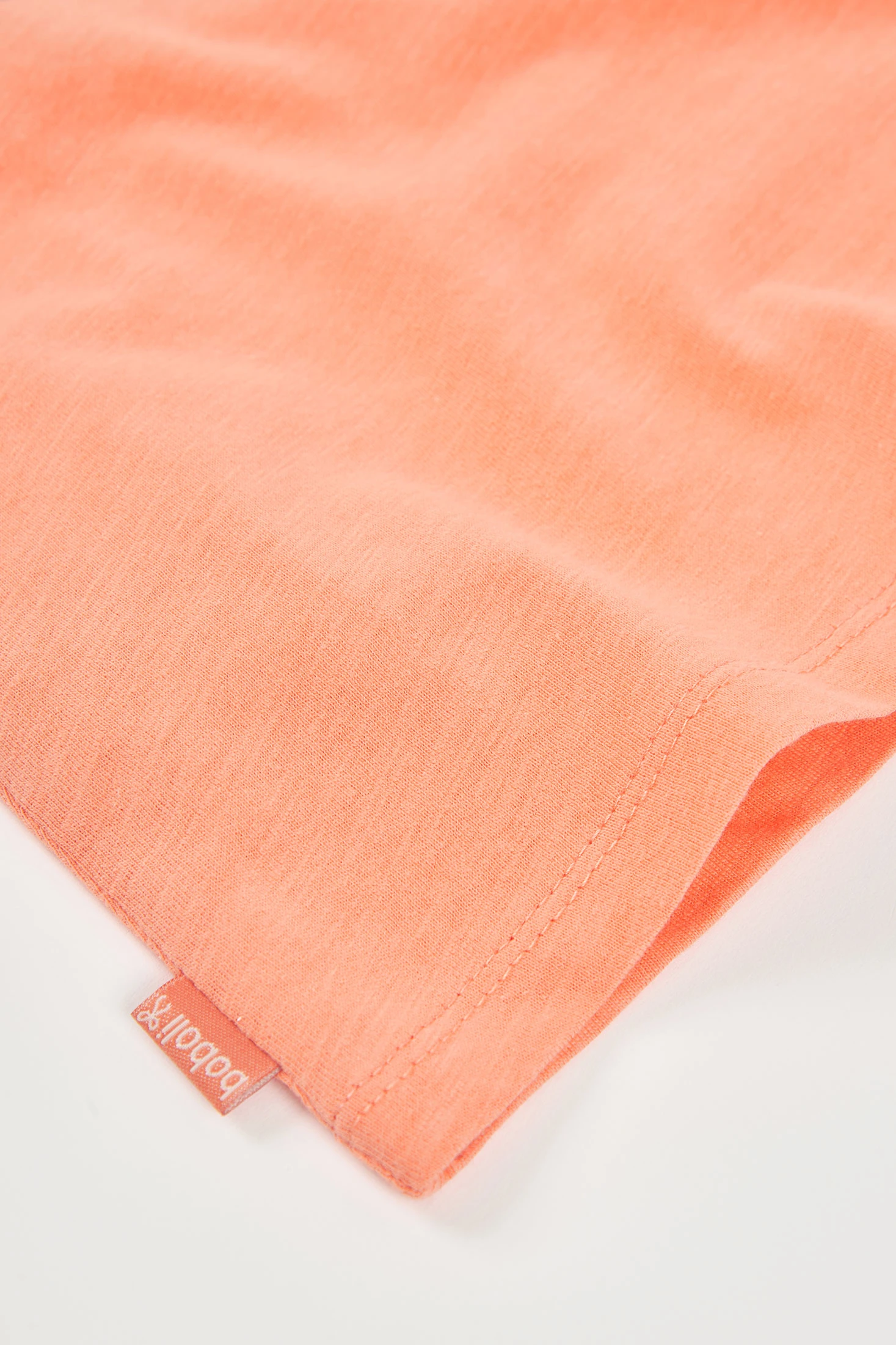 Samarreta de cotó per a nena en color taronja, perfecta per al dia a dia. El disseny presenta un estampat de flors acolorides que afegeixen un toc alegre i divertit. Les mànigues són curtes amb un detall arrugat. Disponible en talles des de 12 mesos fins a 10 anys, s'ajusta còmodament al creixement de la nena. Ideal per a combinar amb faldilles o pantalons en dies càlids, aquesta samarreta destaca per la seva suavitat i estil encantador.