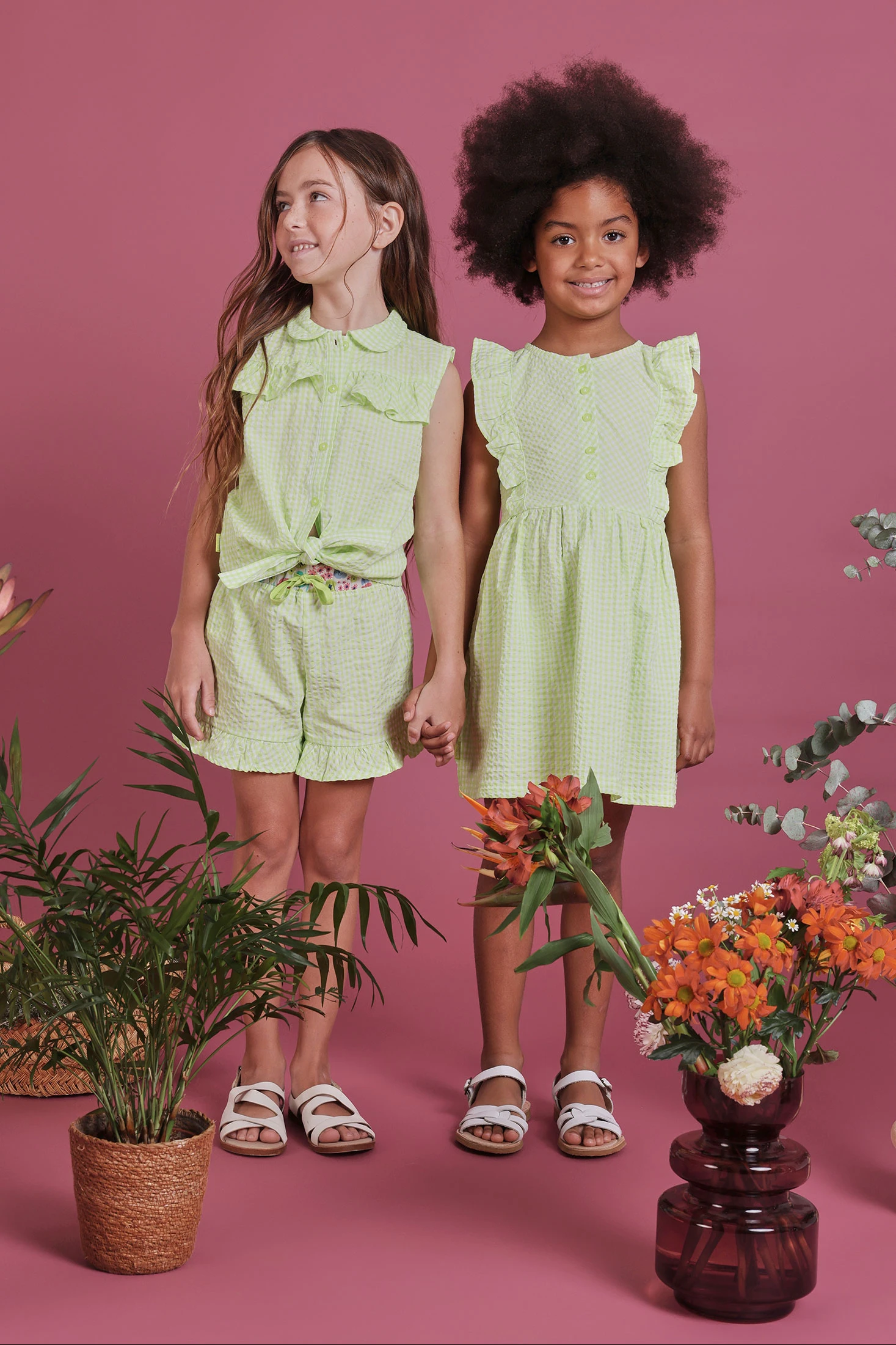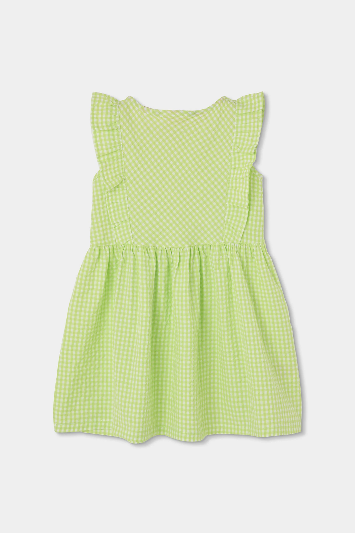 Vestit de popelí de quadres vichy en color llima i perla. Disponible en talles des dels 12 mesos fins als 10 anys. El disseny sense mànigues inclou volants a les espatlles, aportant un toc encantador i fresc. Amb botons a la part frontal per a un ús fàcil, resulta perfecte per als dies càlids. L'estampat de quadres li dóna un estil clàssic i versàtil, ideal per combinar en diferents ocasions. El material de popelí ofereix frescor i comoditat, assegurant que la teva petita se senti còmoda en tot moment.