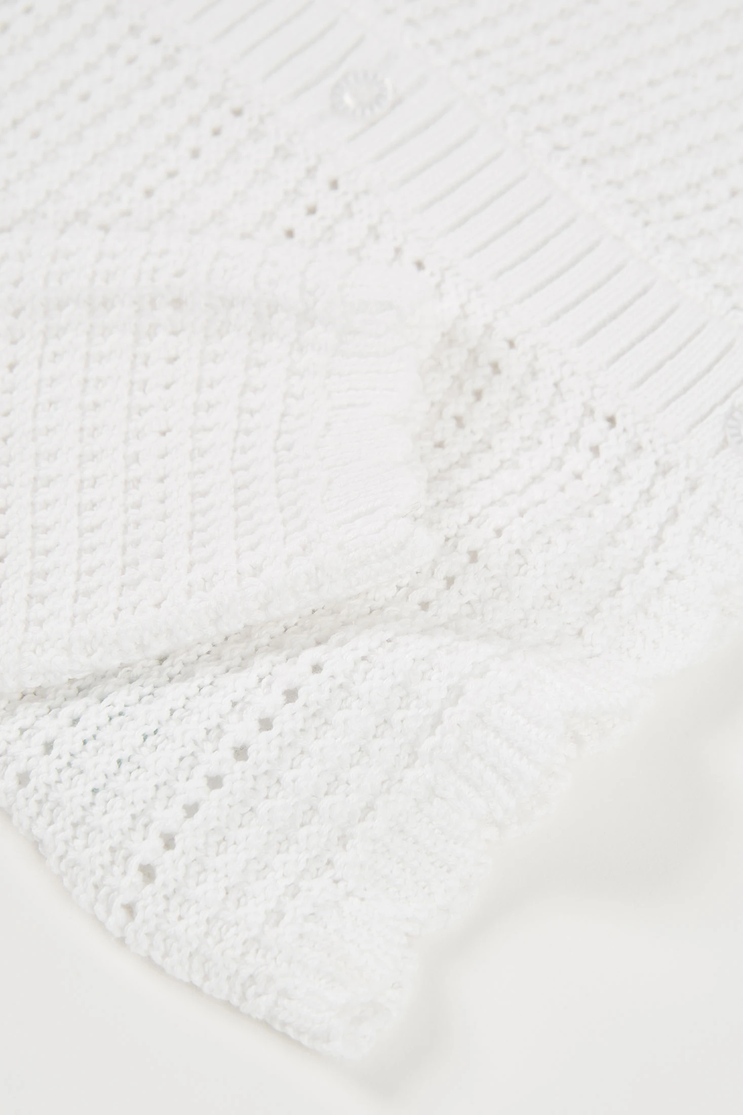 Jaqueta de punt blanca per a nena, perfecta per a les temporades més fresques. Feta d'un teixit suau, ofereix comoditat i calidesa. Destaca un disseny de flor acolorida al pit que afegeix un toc divertit i femení. La jaqueta té un tancament de botons, que en facilita l'ús. Està orientada a nenes de 12 mesos fins a 14 anys. Es pot combinar fàcilment amb texans o faldilles per a un look casual i abrigat.