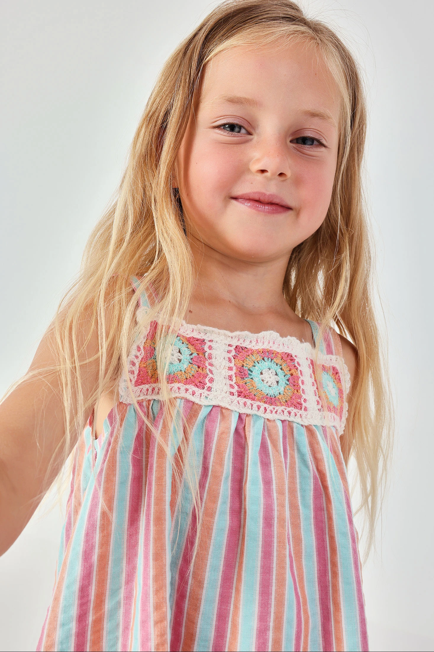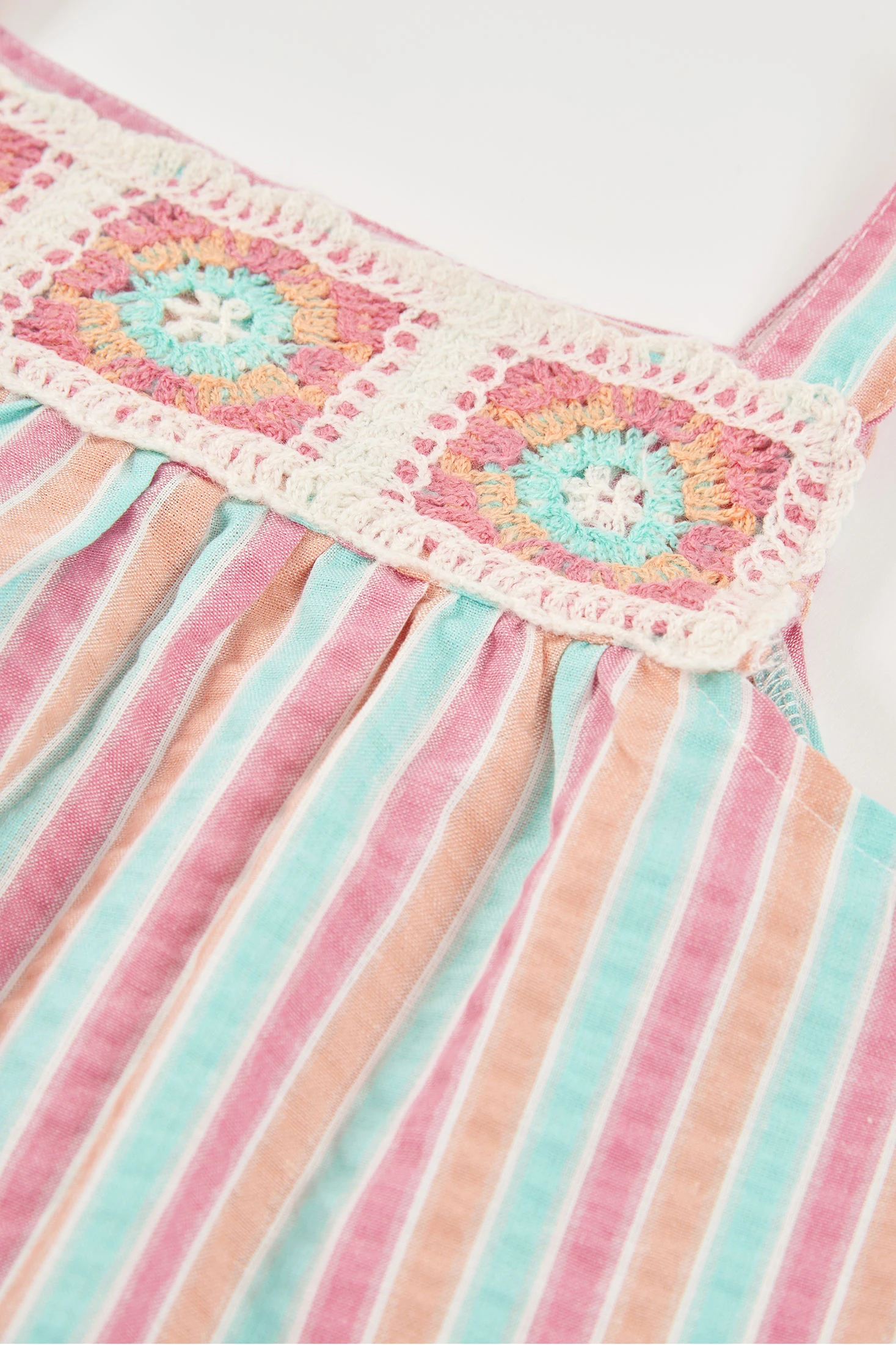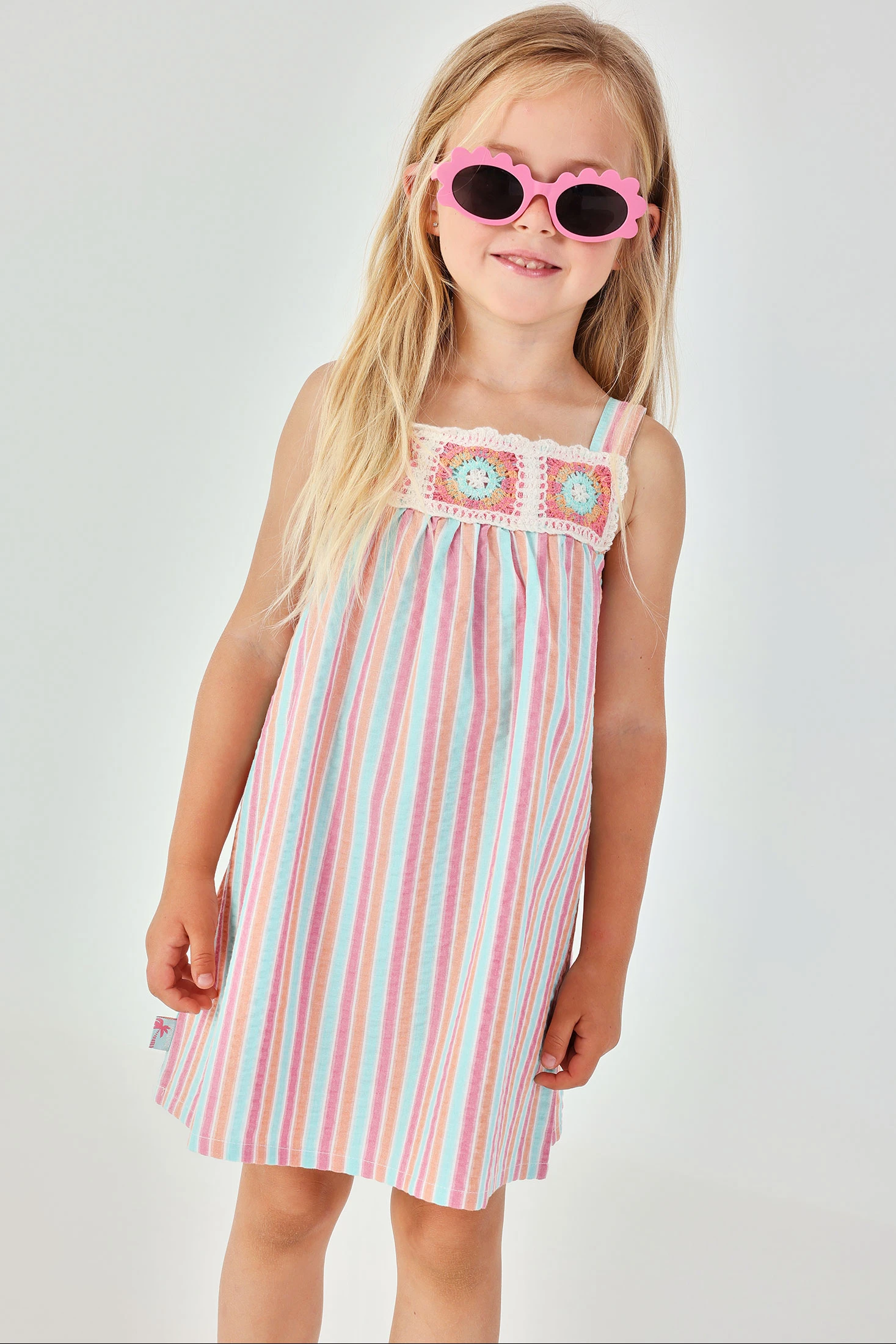 Vestit de popelina a ratlles perfecte per a nenes, disponible en talles des de 12 mesos fins a 10 anys. Amb un disseny de ratlles en tons pastel de rosa, blau i blanc, el vestit és fresc i encantador. La part superior compta amb detalls de ganxet que li afegeixen un toc bohemi, mentre que el seu tall solt garanteix comoditat. Ideal per a dies assolellats, és una opció versàtil i estilosa. Perfecte per combinar amb accessoris senzills i gaudir d'un look estiuenc i divertit.