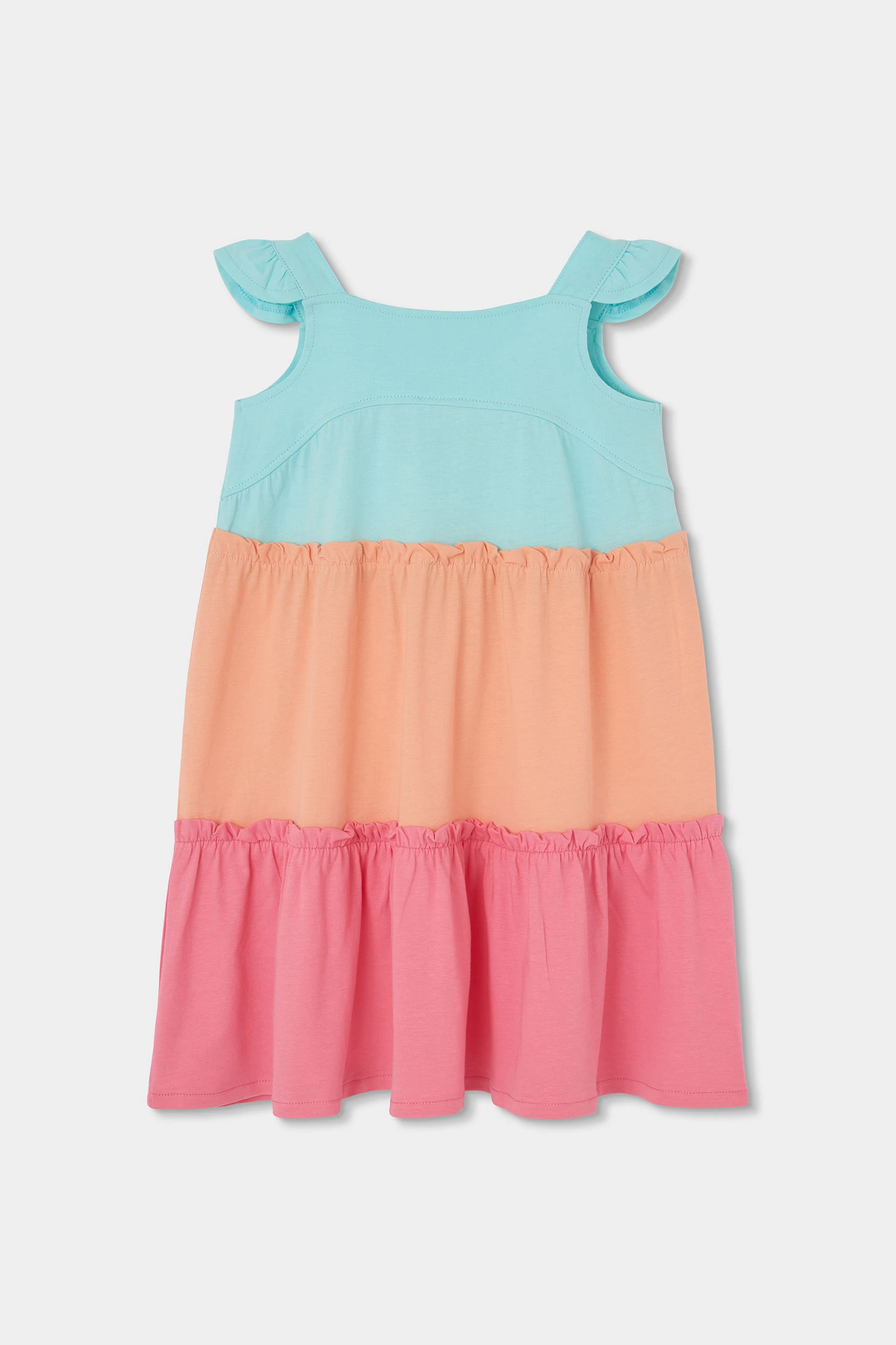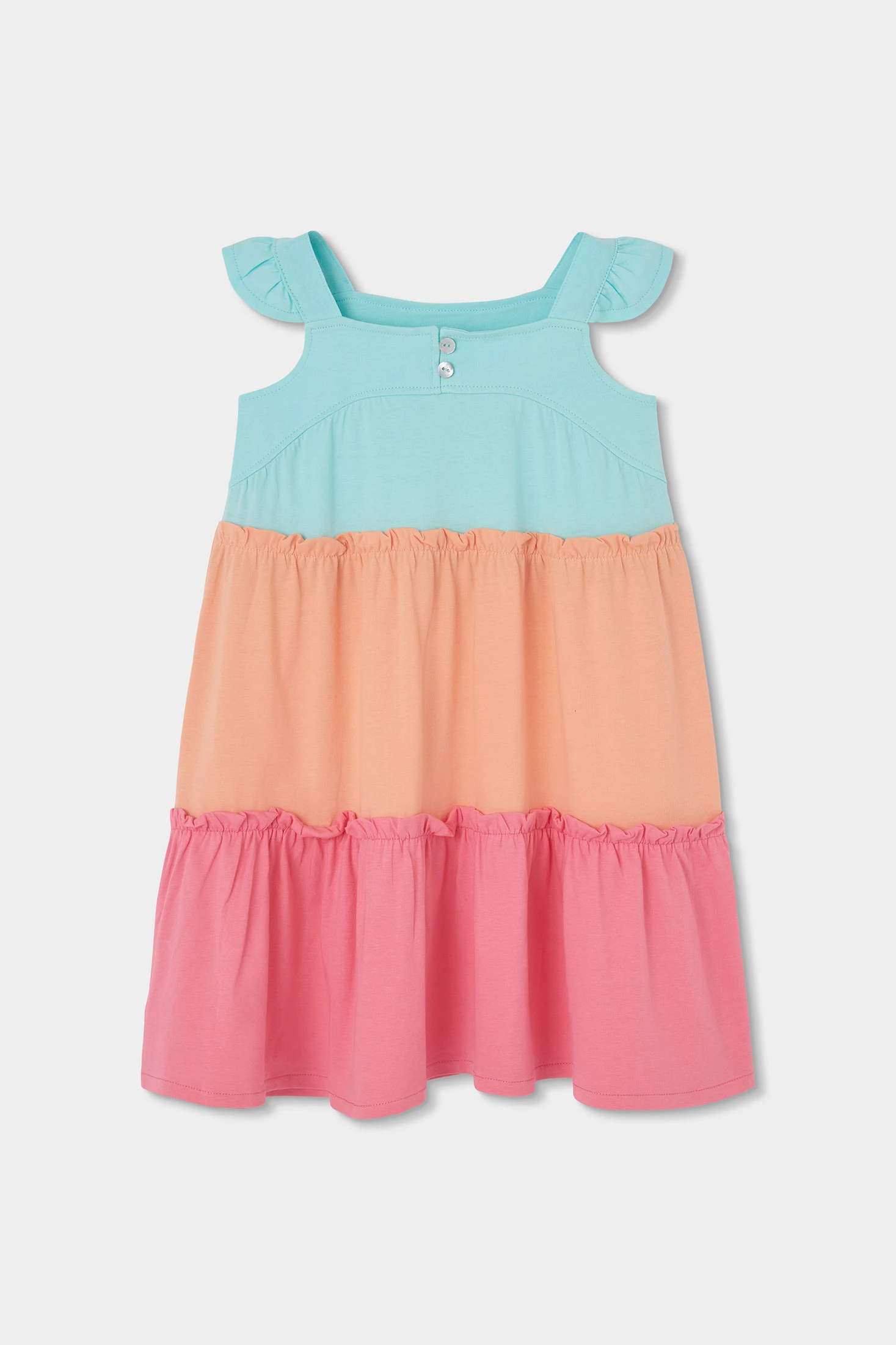 Vestit de punt multicolor per a nena, perfecte per a ocasions casuals i dies assolellats. Confeccionat en un material suau i còmode, presenta un disseny en blocs de color turquesa, préssec i rosa que el fa vibrant i alegre. Sense estampats, el seu disseny és senzill però eficaç. Ideal per a edats des de 12 mesos fins a 10 anys, compta amb tirants i un tall ampli, que ofereix frescor i llibertat de moviment. Versàtil per combinar amb accessoris simples per a un look d'estiu complet.