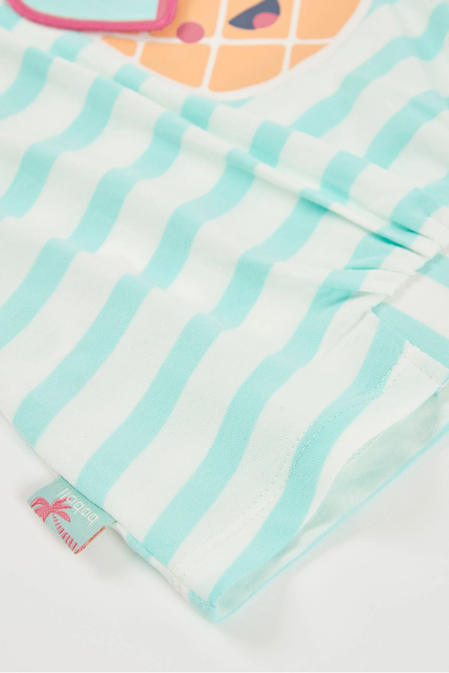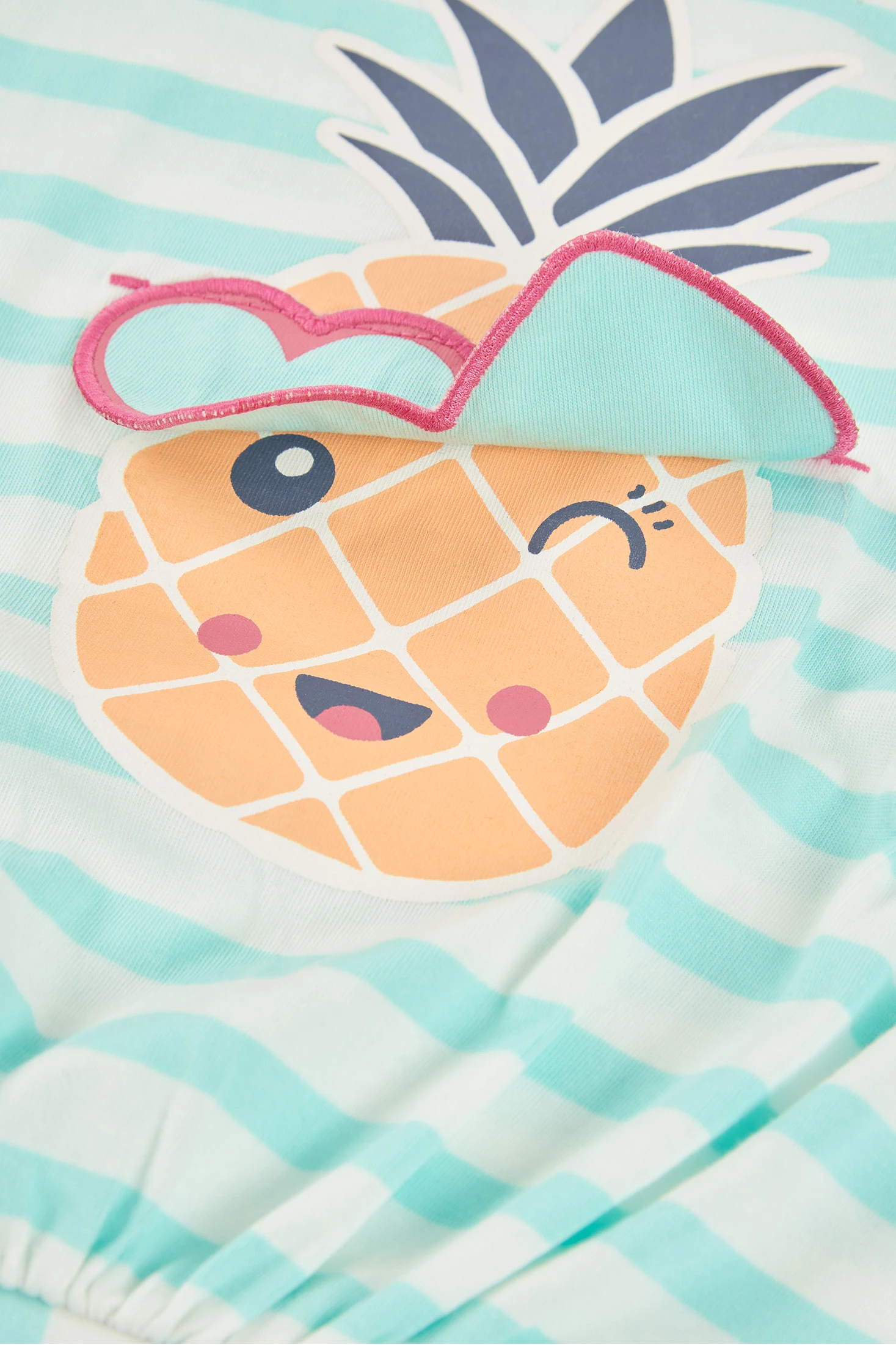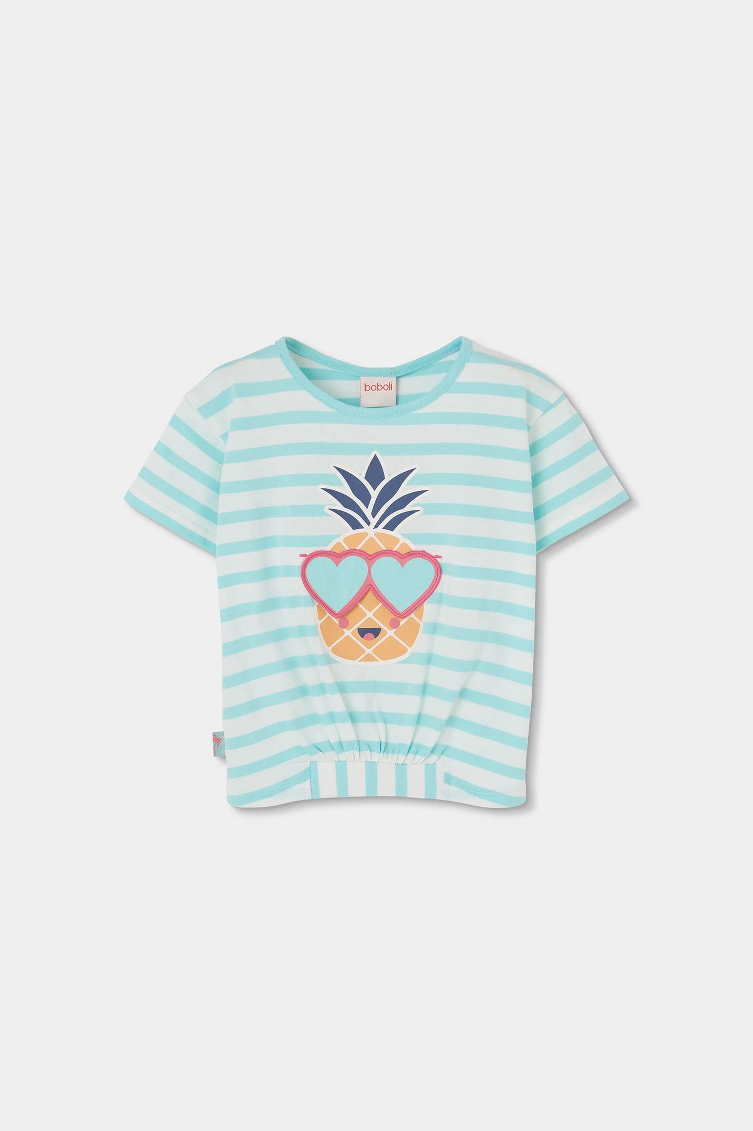 Samarreta de cotó per a nena amb un encantador disseny a ratlles en tons turquesa i blanc, ideal per al dia a dia. Incorpora un divertit estampat d'una pinya amb ulleres de cor, aportant un toc alegre. El seu teixit de cotó ofereix comoditat i frescor, perfecta per a climes càlids. Disponible en talles des de 12 mesos fins a 10 anys. Les mànigues curtes i el coll rodó ofereixen un estil versàtil que combina fàcilment amb shorts o faldilles, sent una opció pràctica i estilosa per a qualsevol ocasió informal.