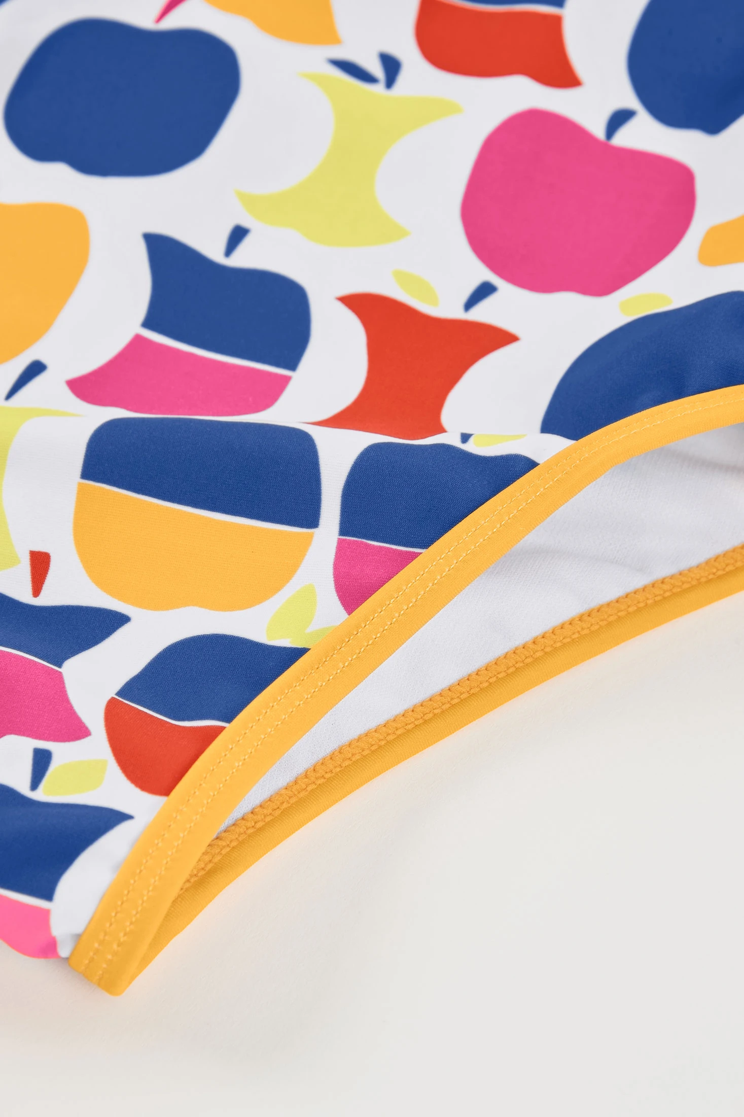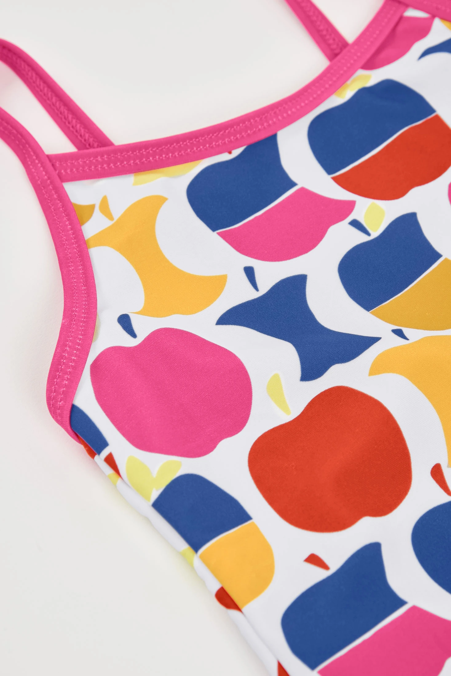 Banyador per a nena amb protecció solar certificada UPF50+, amb un vibrant estampat de pomes en rosa, blau i groc sobre fons blanc. Els tirants fins en rosa afegeixen un toc d'estil addicional. Fabricat en material suau i resistent, ofereix comoditat i llibertat de moviment per a l'ús freqüent a la piscina o la platja. Disponible en talles des dels 12 mesos fins als 14 anys.
