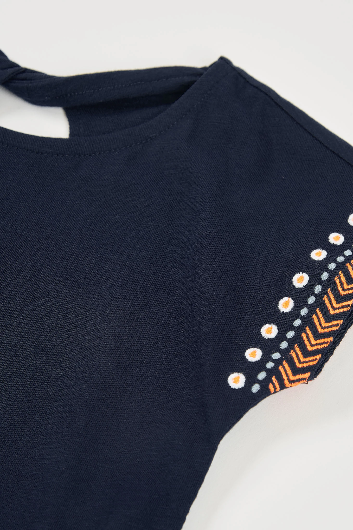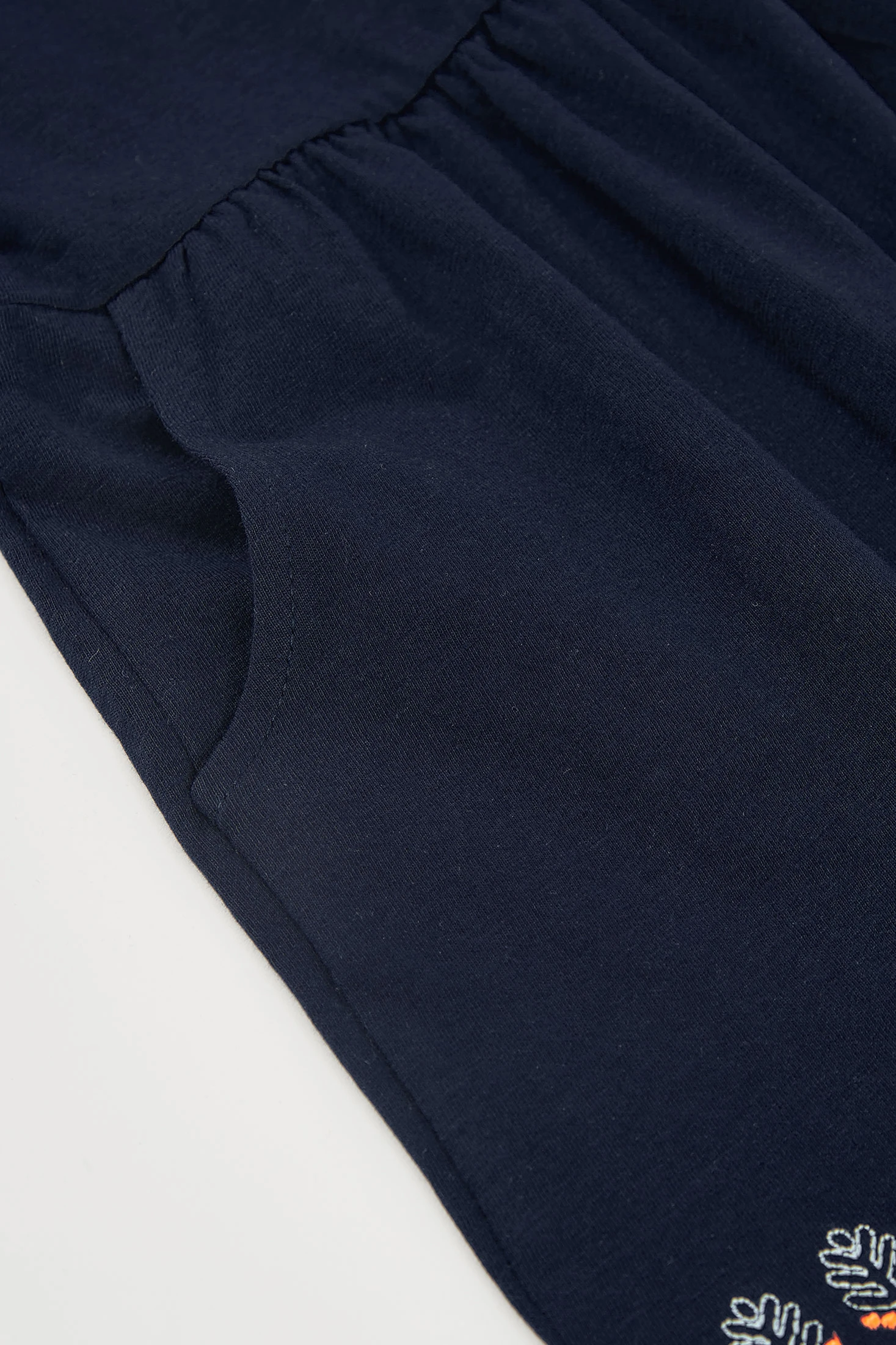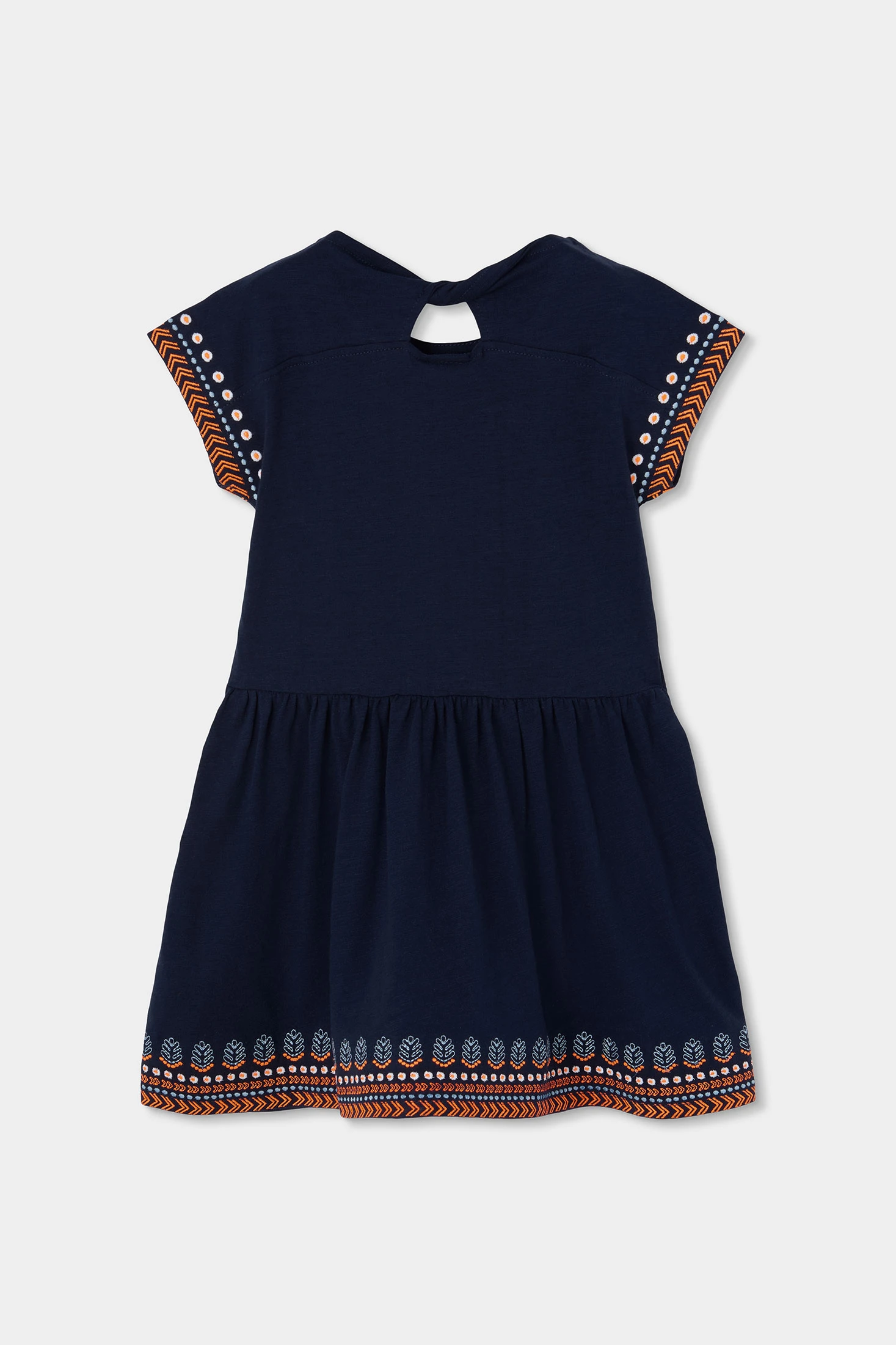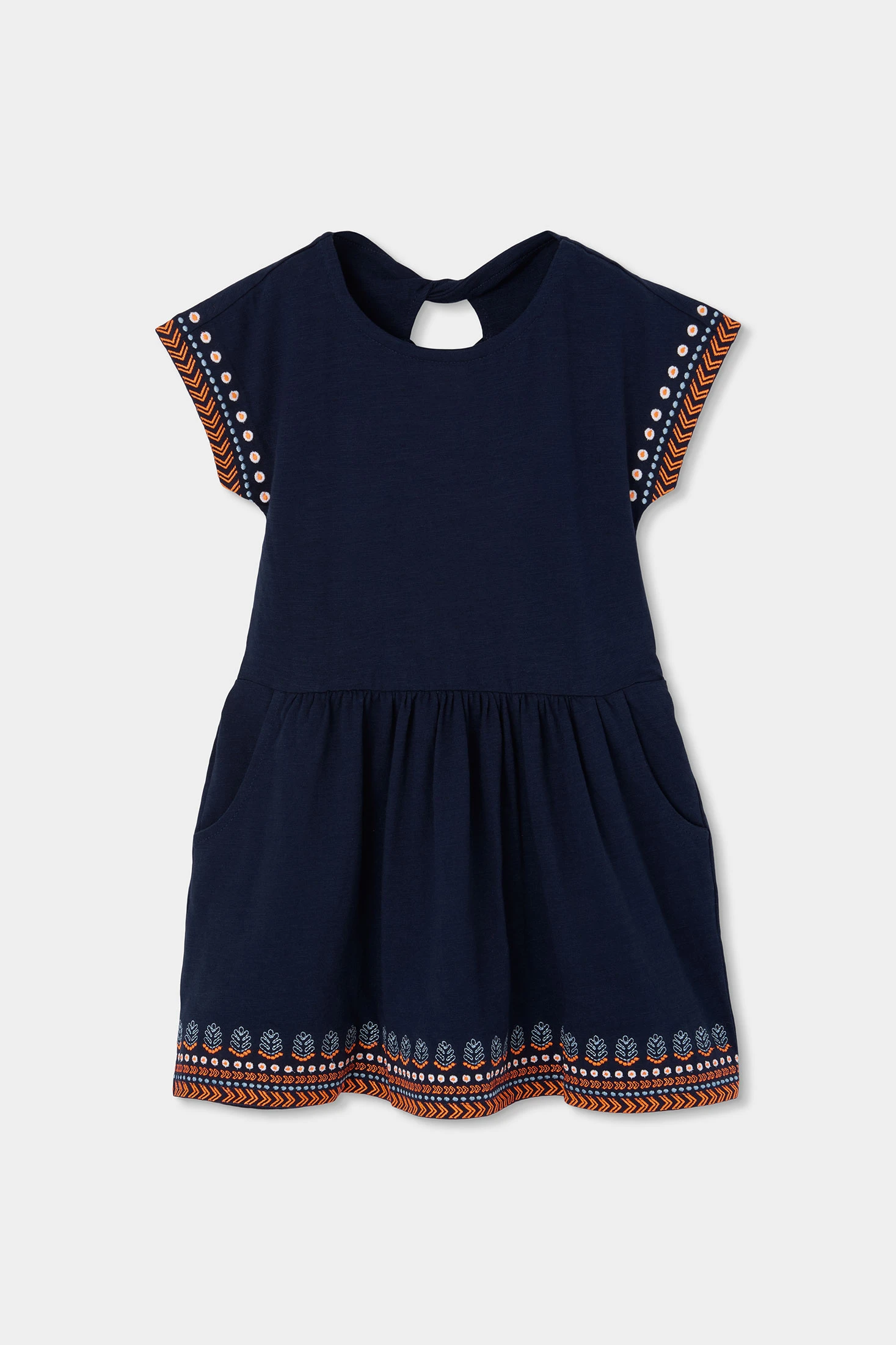 Vestit de punt blau marí per a nena, ideal per a edats de 12 mesos a 14 anys. Presenta un disseny amb detalls brodats a les mànigues i l'orl que li afegeixen un toc encantador i únic. Fabricat en un teixit suau i còmode, és perfecte per a l'ús diari. Les seves mànigues curtes i el coll rodó aporten frescor i estil, mentre que les butxaques laterals n'augmenten la funcionalitat. Aquest vestit es pot combinar fàcilment amb malles o jaquetes per a un look versàtil en qualsevol temporada.