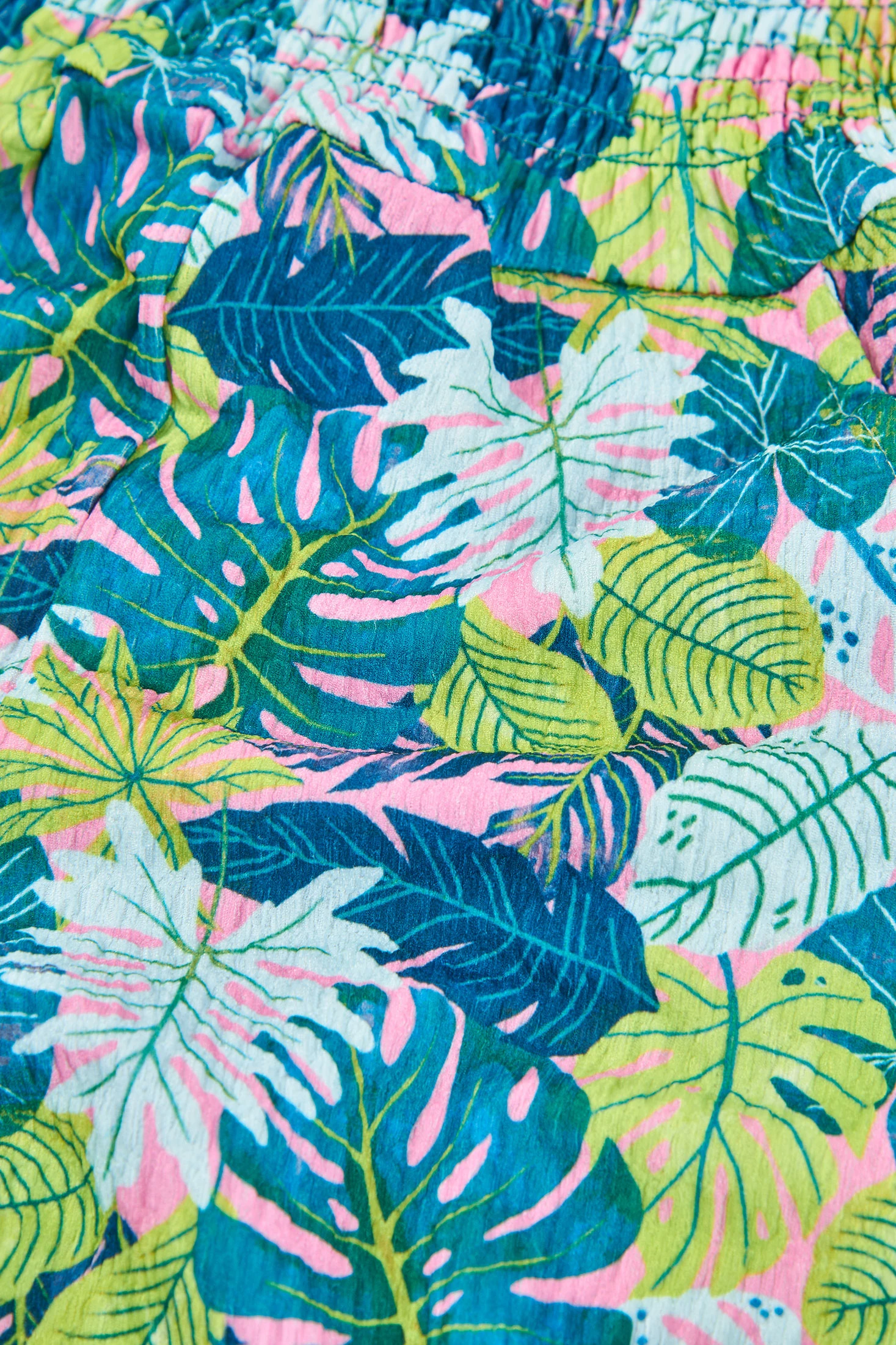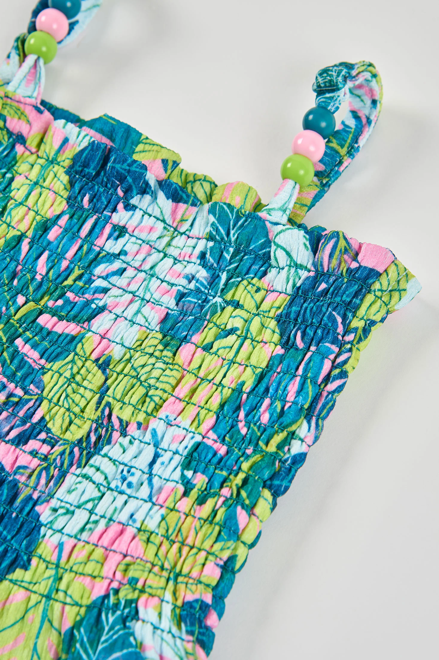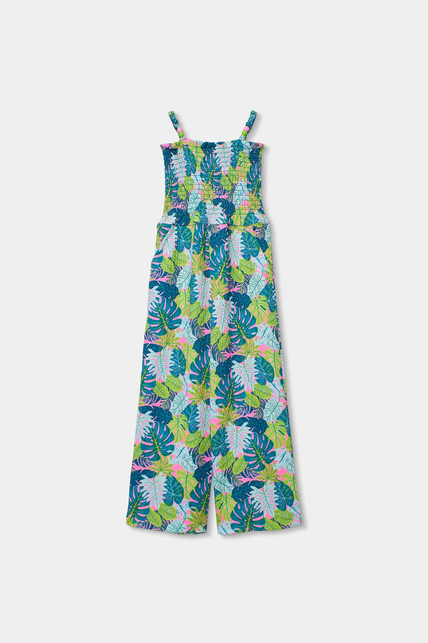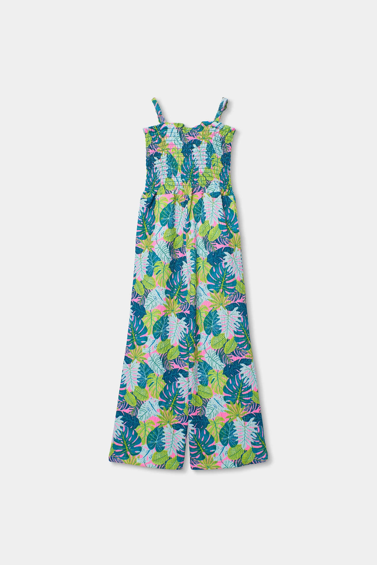 Granota de tirants en punt fantasia, perfecta per a un estil còmode i fresc. Compta amb un disseny senzill i un estampat en peça tropical de fulles en colors verds i fons rosa clar. Els tirants són fins del mateix estampat que la peça i porten unes boletes de colors com a detall. Les talles estan disponibles des dels 2 anys fins als 14 anys. Una opció molt acolorida i divertida per al vestuari infantil.