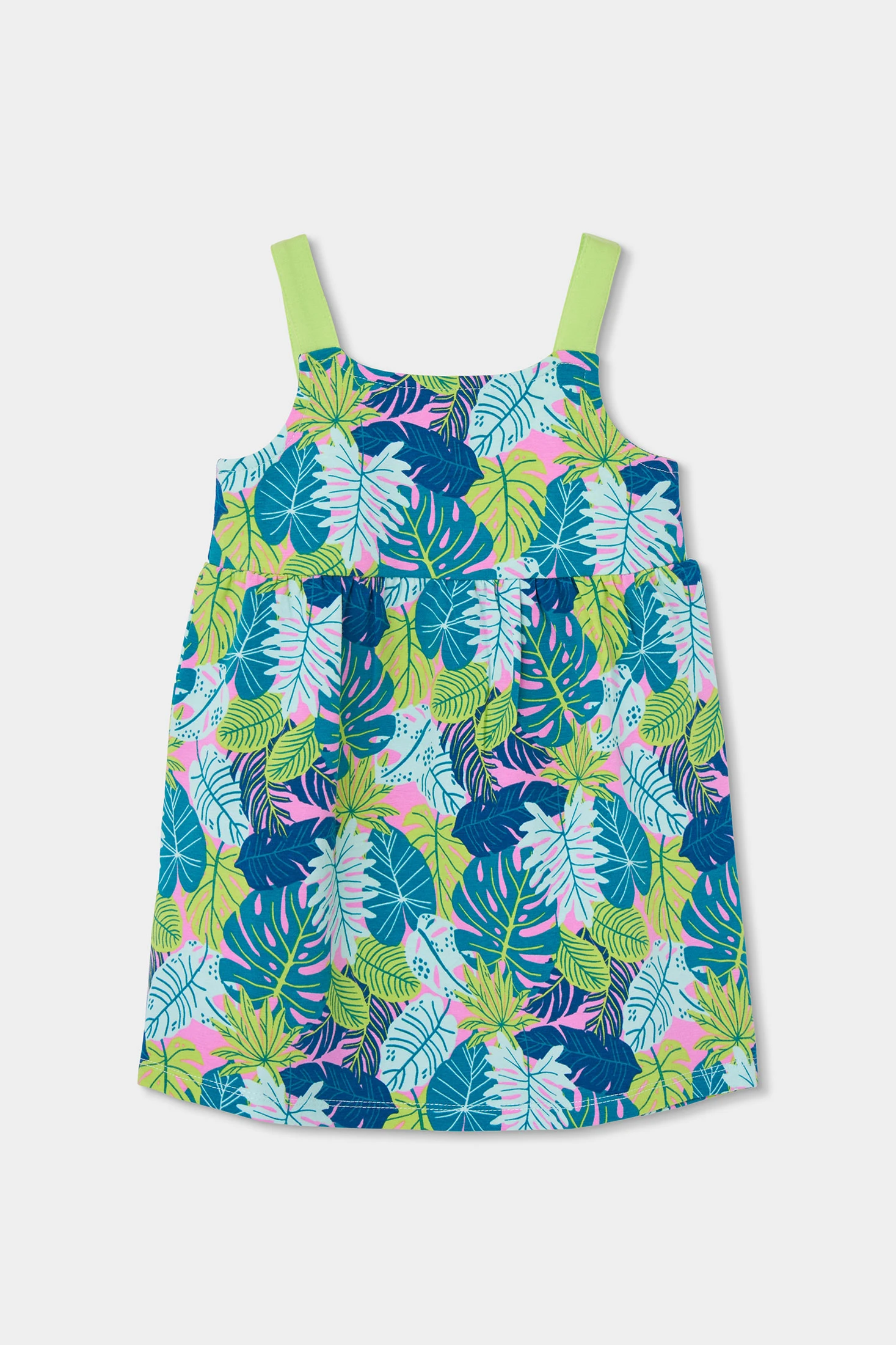 Vestit per a nena de color verd amb estampat, perfecte per a la temporada de primavera i estiu. Fet amb teixit de punt lleuger i fresc que proporciona comoditat durant tot el dia. El seu disseny alegre i el tall fluid el converteixen en una opció ideal tant per a passejos com per a esdeveniments informals. Disponible en talles de 2 a 14 anys.