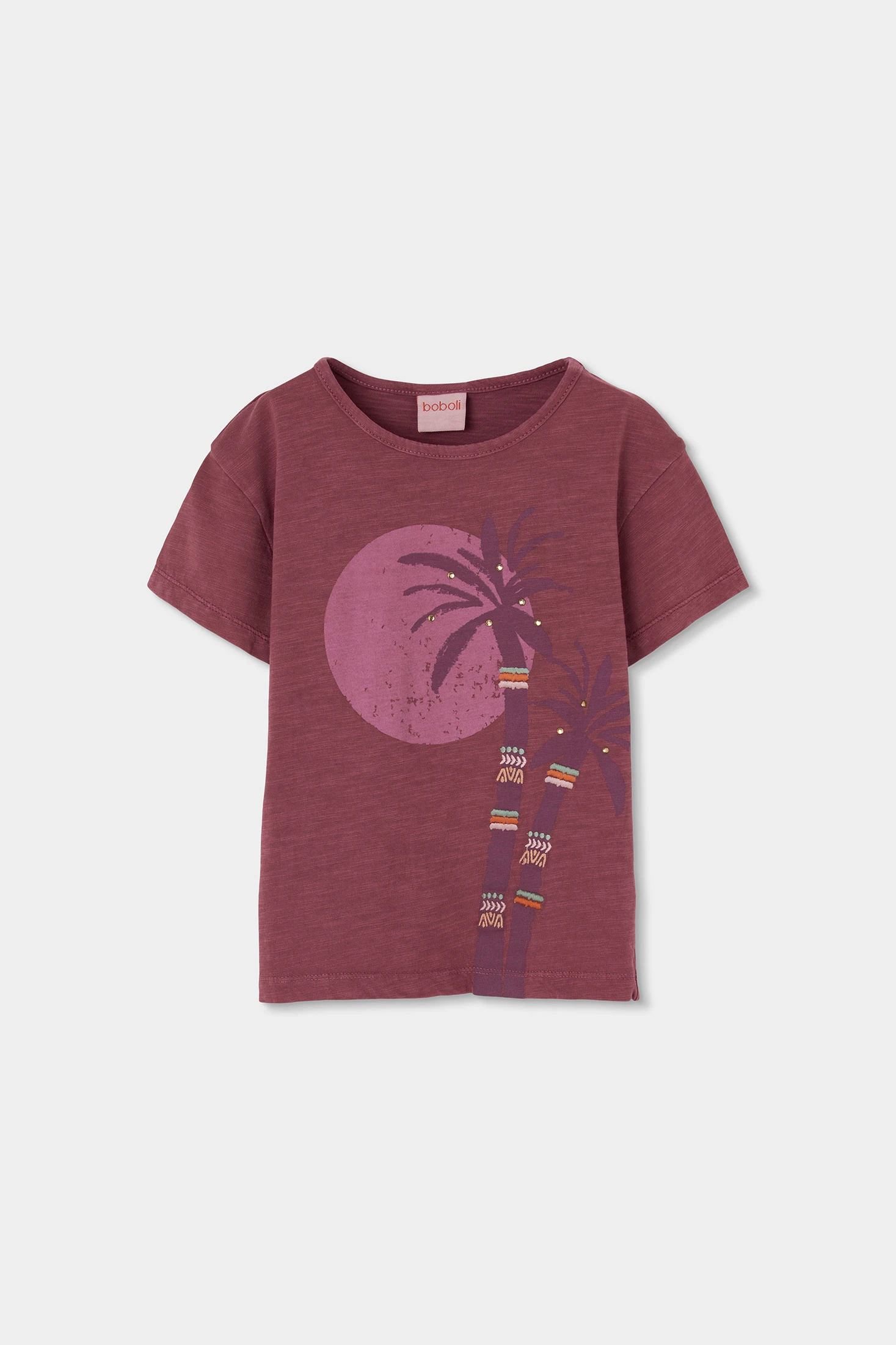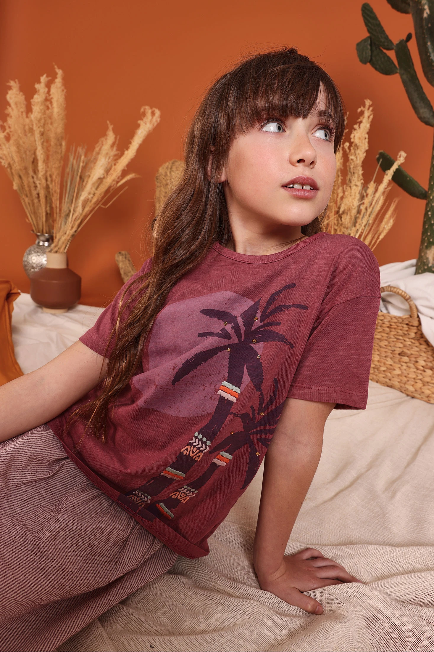 Samarreta de cotó per a nena, en un suau to pruna, perfecta per a l'ús diari. El disseny presenta un estampat de palmeres que afegeix un toc tropical i divertit. Amb coll rodó i mànigues curtes, és ideal per a les estacions més càlides. Disponible en talles des dels 2 anys fins als 14 anys, s'adapta al creixement de les nenes. El seu teixit de cotó és còmode i transpirable, assegurant una sensació de suavitat en contacte amb la pell. Peça versàtil que pot combinar-se amb una faldilla o pantalons per a un estil