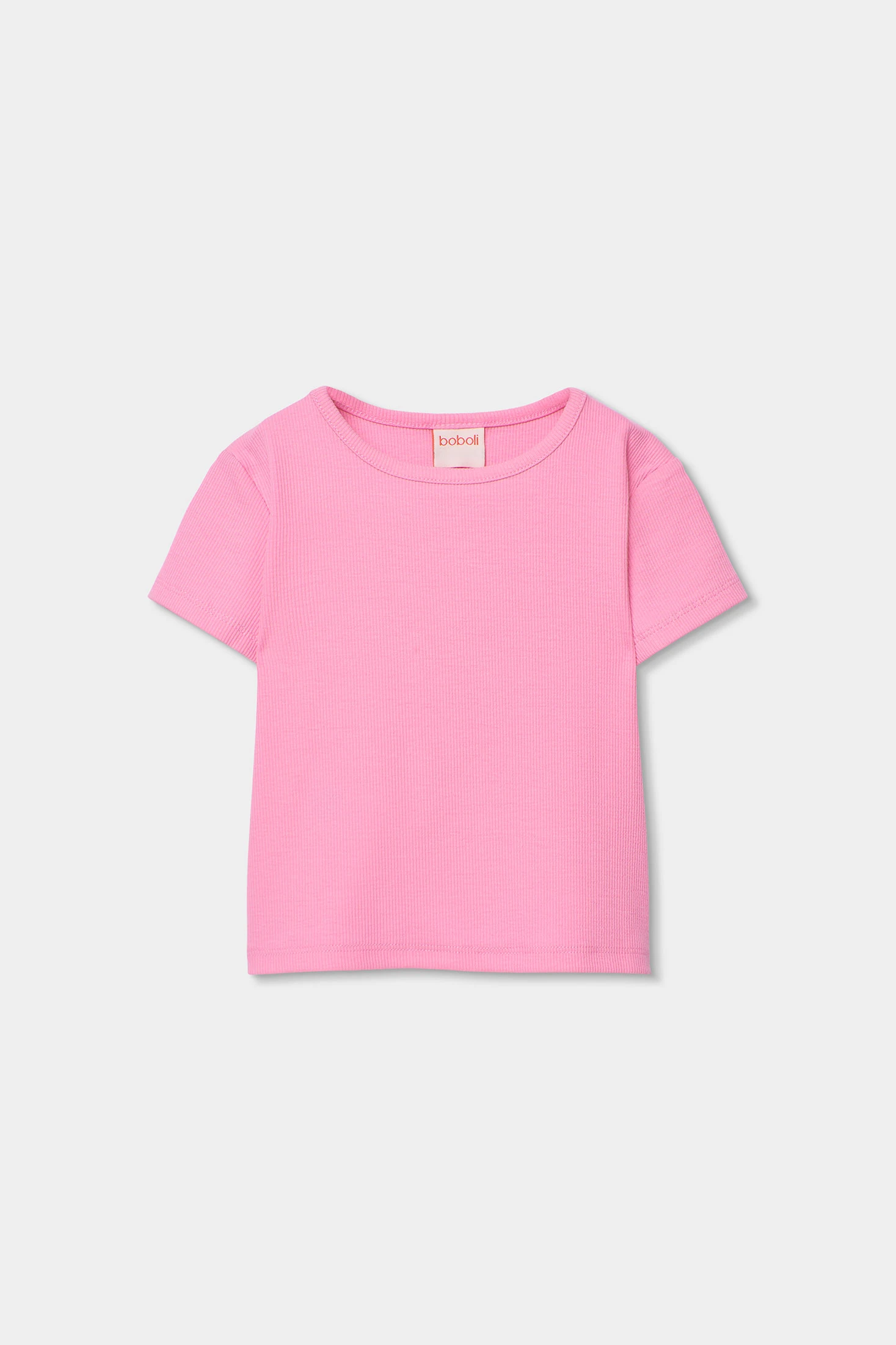 Samarreta de punt canalé rosa per a nena perfecta per al dia a dia. El seu disseny llis i color vibrant la fan versàtil i atractiva. El material suau garanteix comoditat durant tot l'any. Ideal per a nenes des de 12 mesos fins a 14 anys, adaptant-se al seu creixement. Amb un tall clàssic de coll rodó i mànigues curtes, és perfecta per combinar amb faldilles o pantalons en climes càlids. Peça essencial en el vestuari, aportant un toc de frescor i estil casual.