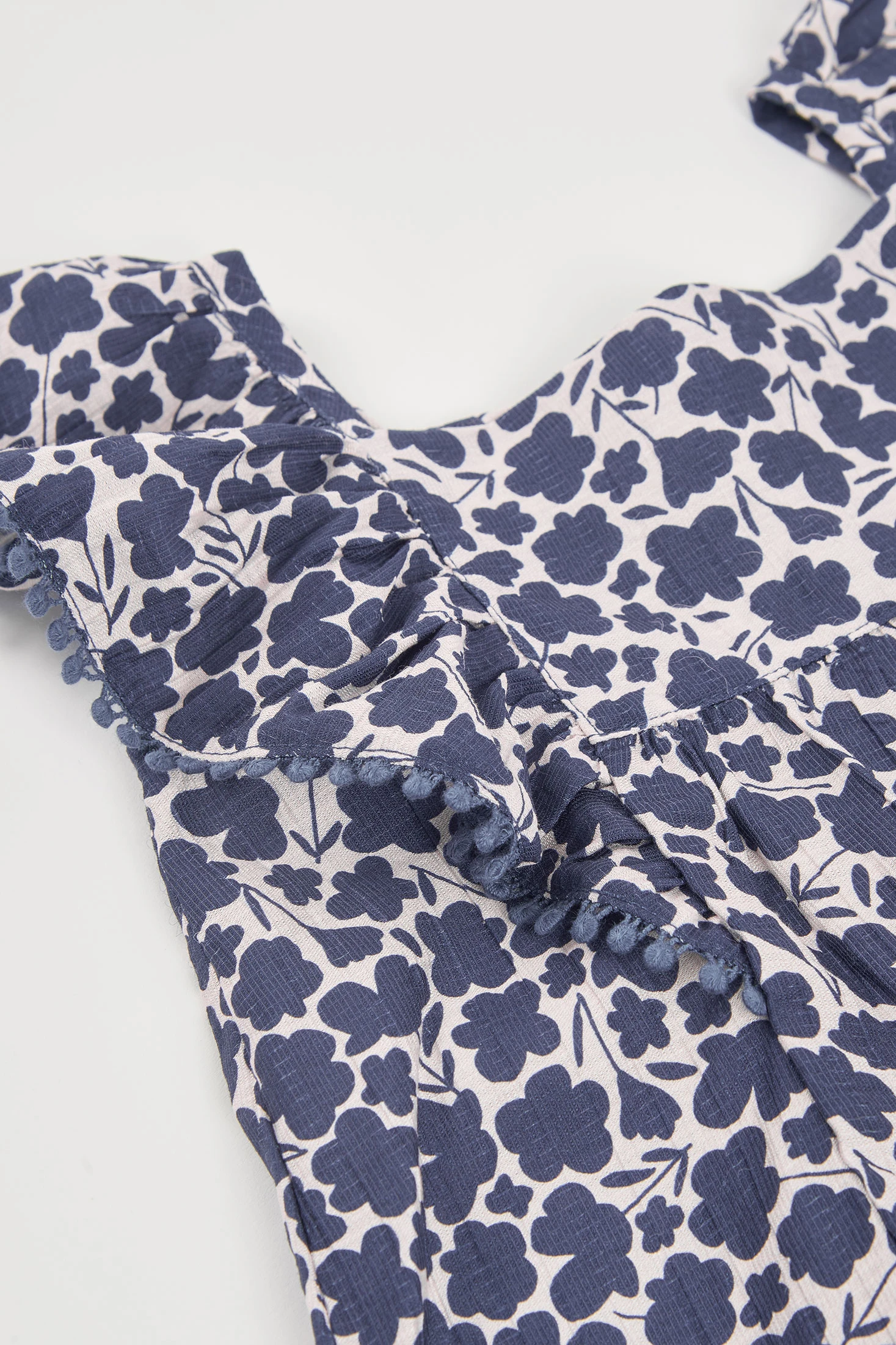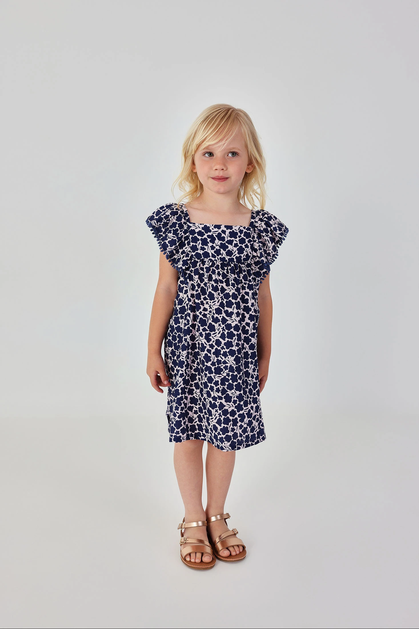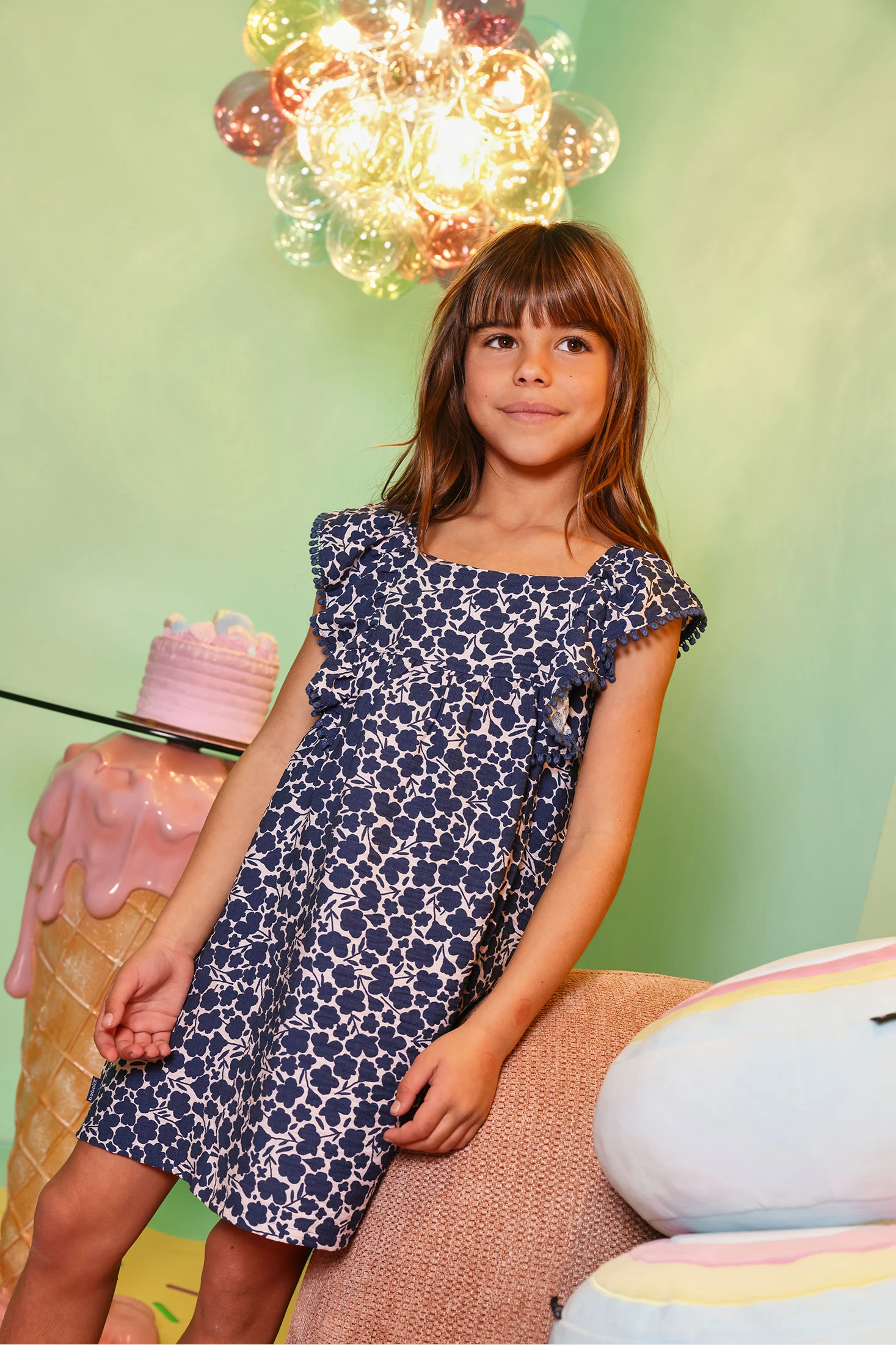 Vestit per a nena amb estampat floral en tons blau marí, ideal per a un look fresc i encantador. Tirants gruixuts amb volants afegeixen un toc femení i elegant. Confeccionat en un material lleuger i còmode, perfecte per mantenir la frescor en dies calorosos. Les talles disponibles van des de 12 mesos fins als 10 anys, adaptant-se al creixement de les petites. Ideal per a ocasions especials o per a l'ús diari, ofereix versatilitat i estil a qualsevol vestuari.