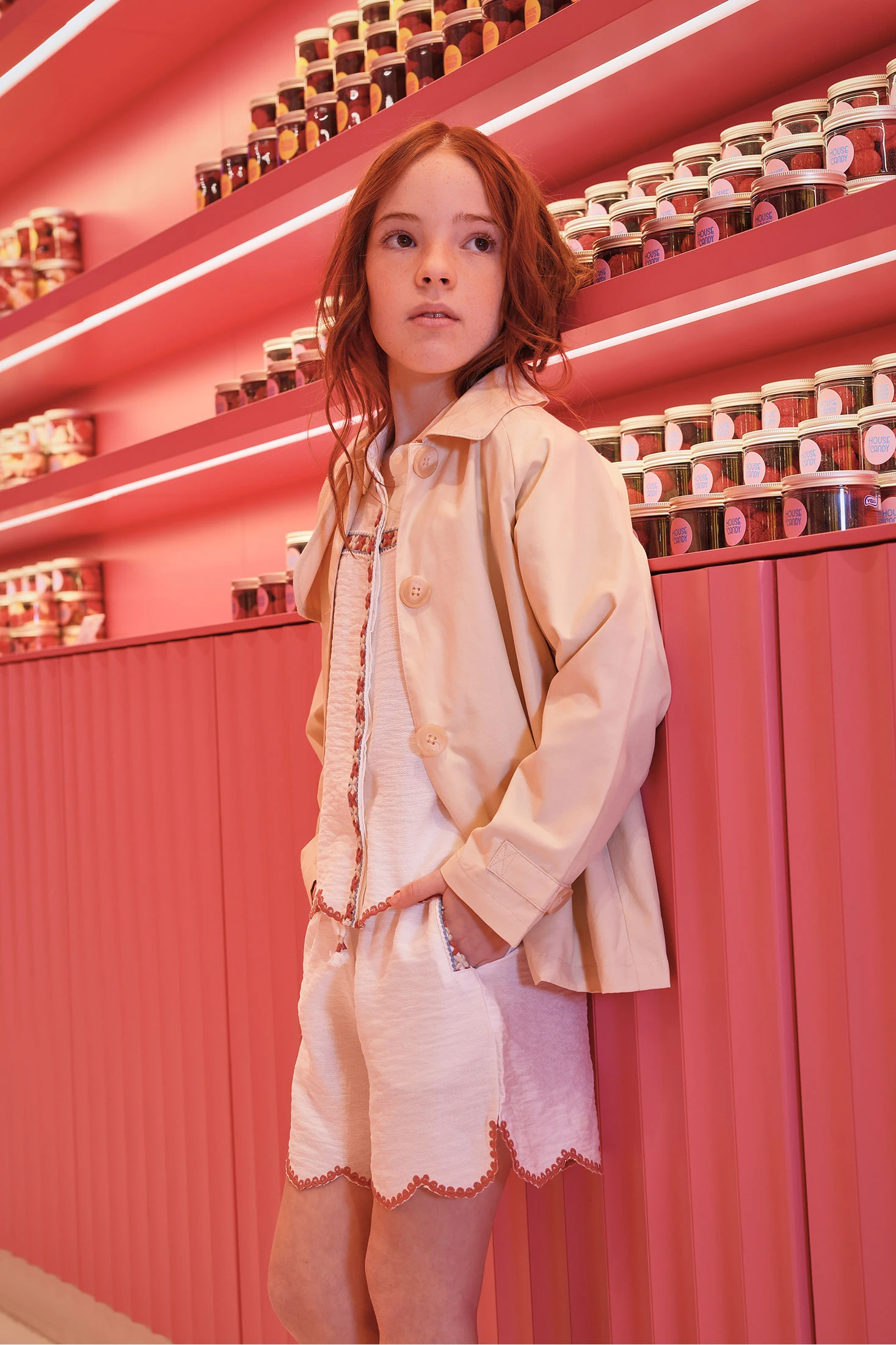 Bermudes blanques de teixit fantasia, ideals per a dies d'estiu, ofereixen comoditat i frescor. Presenten detalls brodats de color als laterals i el voraviu ondulat, que afegeixen un toc divertit i acolorit. El seu disseny funcional inclou una cintura elàstica amb cordó, adaptant-se bé per a nens de 12 mesos a 10 anys. Resulten perfectes per combinar amb samarretes o bruses lleugeres, creant un look fresc i estiuenc, ideal per a activitats a l'aire lliure i moments de joc.