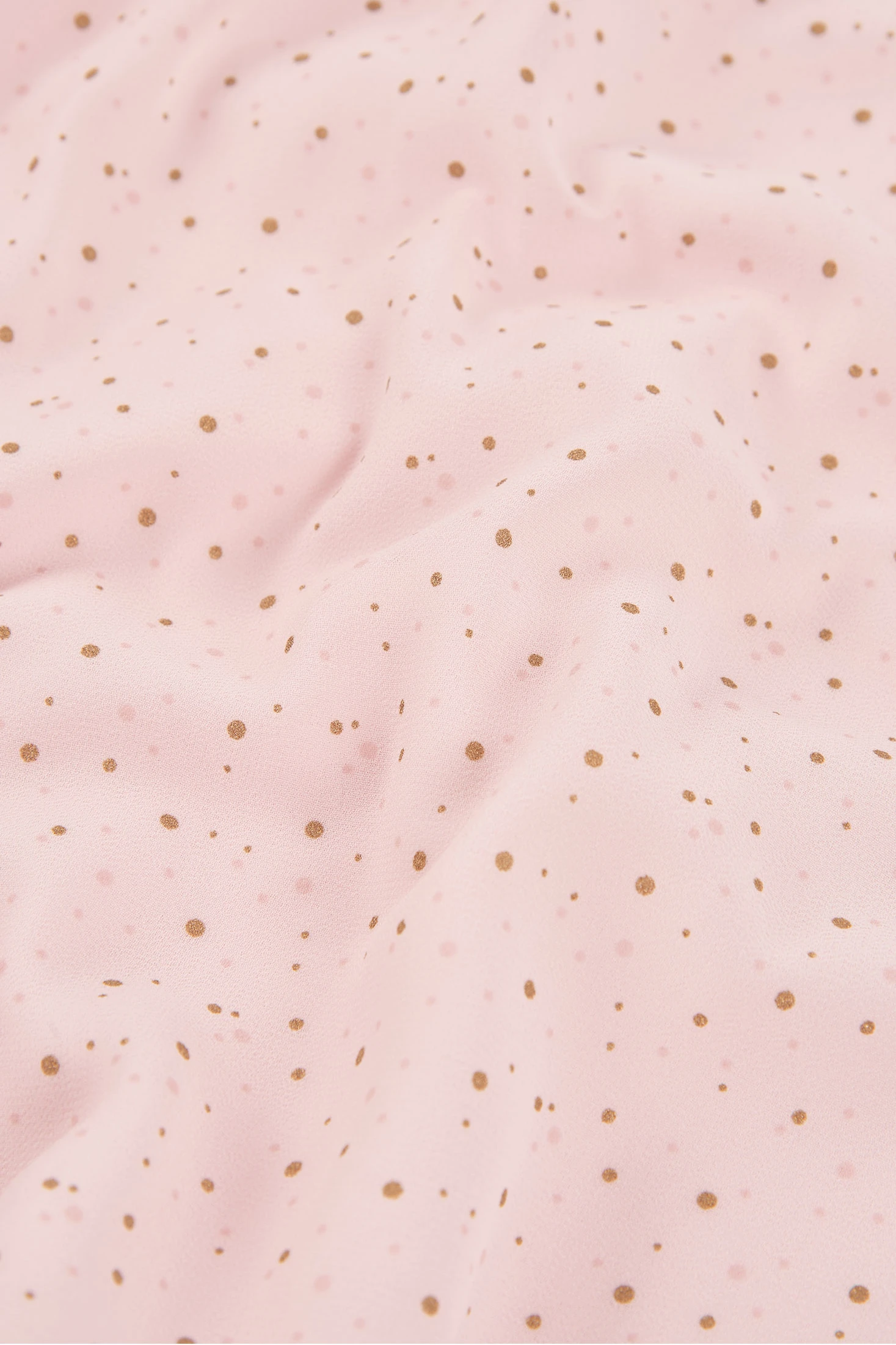 Vestit de gasa estampat perfecte per a nenes de 12 mesos fins a 10 anys. El seu disseny lleuger i fluid en color rosa presenta un delicat estampat de petits punts daurats per tota la peça. Les mànigues curtes amb lleugers volants afegeixen un toc d'elegància ideal per a ocasions especials. Fet d'un material suau i transpirable, garanteix comoditat durant tot el dia. Ideal per combinar amb accessoris senzills i crear un look chic en qualsevol temporada.