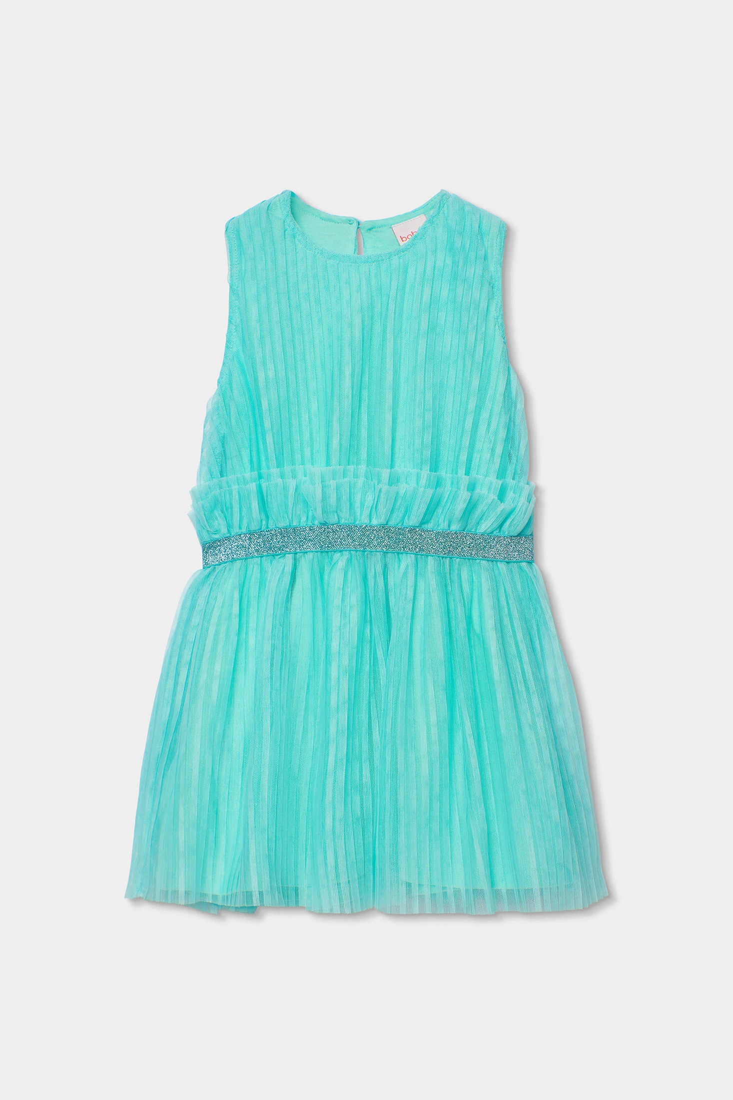 Vestit de tul plisat en color verd turquesa, ideal per a ocasions especials. Fabricat en un material lleuger i còmode, el seu disseny sense mànigues presenta una cintura brillant en color plata que afegeix un toc elegant a la peça. Disponible en talles des dels 12 mesos fins als 10 anys. El teixit permet un moviment lliure, perfecte per mantenir-la còmoda mentre juga o balla. La seva estètica chic el fa combinable amb jaquetes lleugeres o accessoris delicats, convertint-lo en una elecció versàtil i estilosa per a qualsevol esdeveniment.