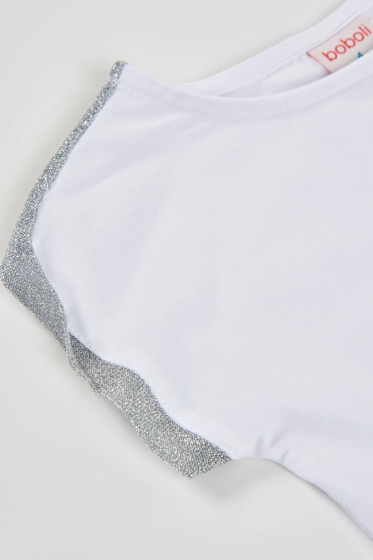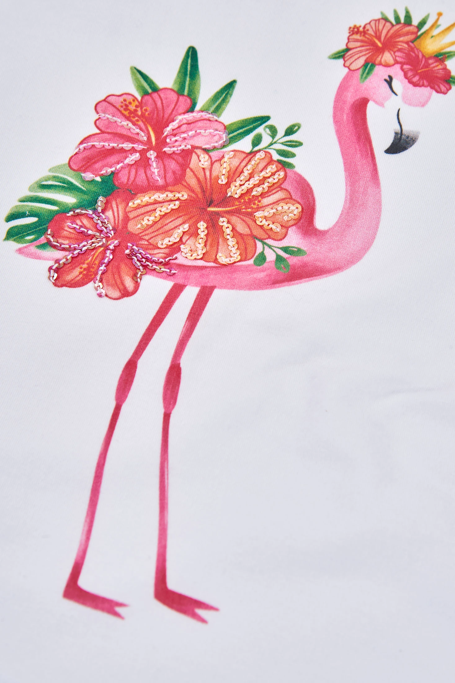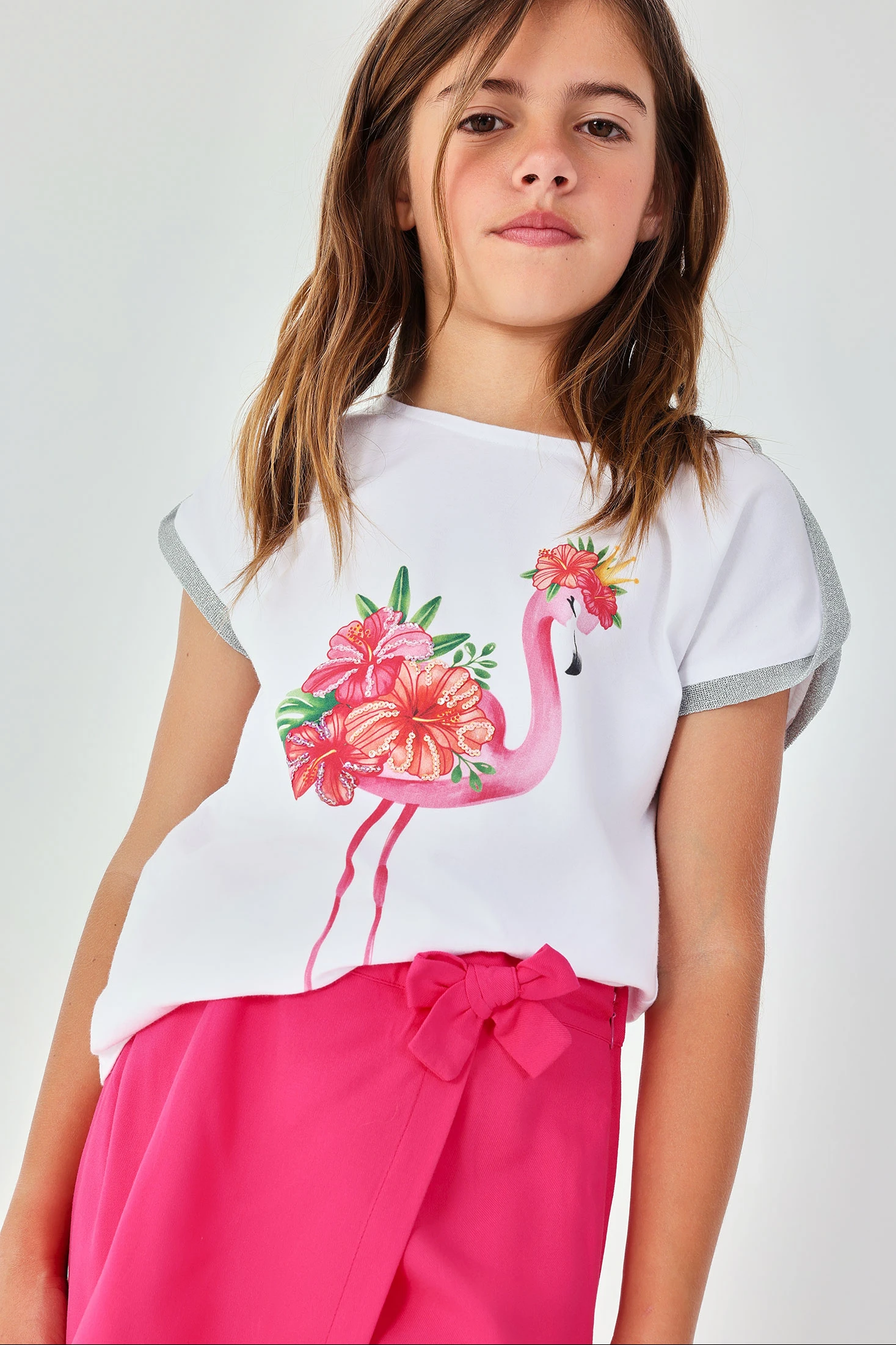 Samarreta de punt de cotó per a nena, ideal per a l'estiu. En color blanc, destaca un divertit disseny d'un flamenc decorat amb flors, que afegeix un toc tropical. El teixit de punt de cotó assegura frescor i comoditat durant tot el dia. Disponible en talles des de 2 anys fins a 14 anys. Les mànigues curtes són perfectes per als dies assolellats. Article perfecte per combinar amb shorts o faldilles, oferint un look casual i alegre per a qualsevol ocasió d'estiu.