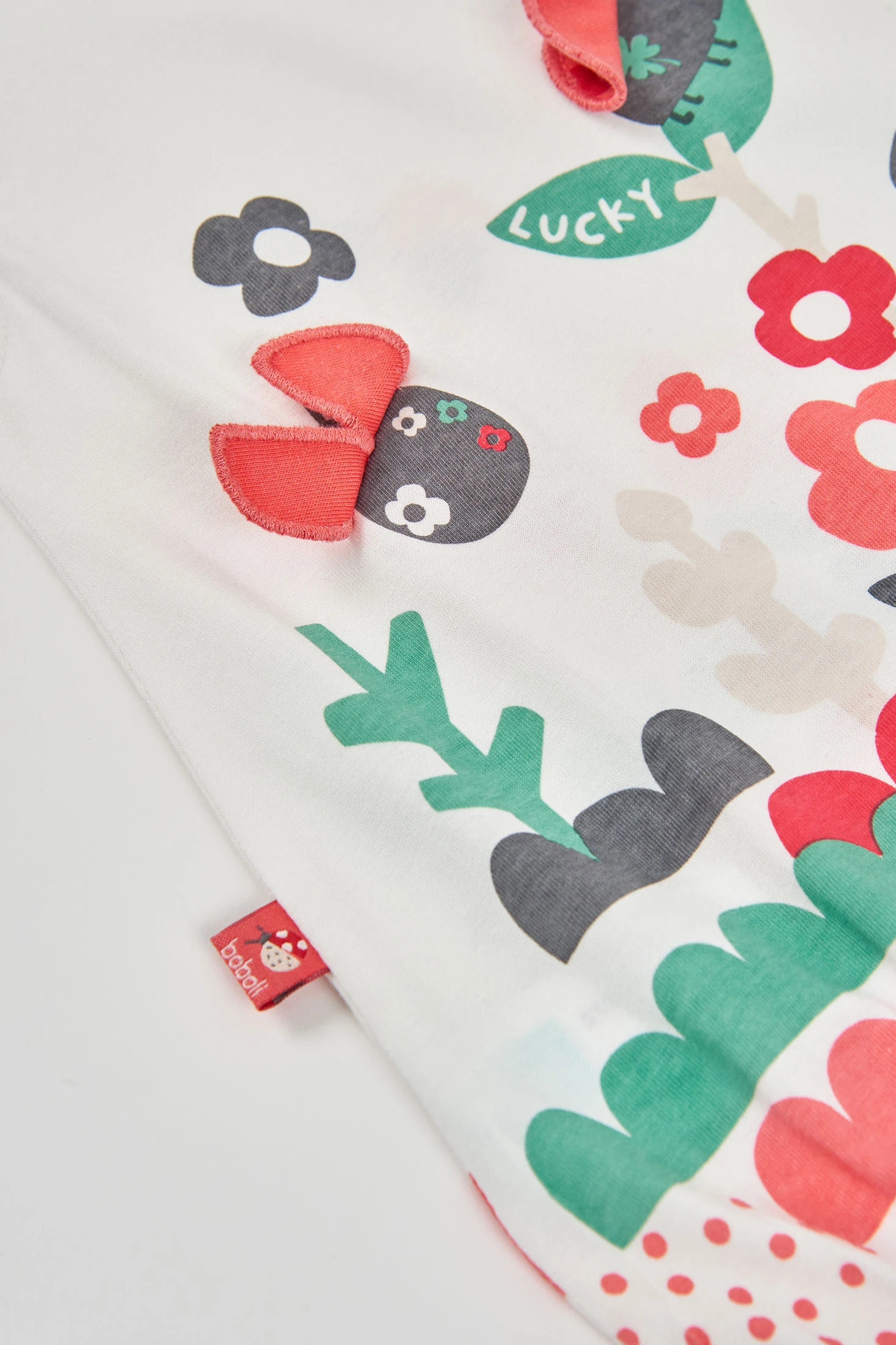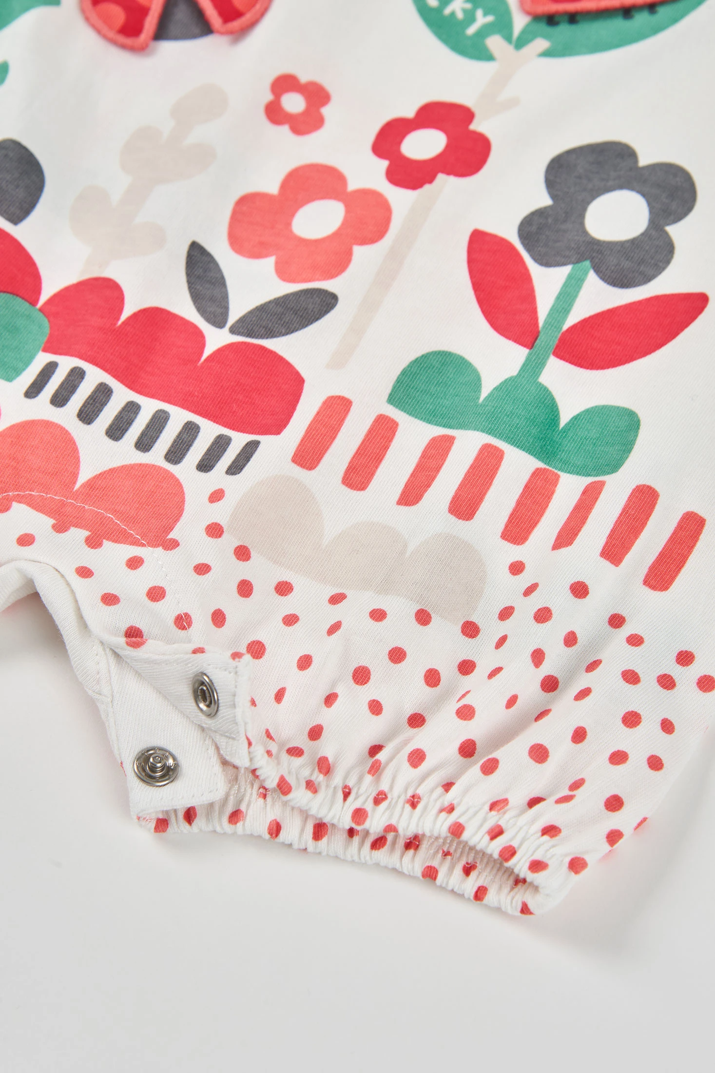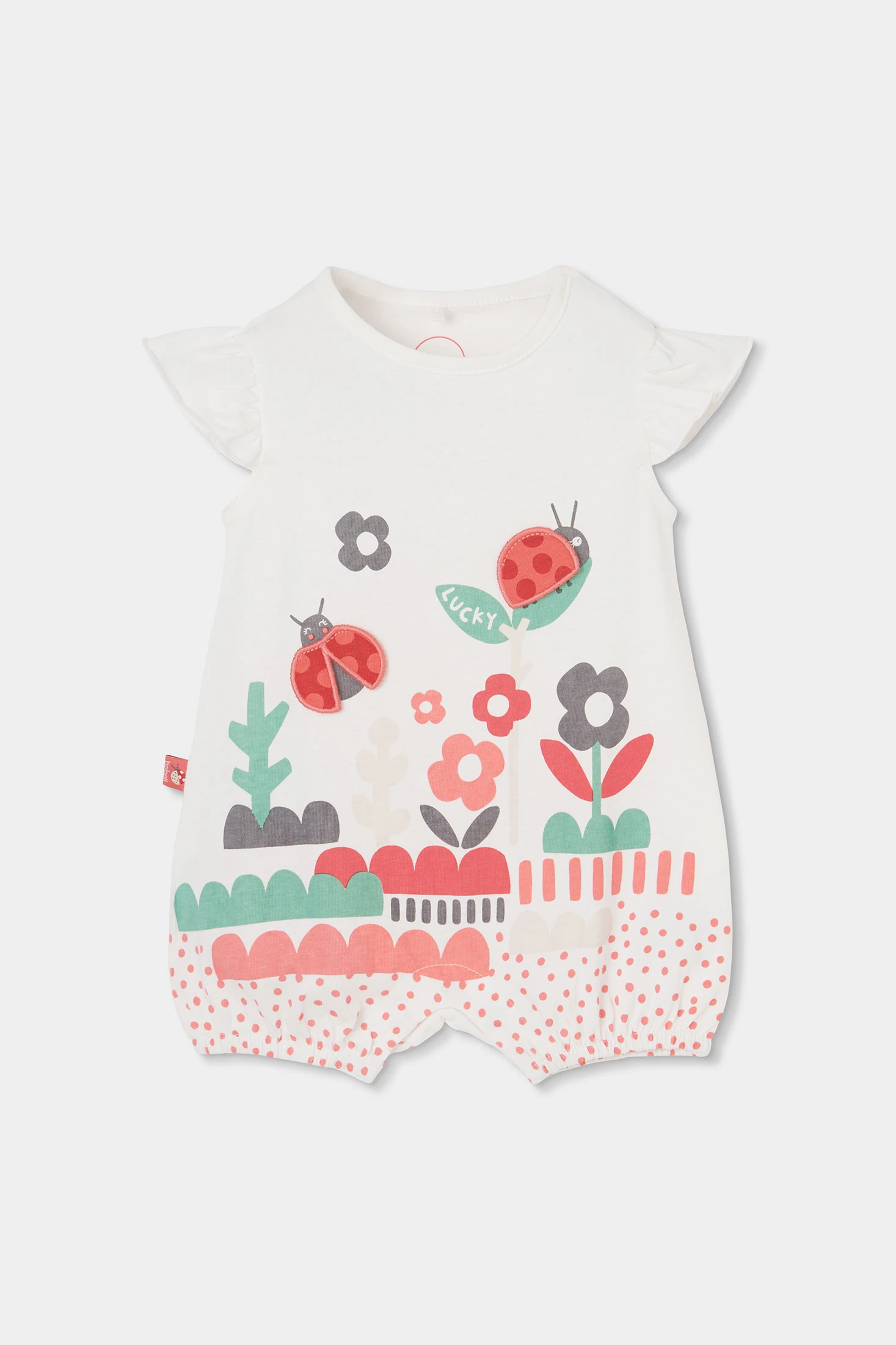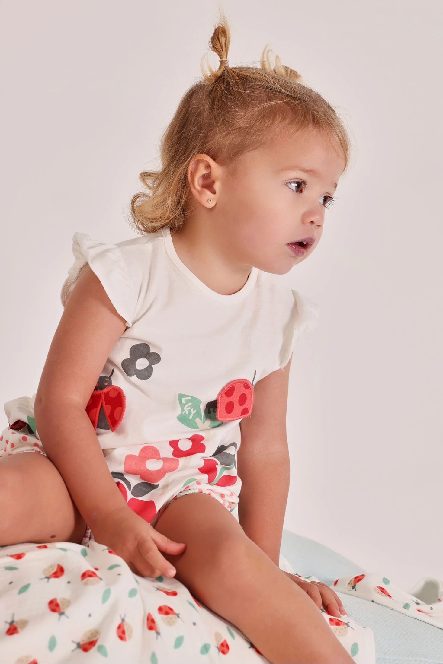 Pelele blanco de punto de algodón para bebe niña, disponible en tallas desde la 0 meses hasta 24 meses. El diseño presenta adorables mariquitas y flores, aportando un toque alegre y divertido. Las mangas cortas con ligero vuelo añaden un detalle encantador mientras que el cierre práctico facilita el cambio de pañales. Perfecto para mantener a tu bebé fresco y cómodo durante el día.